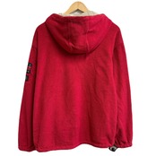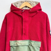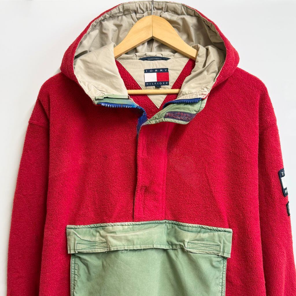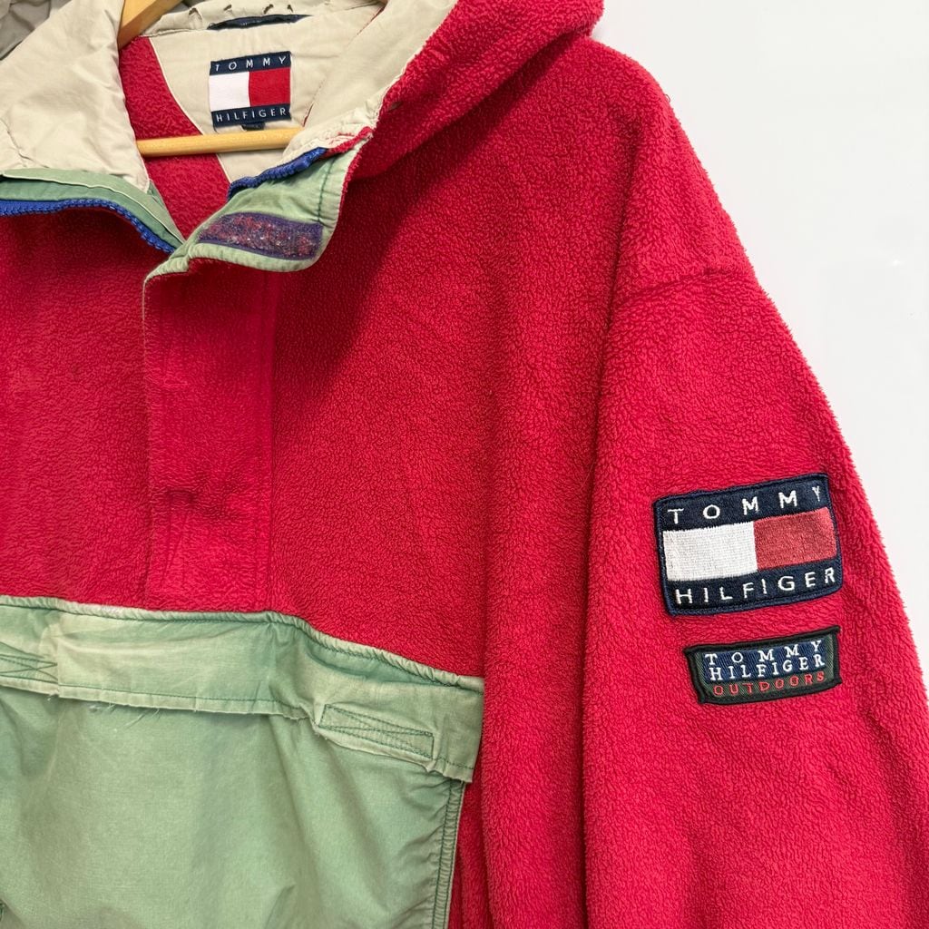 TOMMY HILFIGER トミーヒルフィガー フリースアノラックパーカー ハーフジップ 切り替えデザイン ワンポイントロゴ 刺繍 赤×カーキ Mサイズ No.H635