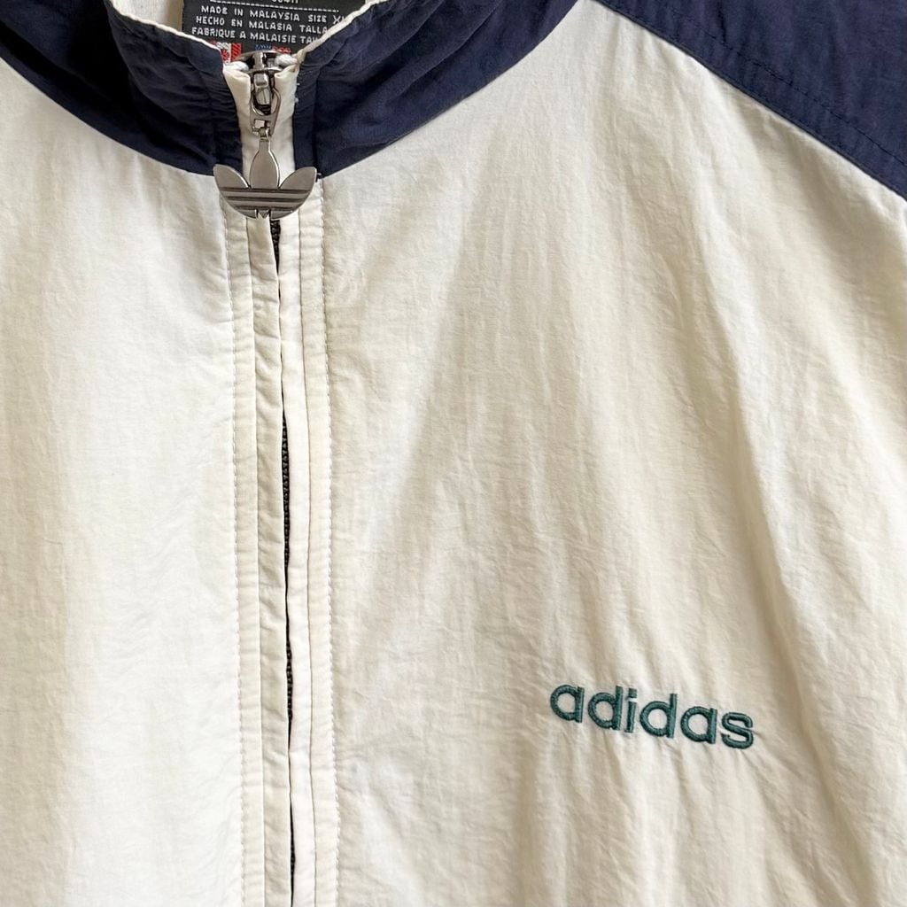 adidas アディダス トレフォイル 刺繍 ナイロンジャケット フルジップ ポケット付き アイボリー×紺×緑 XLサイズ No.H674