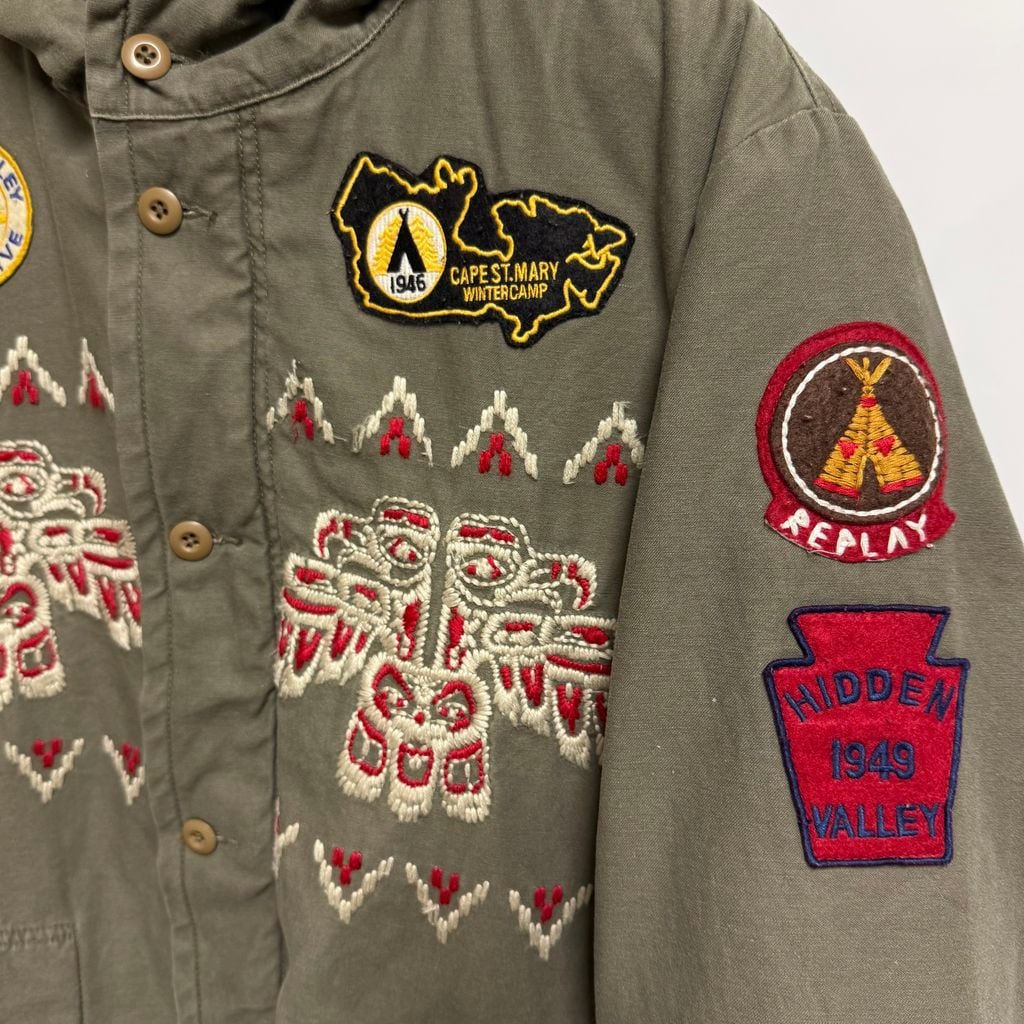 REPLAY フーデッドジャケット コットンジャケット トーテルポーム 先住民 刺繍 ワッペン フルジップ ポケット付き カーキ Mサイズ No.H767