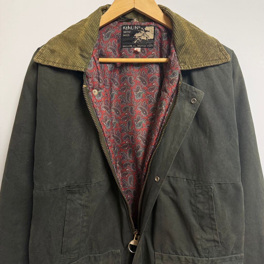 KENLIN オイルドジャケット 裏地ペイズリー柄 襟コーデュロイ フルジップ ポケット付き カーキ Sサイズ No.H843