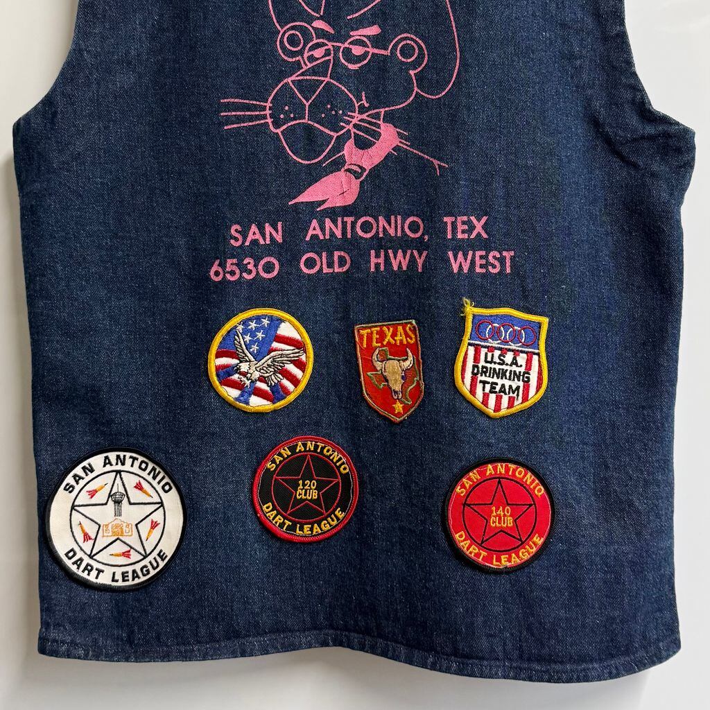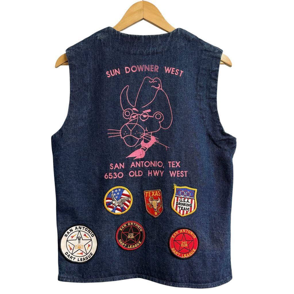 SUN DOWNER WEST デニムベスト ピンクパンサー パッチ ワッペン ダーツリーグ テキサス 青 ブルー No.H847