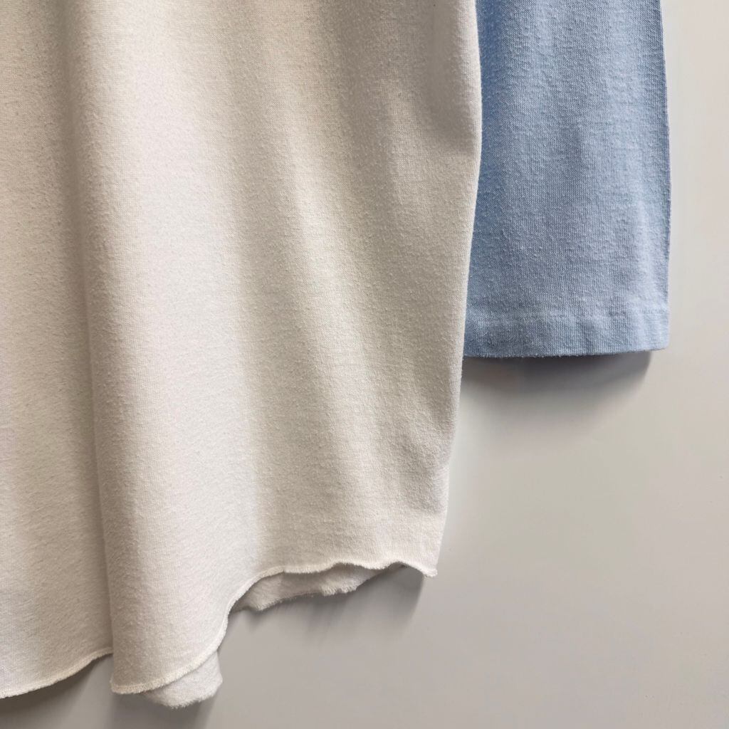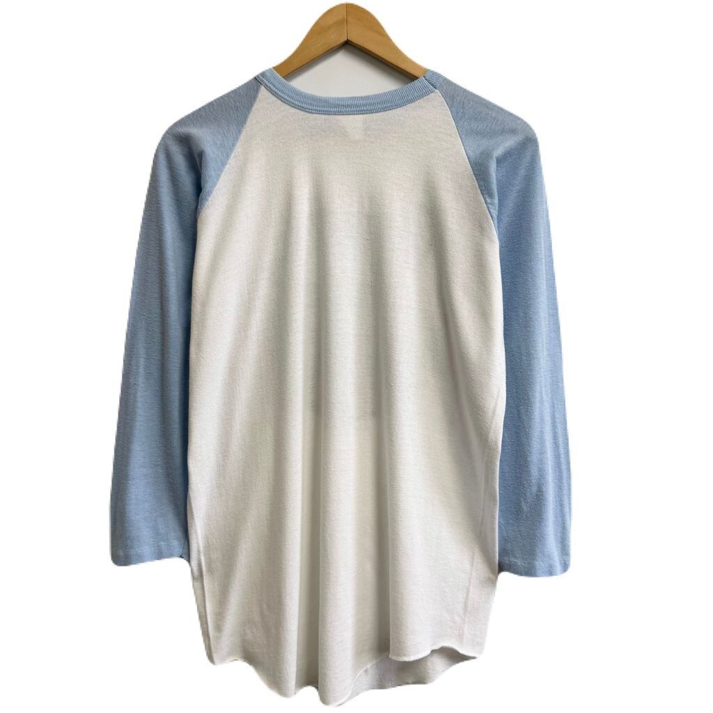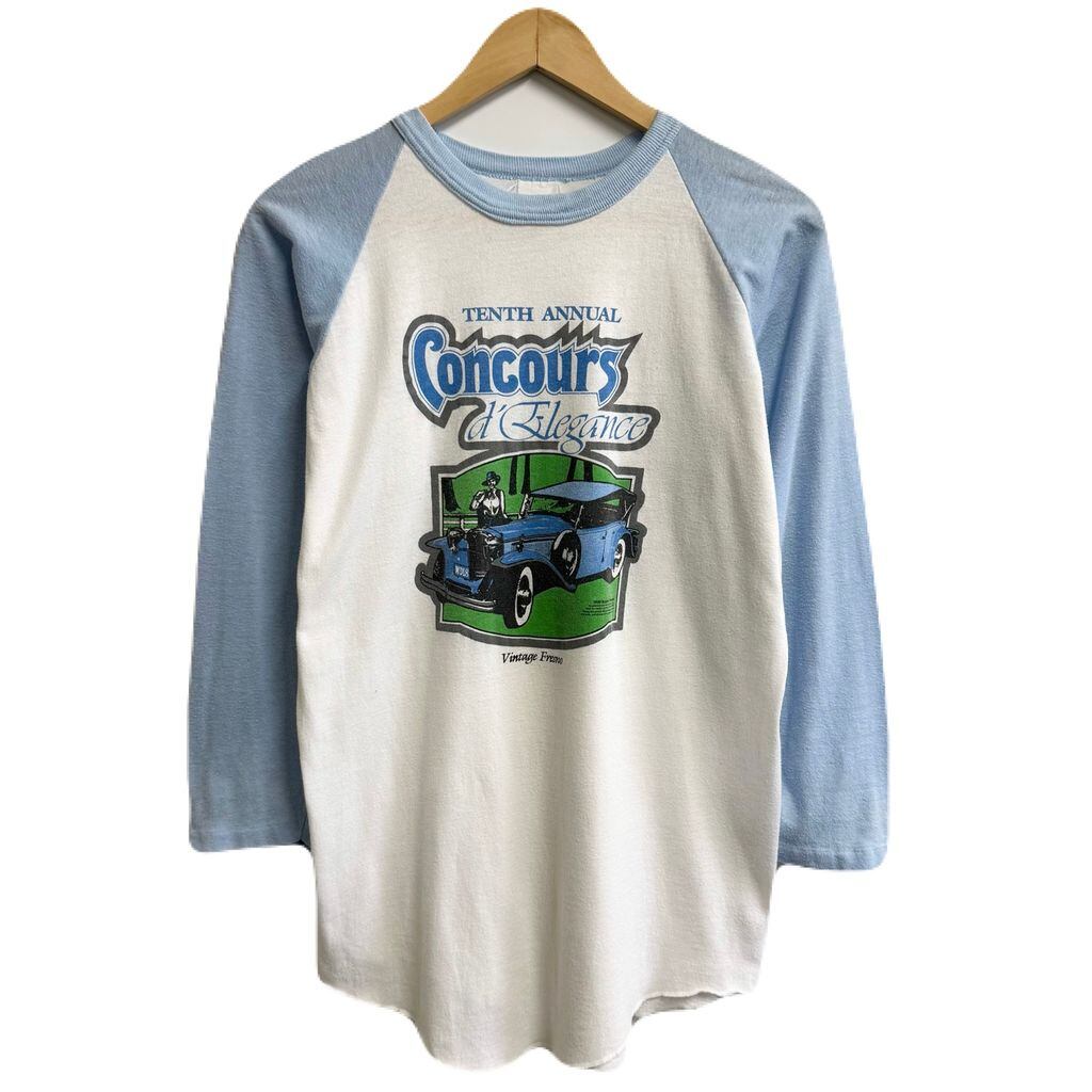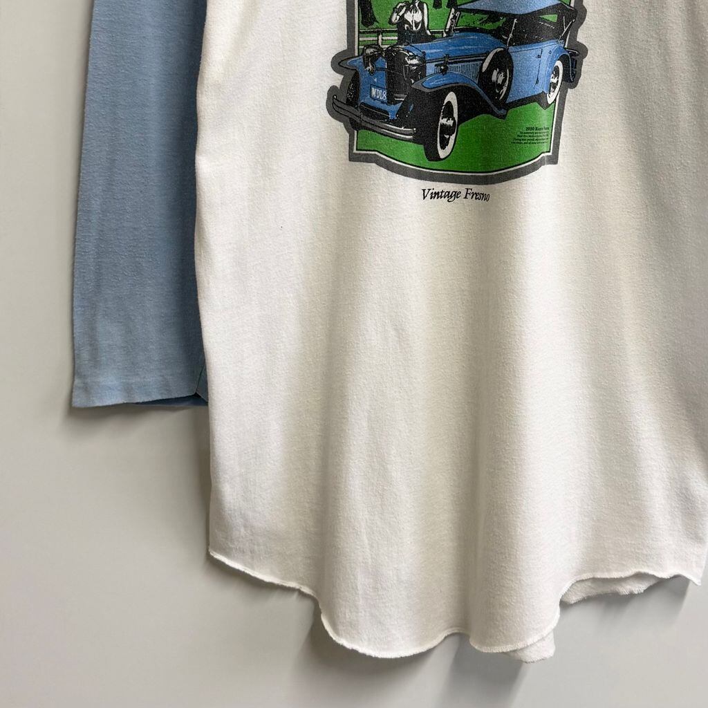 フロントプリント ビンテージカー 車 car ラグランスリーブ ベースボールTシャツ シングルステッチ 白×水色 No.L186