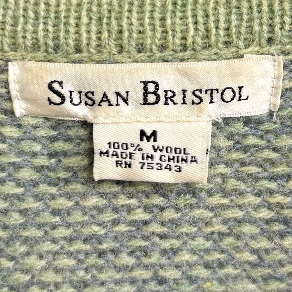 SUSAN BRISTOL ノルディック柄 ウールカーディガン フェアアイル柄 メタルフック 黄緑×ブルーグレー×白 Mサイズ No.L342