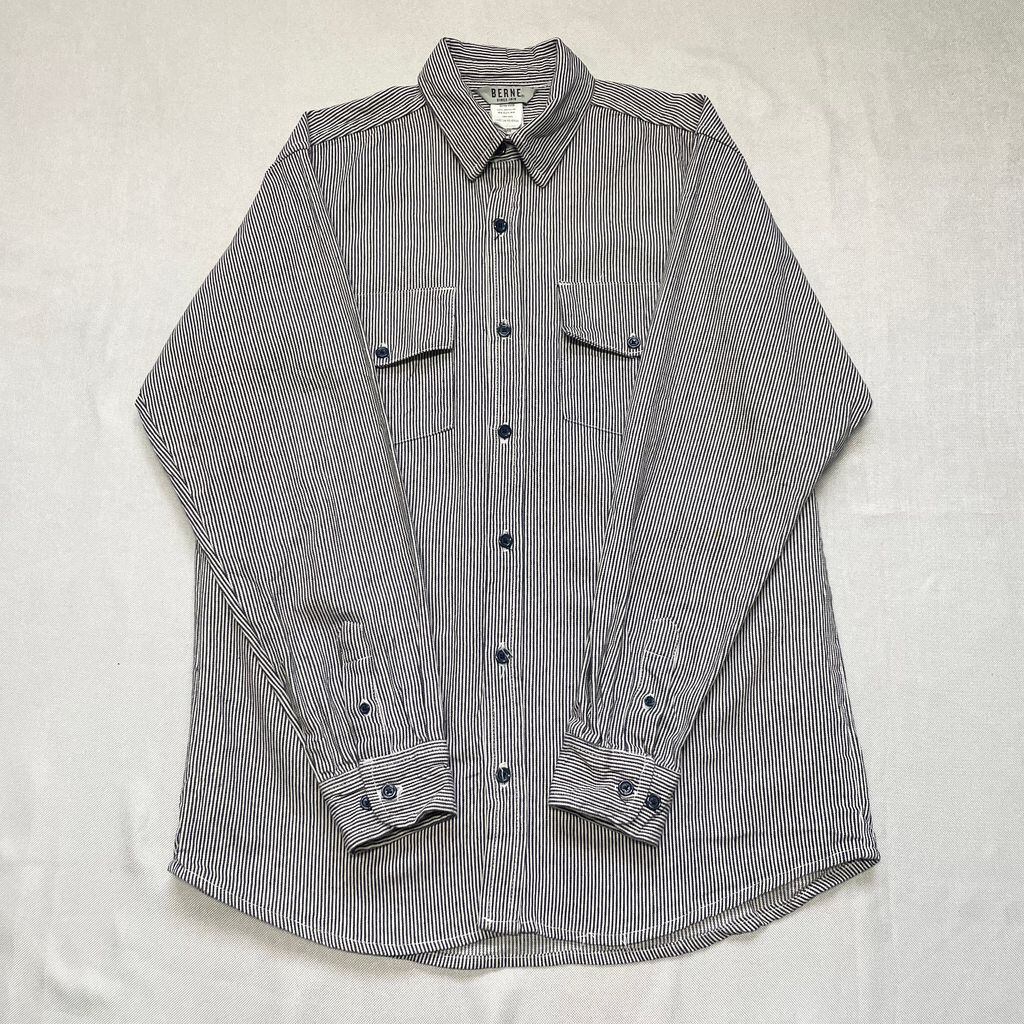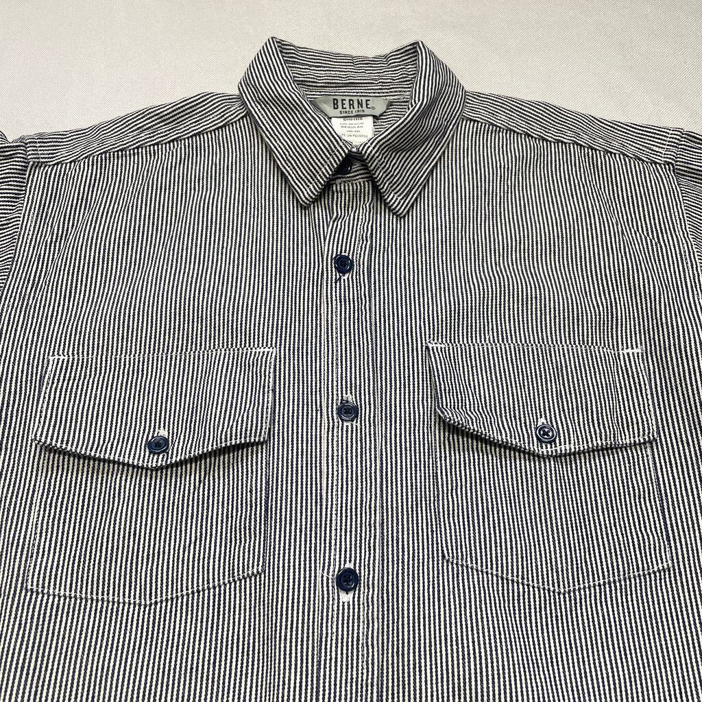 BERNE コットンシャツ ストライプ シャツジャケット ポケット付き 長袖シャツ 紺×白 Mサイズ No.F582