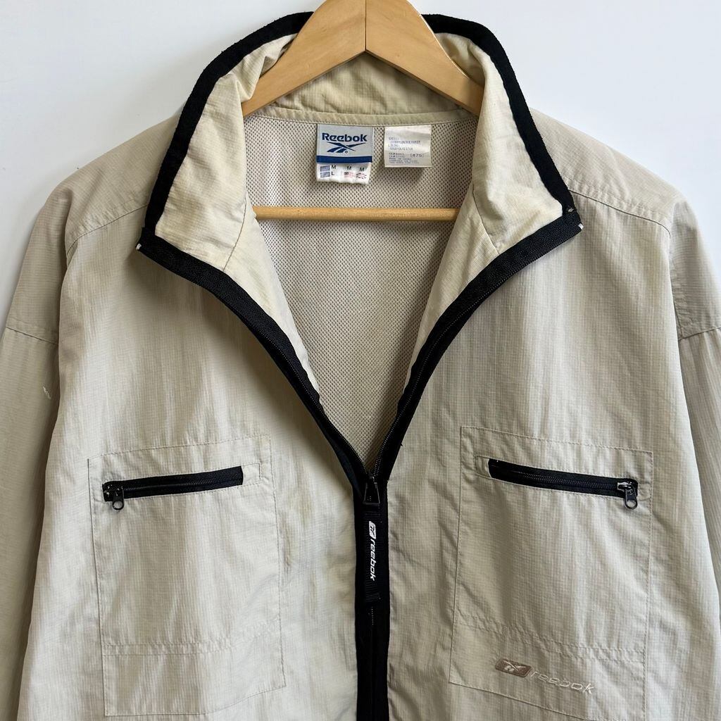 Reebok リーボック ナイロンジャケット ウィンドブレーカー 裏地メッシュ フルジップ ポケット付き ベージュ Lサイズ No.L576