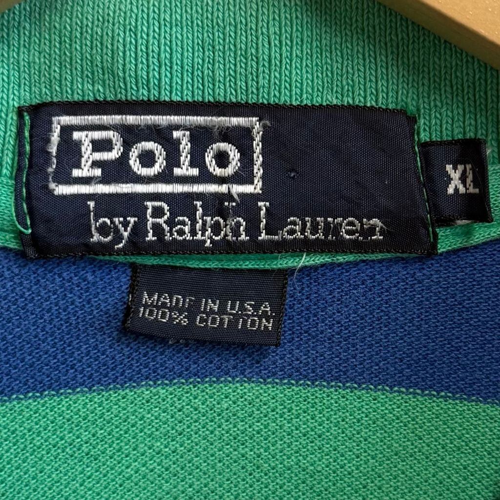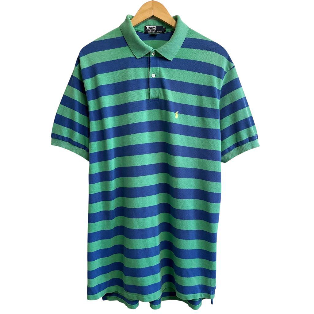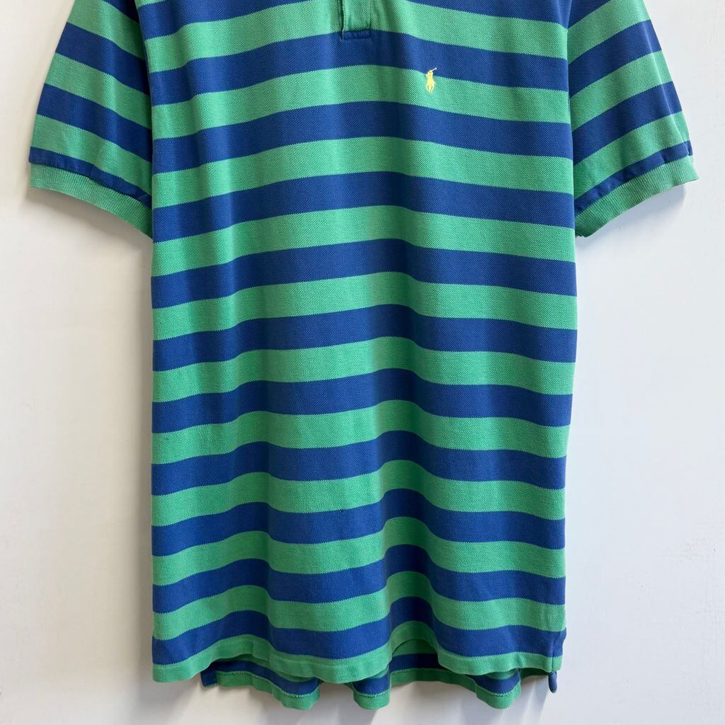 USA製 Polo Ralph Lauren ポロ ラルフローレン ポロシャツ 半袖 ボーダー ワンポイントロゴ 刺繍 グリーン×ブルー XLサイズ No.L715