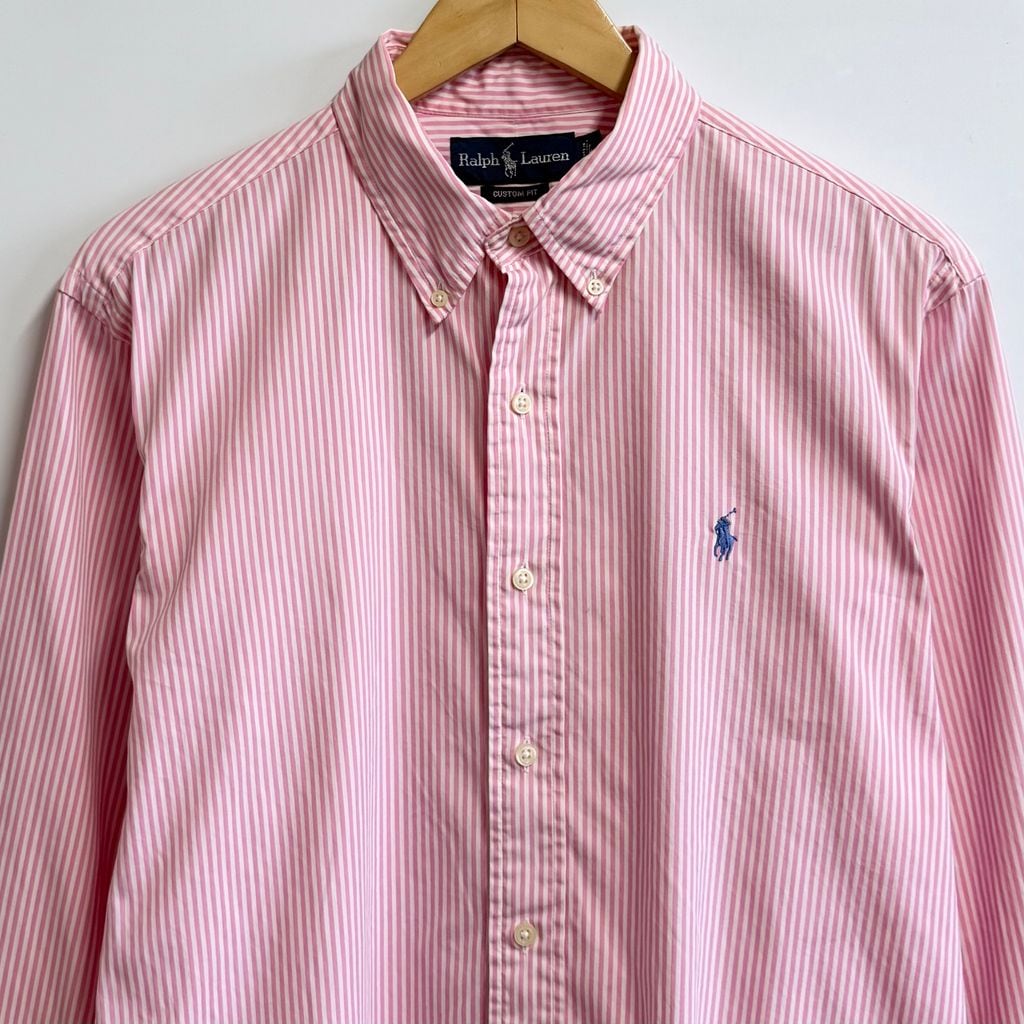 Ralph Lauren ラルフローレン CUSTOM FIT ボタンダウンシャツ コットンシャツ ストライプ 長袖シャツ ワンポイントロゴ 刺繍 ピンク×白 Lサイズ No.L800