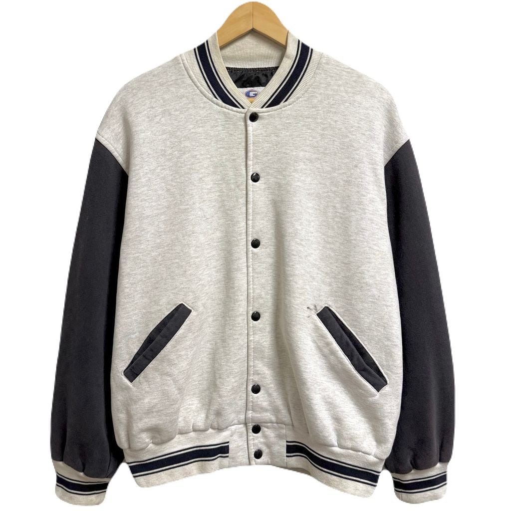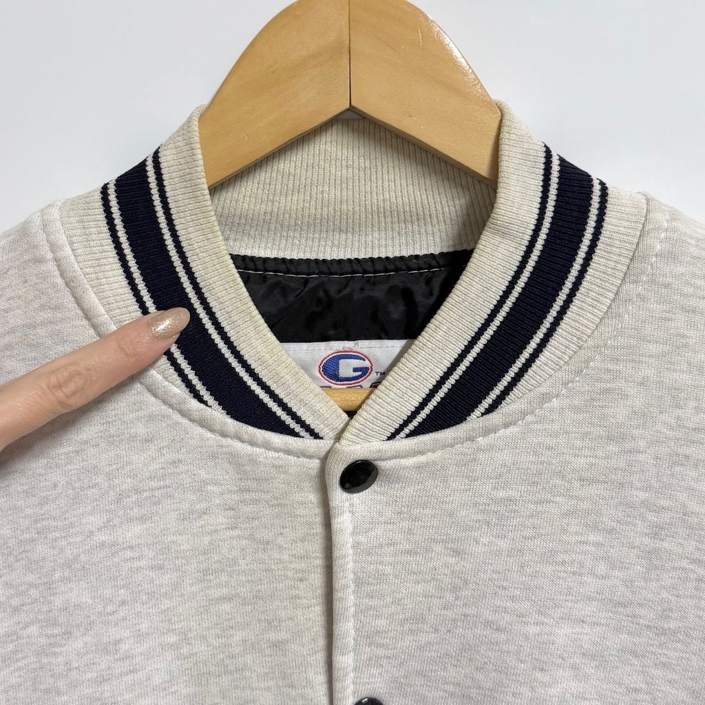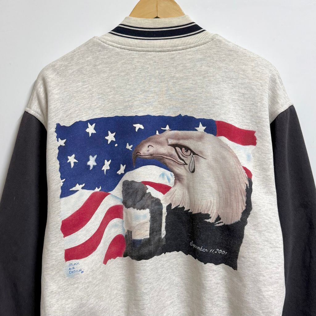USA製 GAME Sportswear 9.11 白頭ワシ 星条旗 バックプリント スウェットスタジャン スナップボタン ライトグレー×ネイビー No.L820