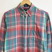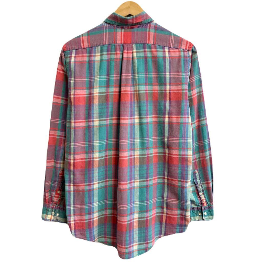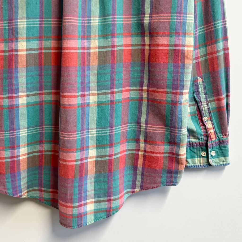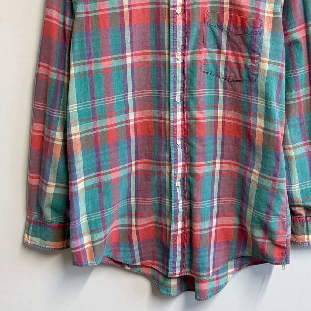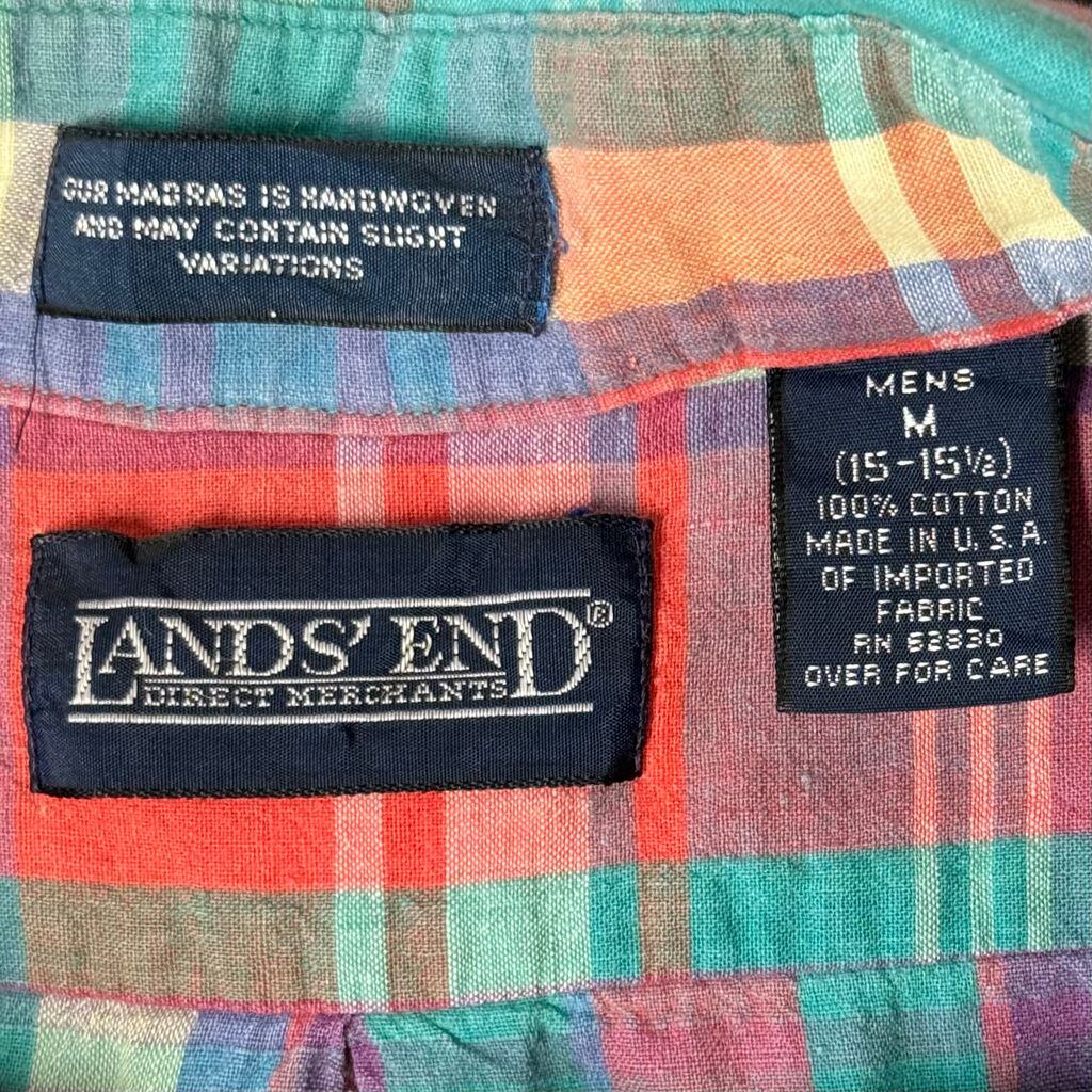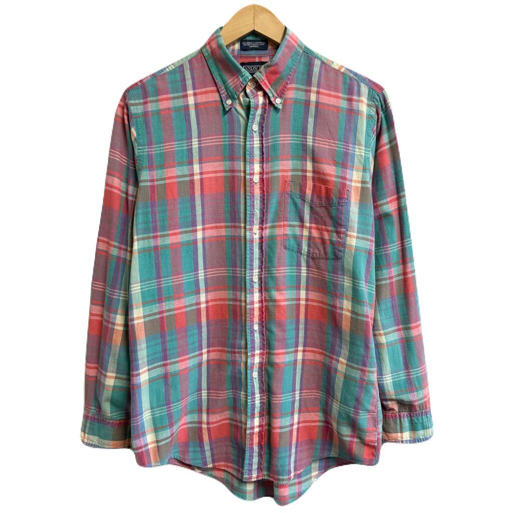 USA製 LAND'S END ランズエンド ボタンダウンシャツ コットンシャツ チェック柄 ポケット付き 長袖シャツ カラフル グリーン×オレンジ×多色 Mサイズ No.L852