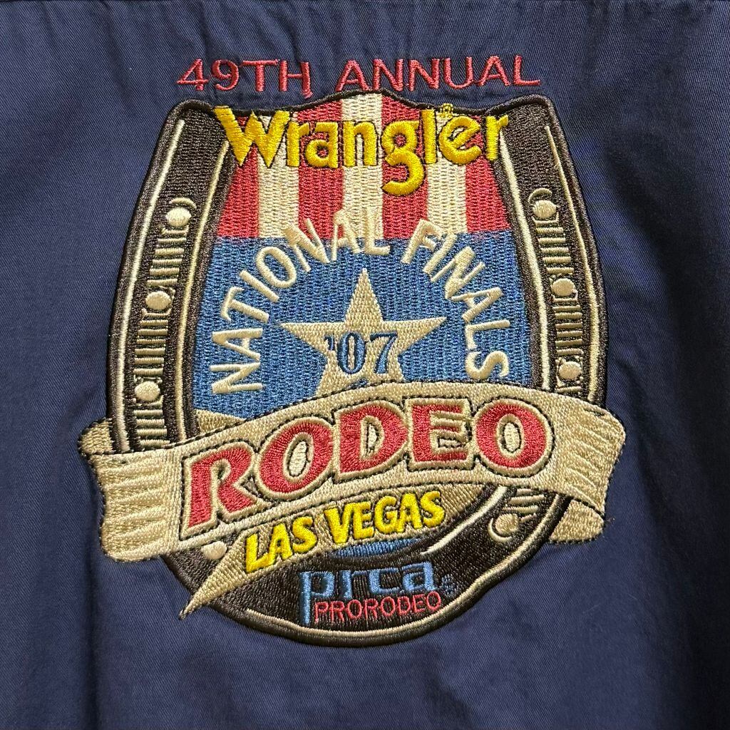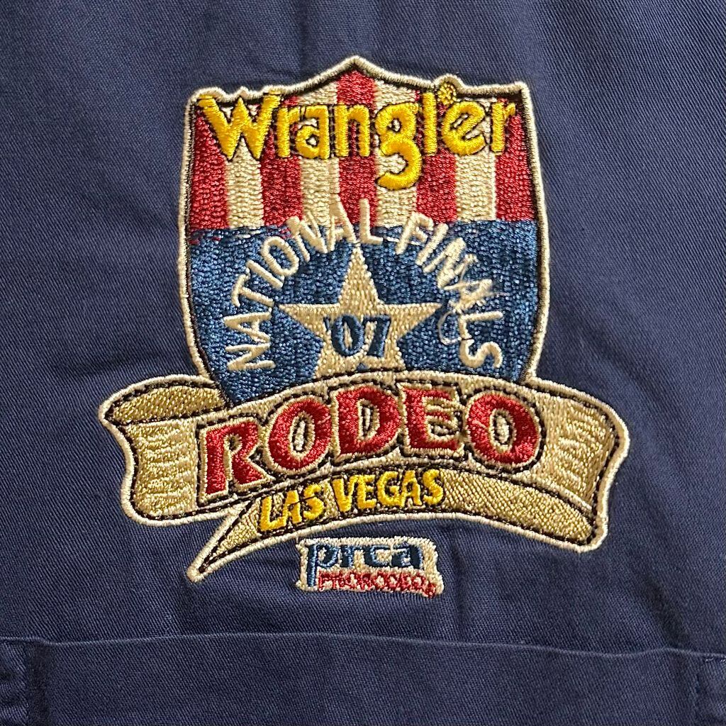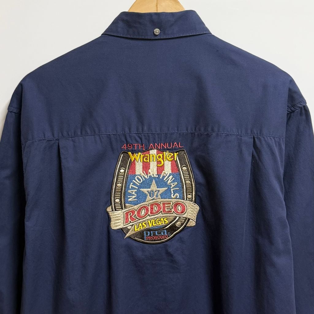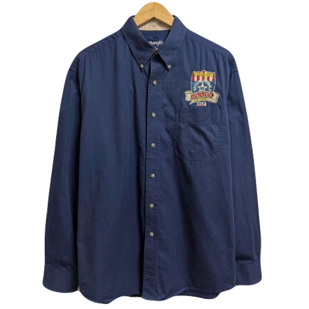 Wrangler ラングラー national finals rodeo ナショナル ファイナルズ ロデオ 2007 ロゴワッペン ボタンダウンシャツ コットンシャツ ポケット付き 長袖シャツ 紺 ネイビー L/Gサイズ No.L884