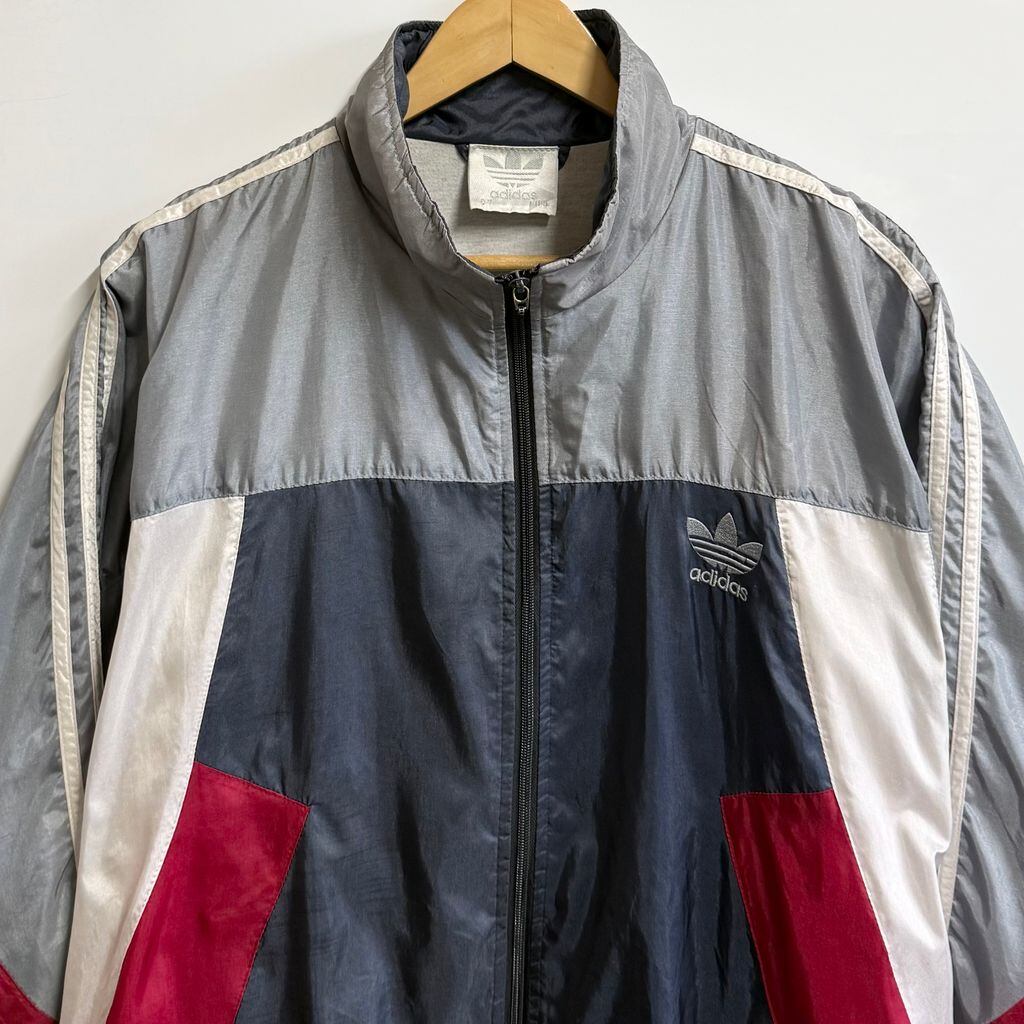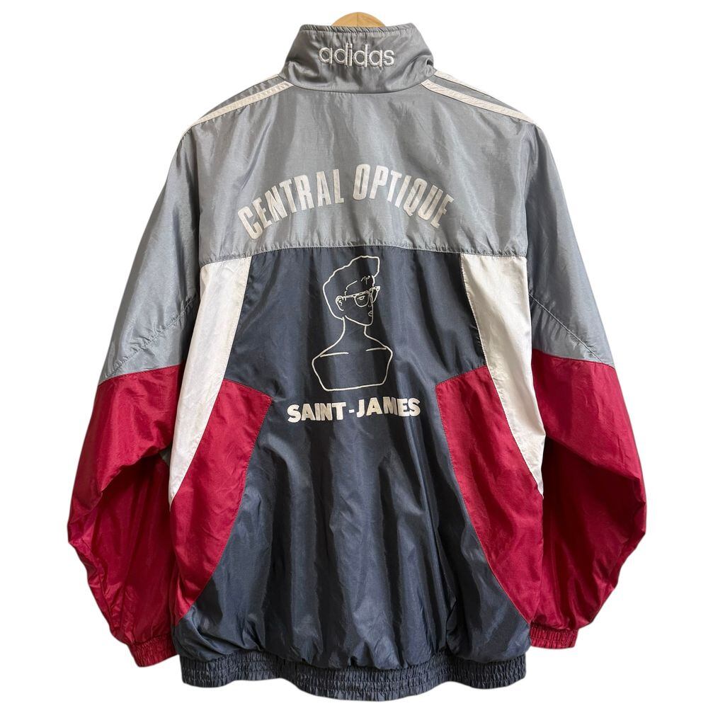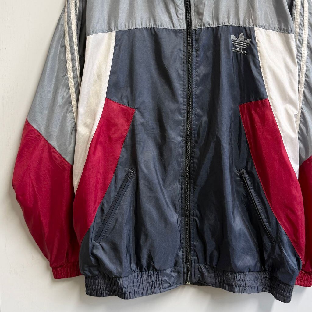 adidas アディダス フラッグタグ トレフォイル 刺繍 ナイロンジャケット セントジェームス シルバーグレー×白×紺×赤 Lサイズ No.L894