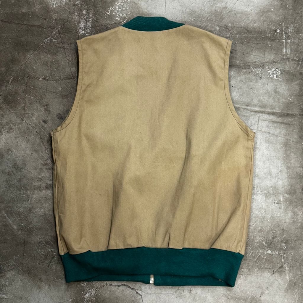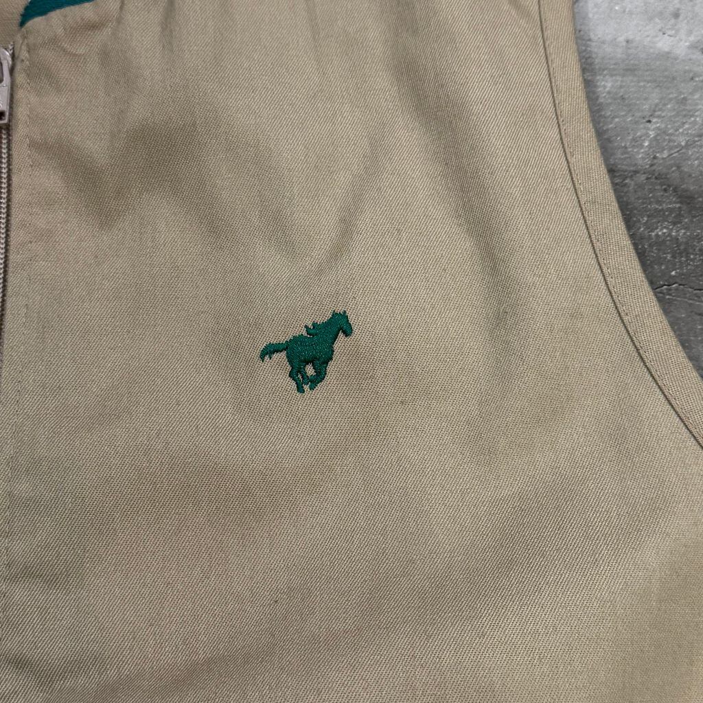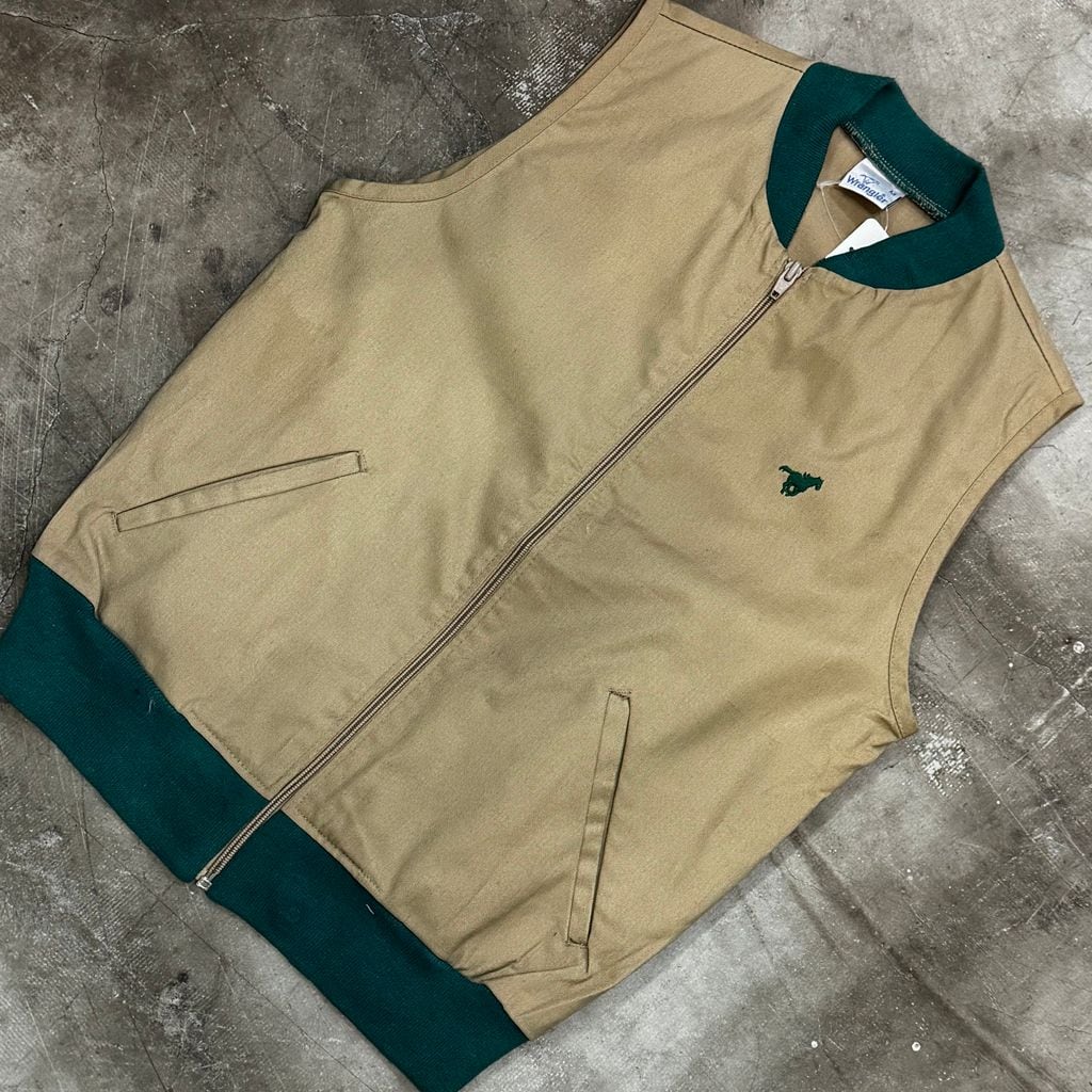 USA製 80s Wrangler ラングラー ベスト 刺繍ロゴ ポケット付き ベージュ×グリーン Mサイズ No.EA28