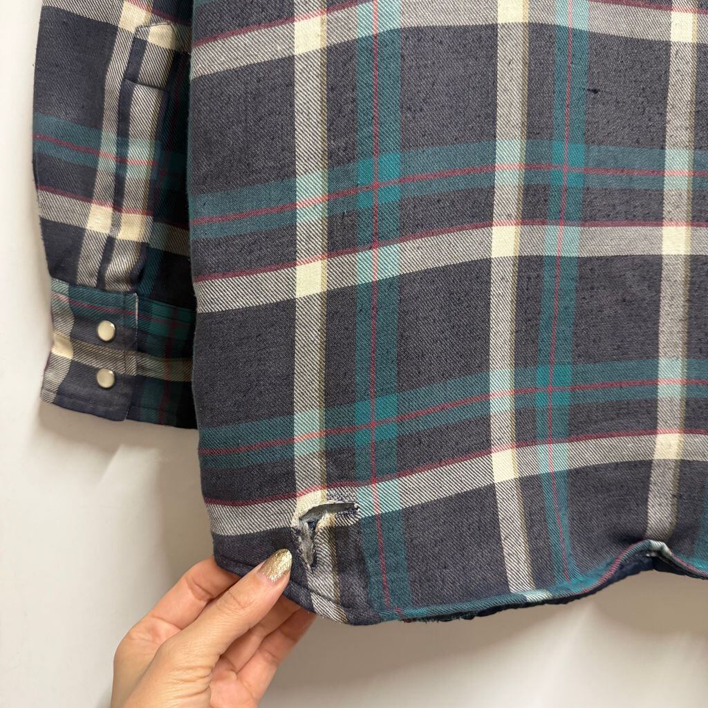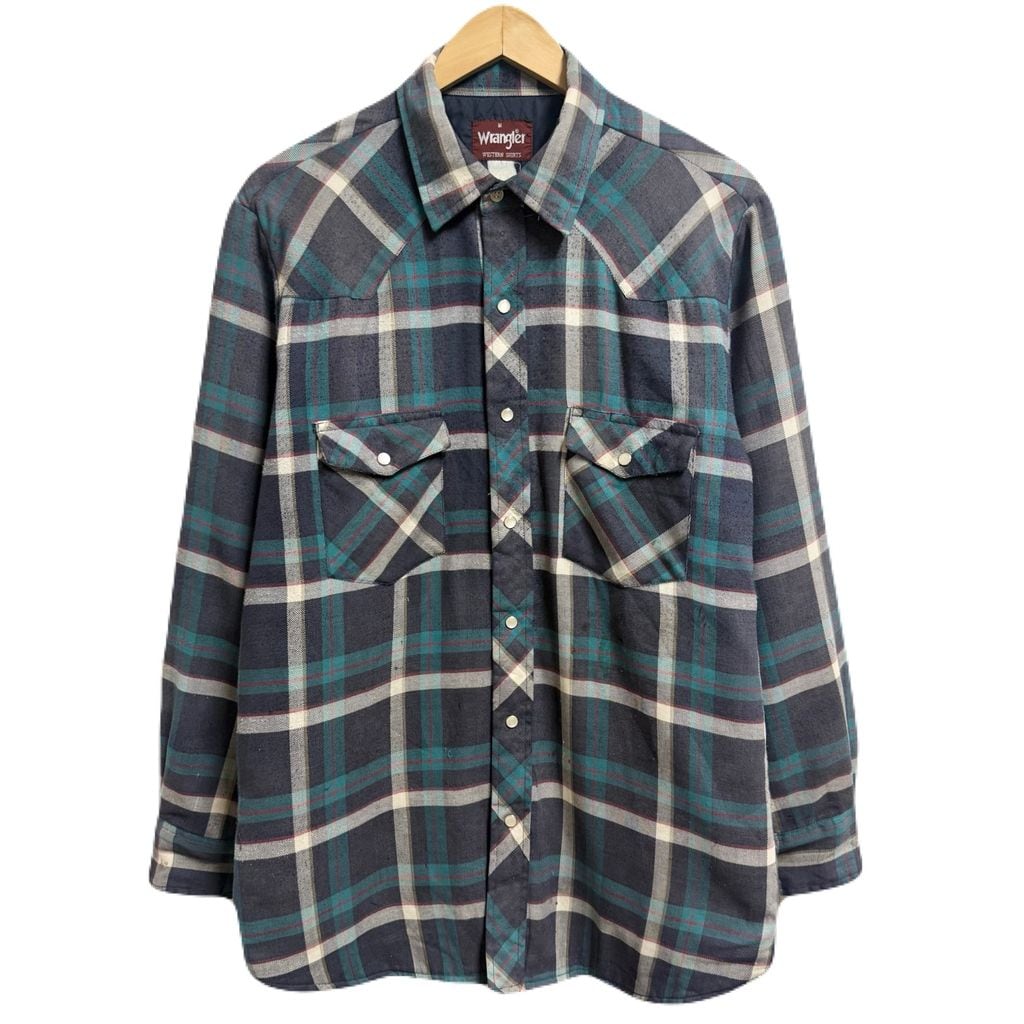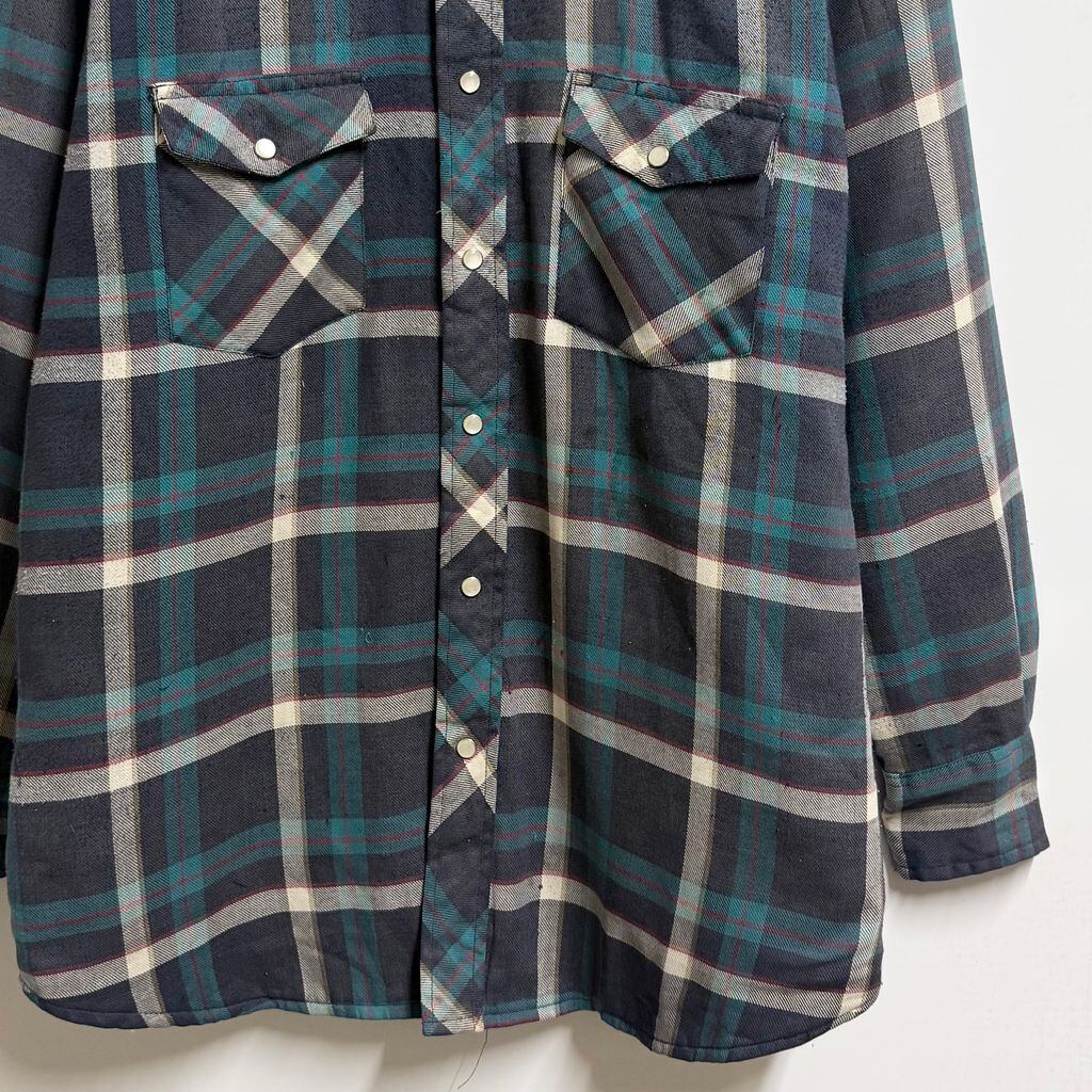 Wrangler ラングラー WESTERN SHIRTS シャツジャケット キルティング裏地 ウエスタンシャツ スナップボタン チェック柄 ポケット付き 厚手長袖シャツ 紺×白×エメラルドグリーン×多色 Mサイズ No.M038