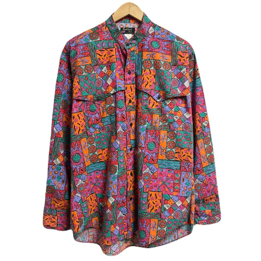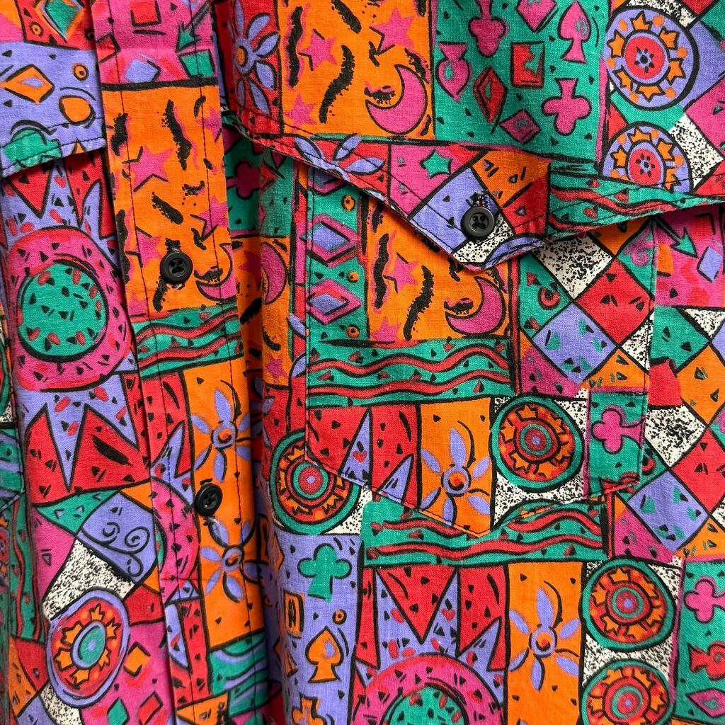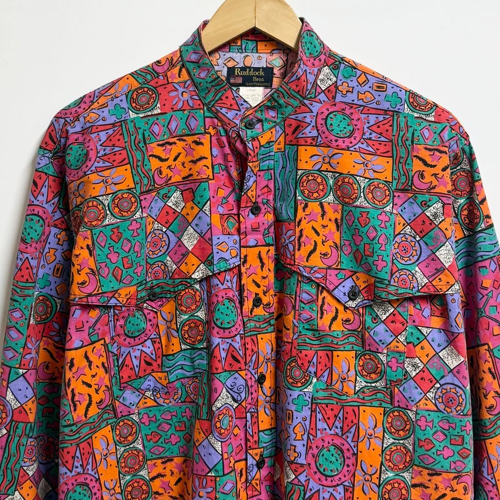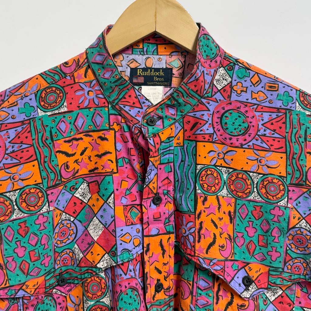USA製 Ruddock Bros バンドカラー アート 総柄 柄シャツ コットンシャツ ポケット付き 長袖シャツ カラフル 多色 Lサイズ No.M040