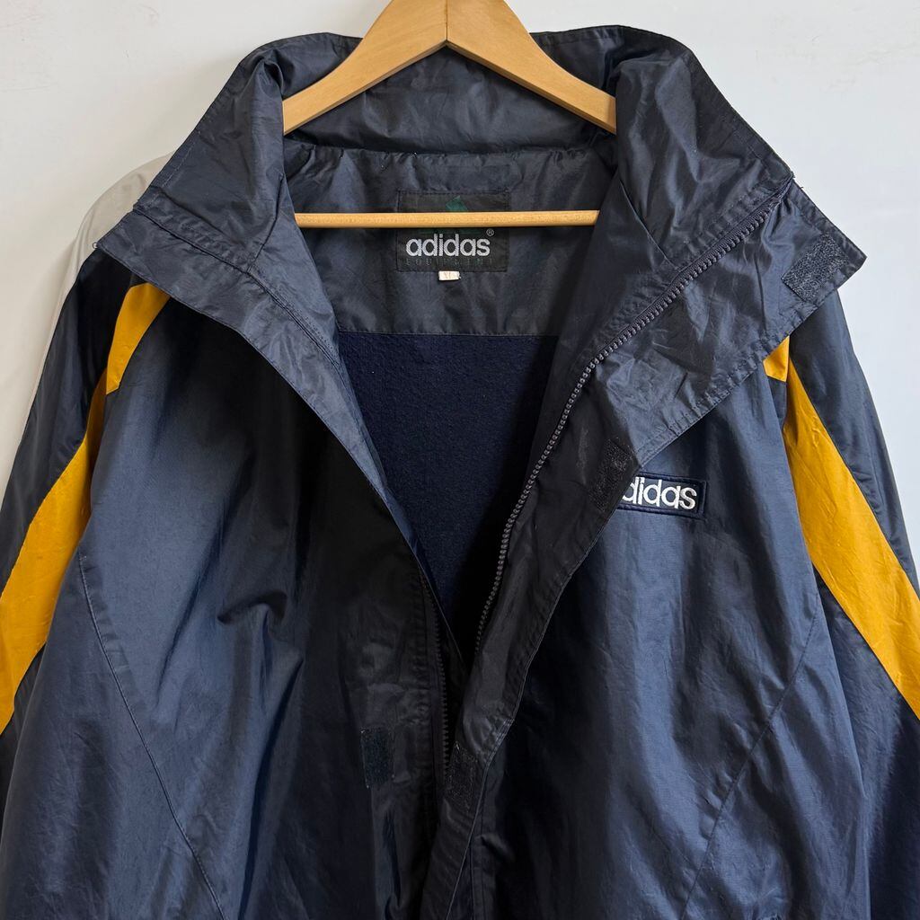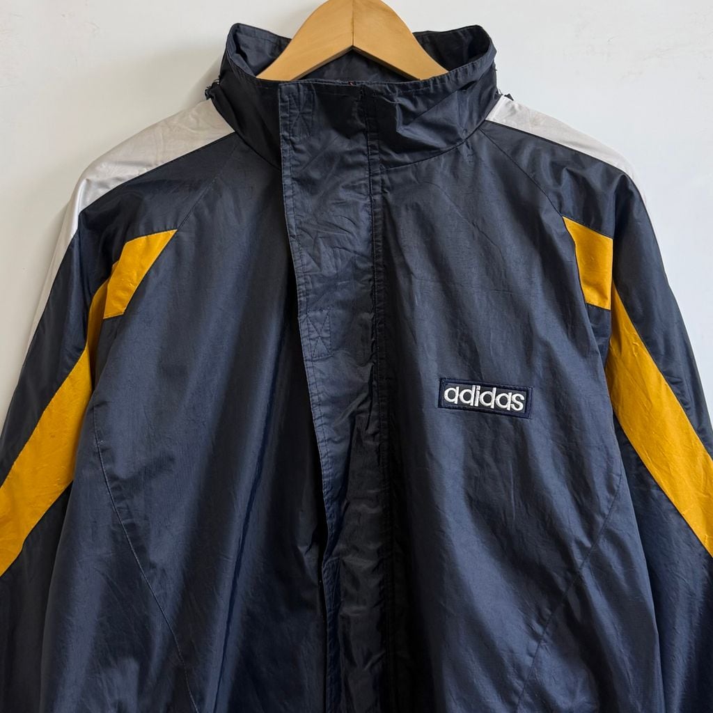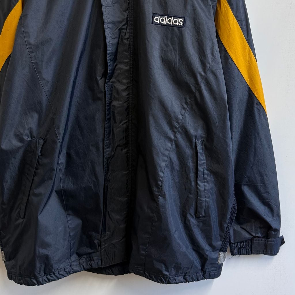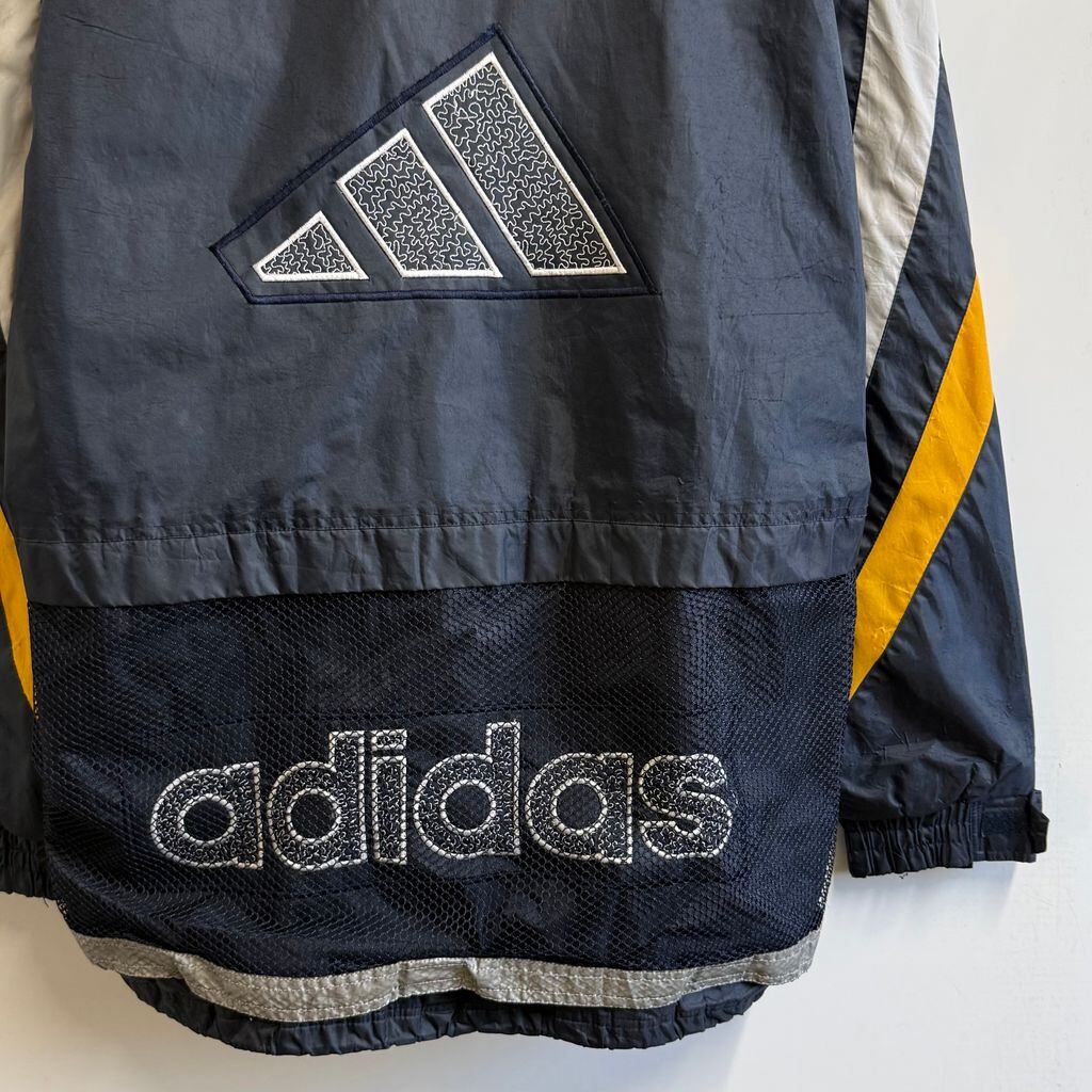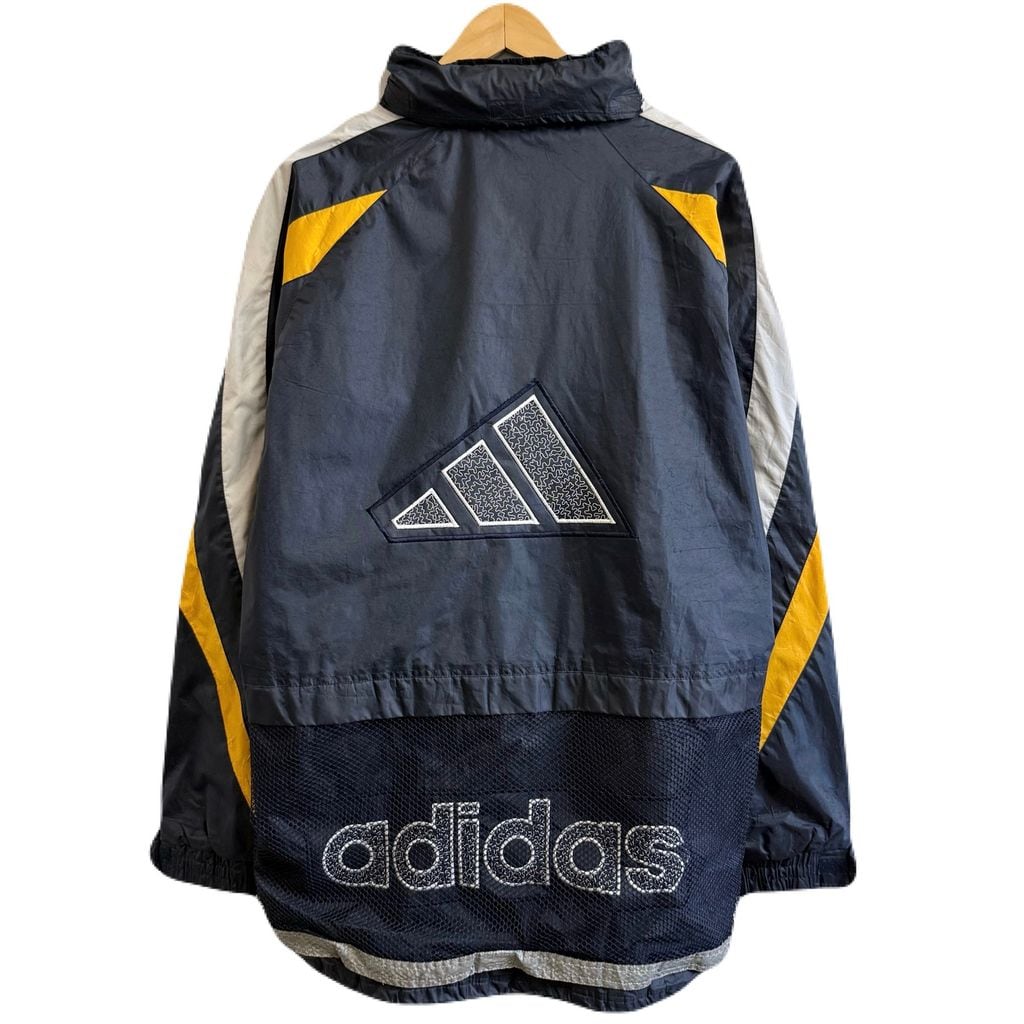 adidas アディダス EQUIPMENT イクイップメント ナイロンジャケット フード付き ウィンドブレーカー 切り替えデザイン ロゴ刺繍 紺×白×黄色 XLサイズ No.M055