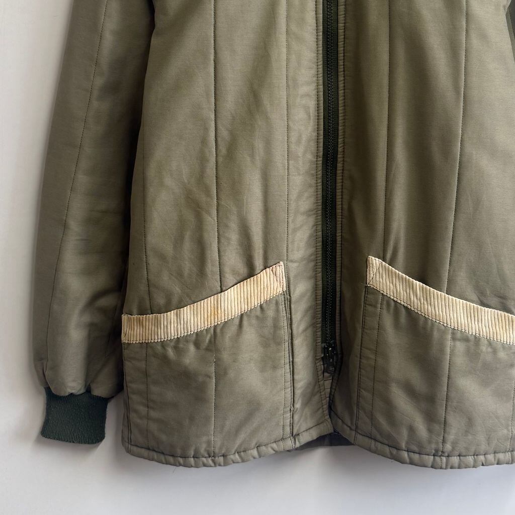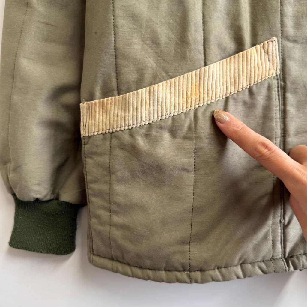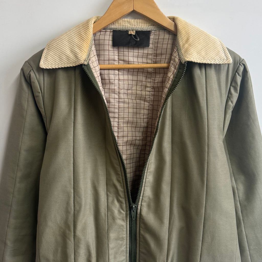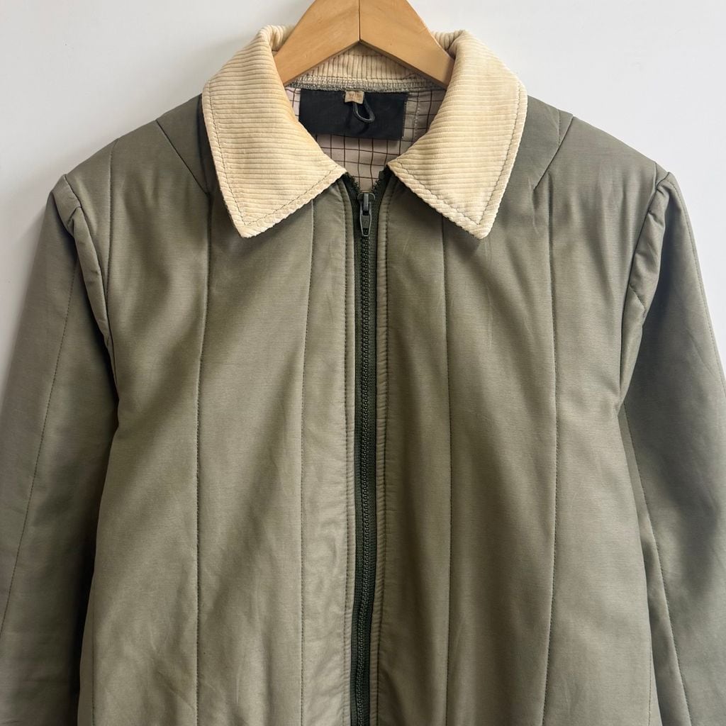 キルティングジャケット 襟コーデュロイ 裏地チェック柄 フルジップ ポケット付き カーキ×アイボリー No.M076