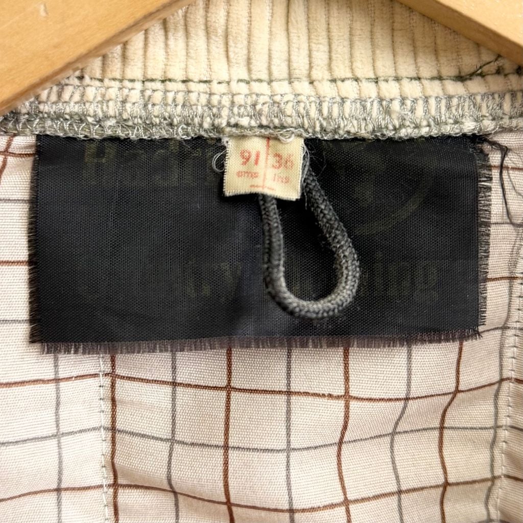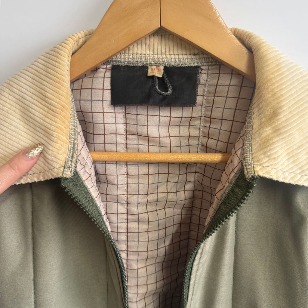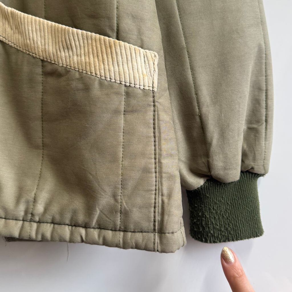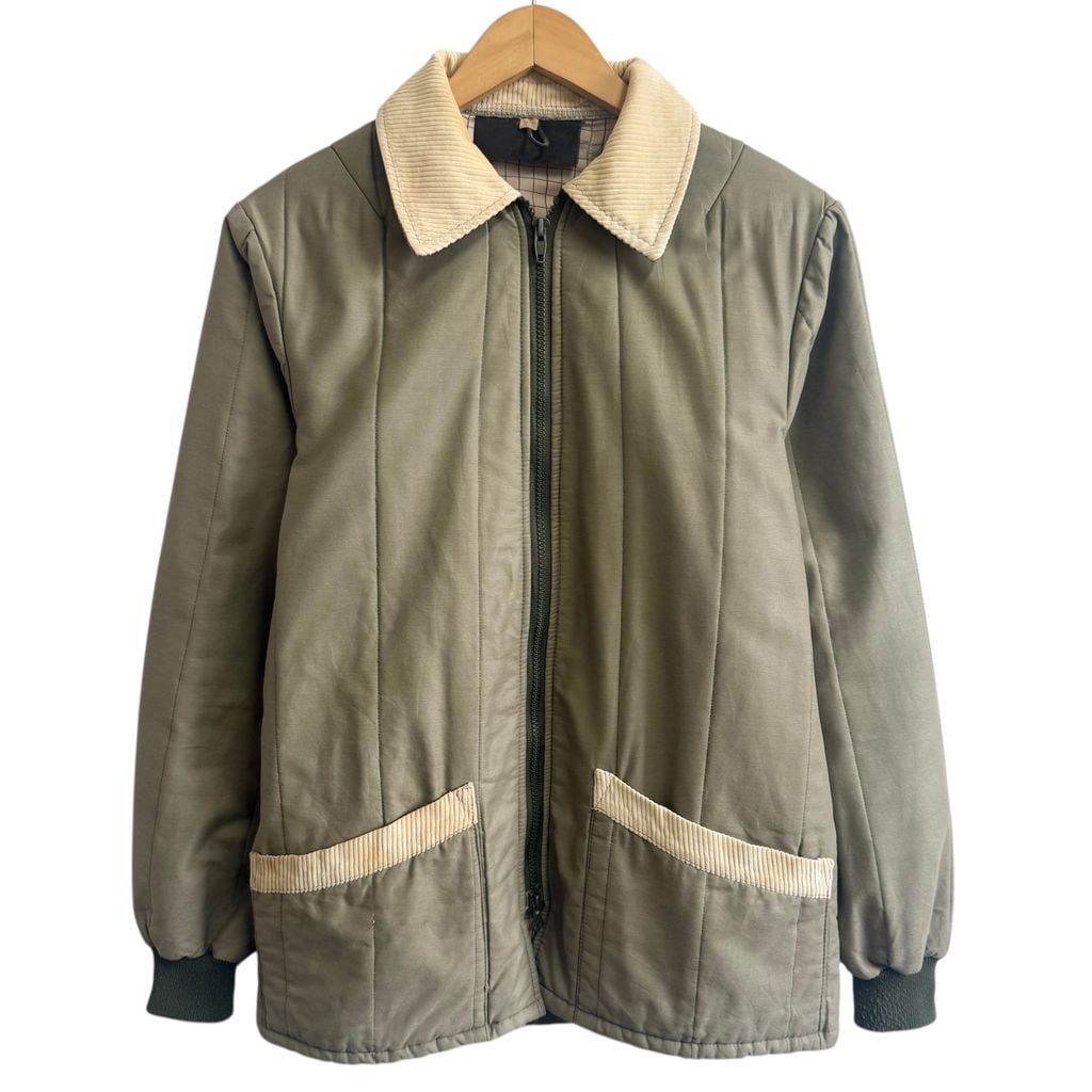 キルティングジャケット 襟コーデュロイ 裏地チェック柄 フルジップ ポケット付き カーキ×アイボリー No.M076