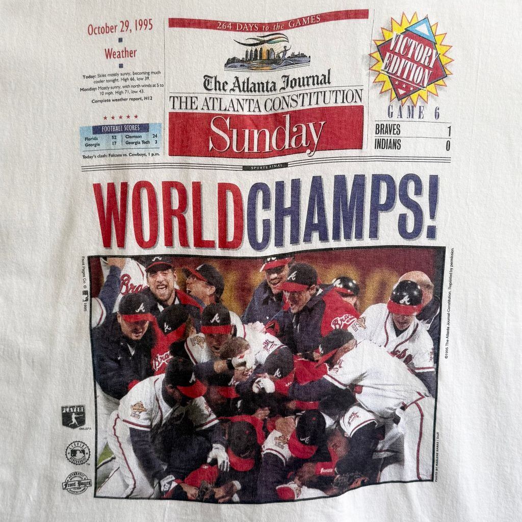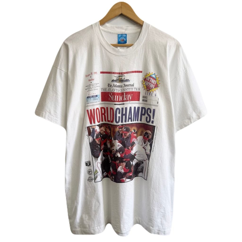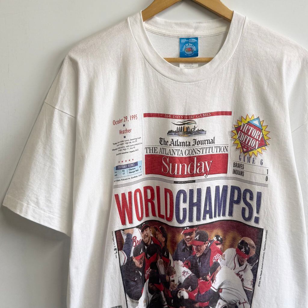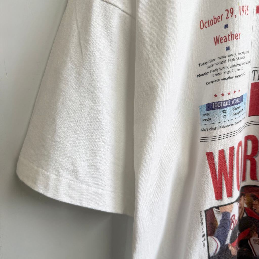 90's vintage ビンテージ USA製 FRUIT OF THE LOOM フルーツオブザルーム 1995 ワールドシリーズ アトランタブレーブス フォトプリント シングルステッチ 半袖Tシャツ 白 XLサイズ No.M077