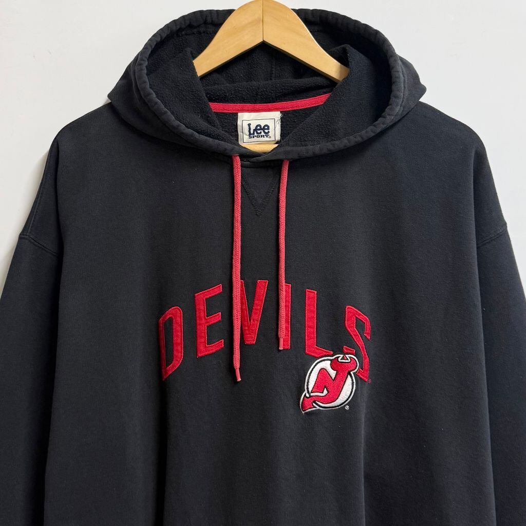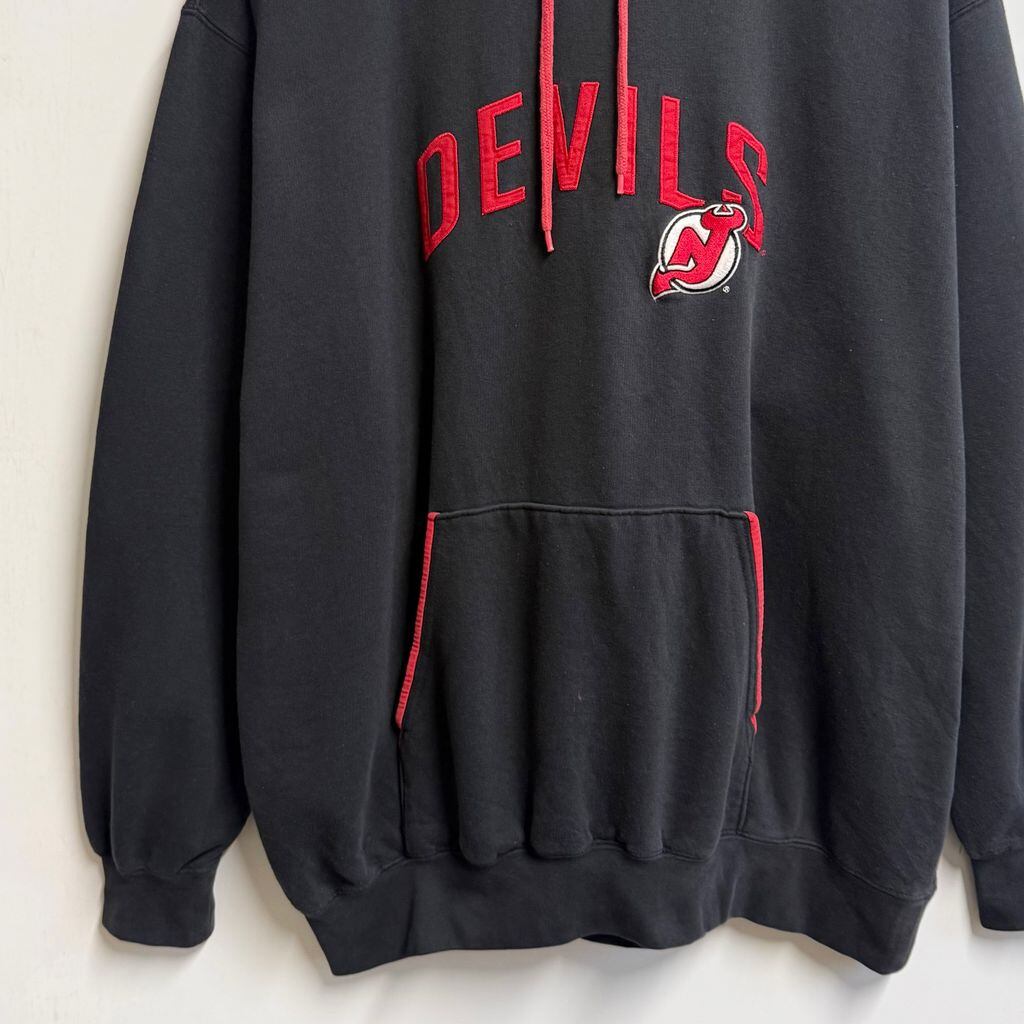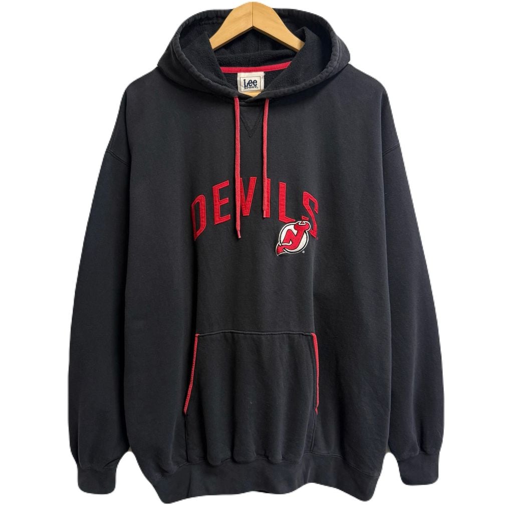 00's Lee リー ニュージャージー デビルス ロゴワッペン NHL フーディー パーカー ポケット付き 黒×赤 No.M089