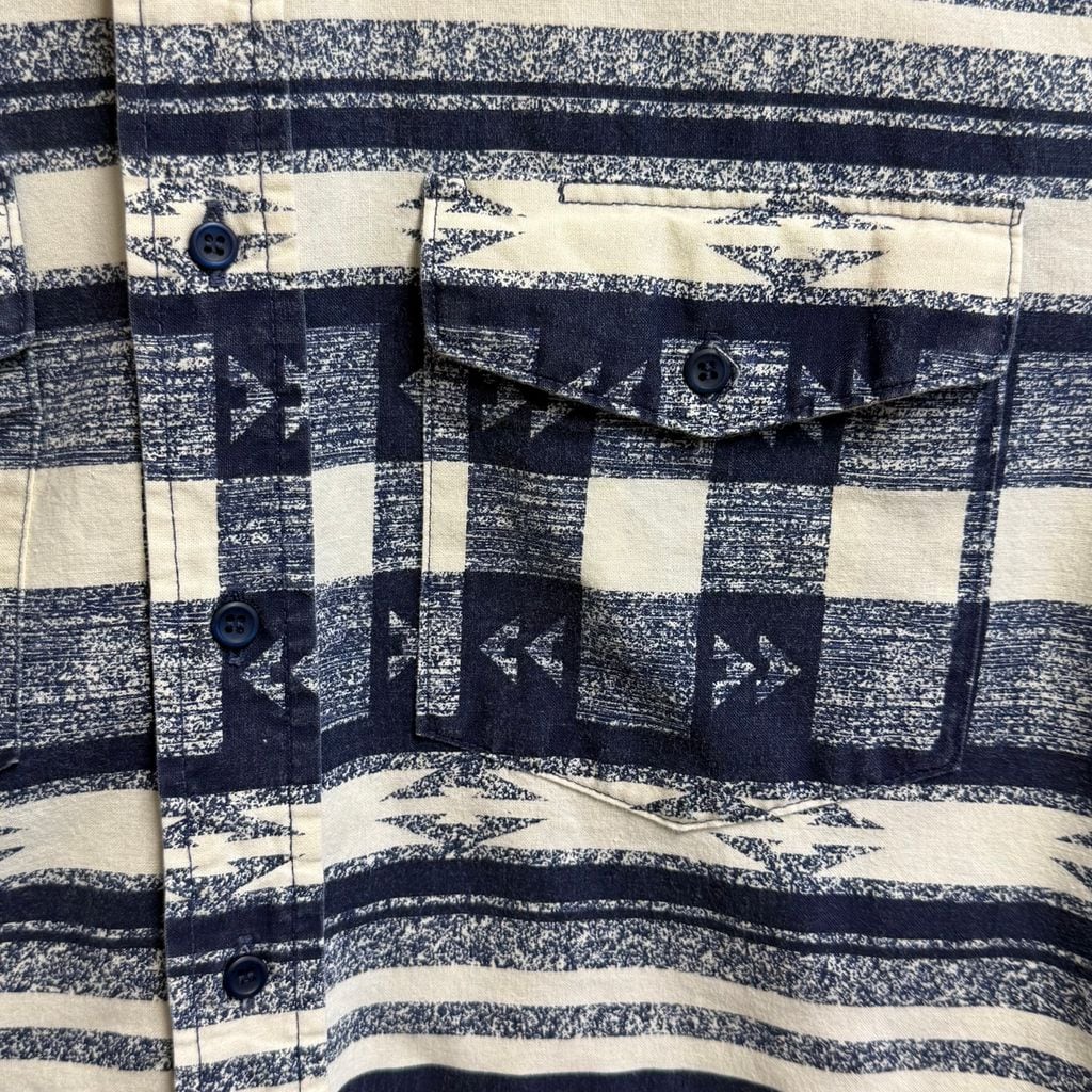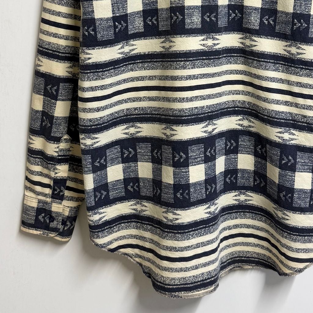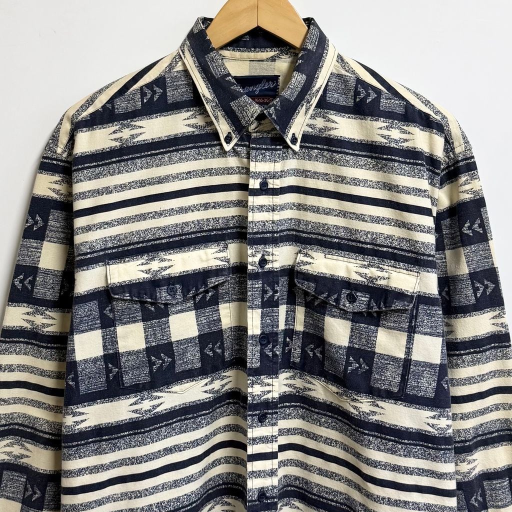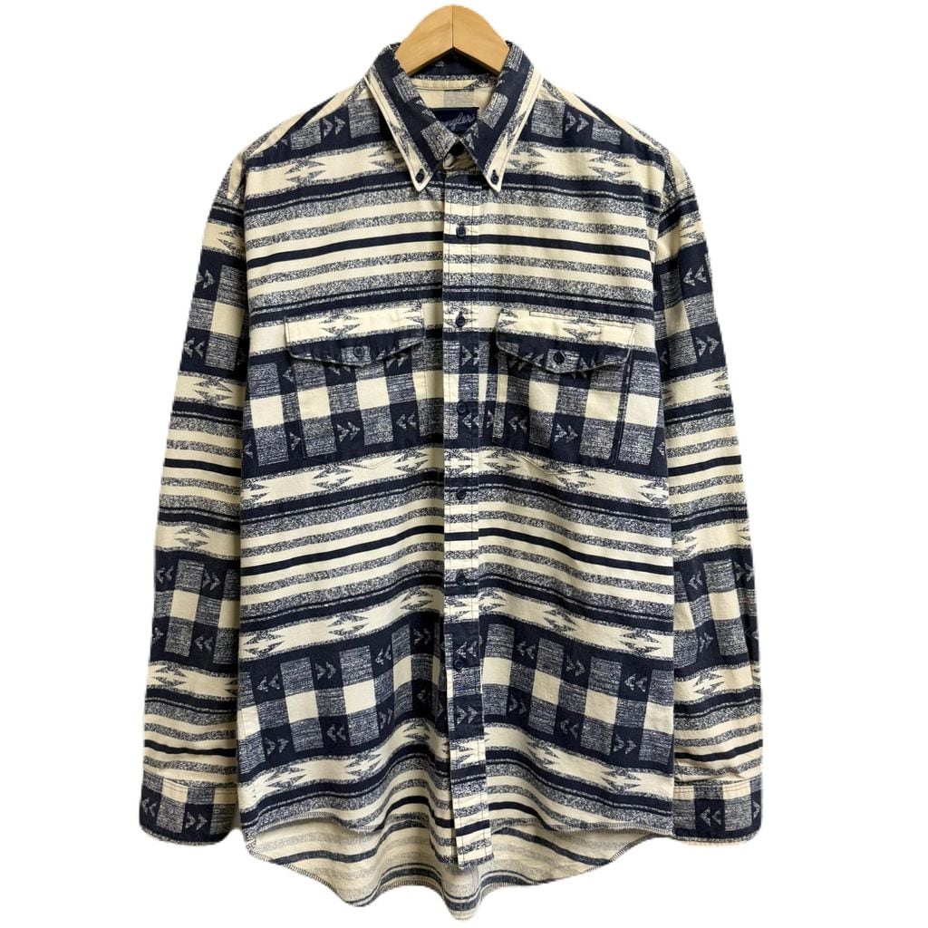 USA製 Wrangler ラングラー ネイティブ柄 ボーダー×柄 ボタンダウンシャツ 総柄 柄シャツ コットンシャツ 長袖シャツ 紺×アイボリー XLTサイズ No.M090