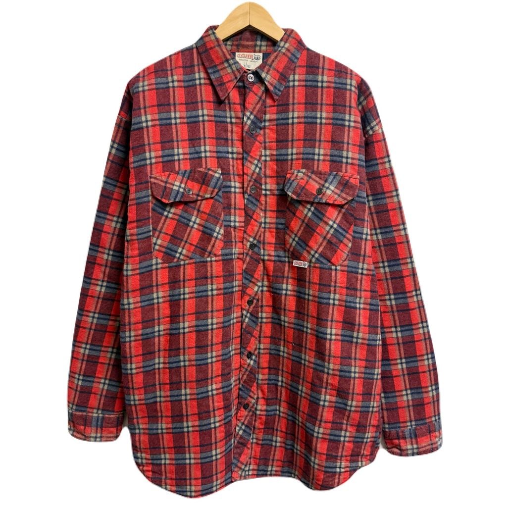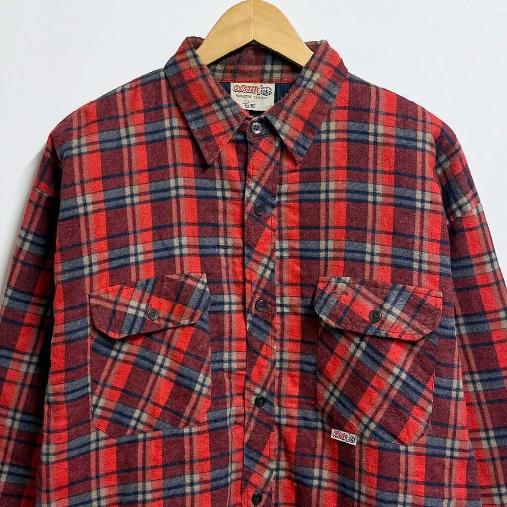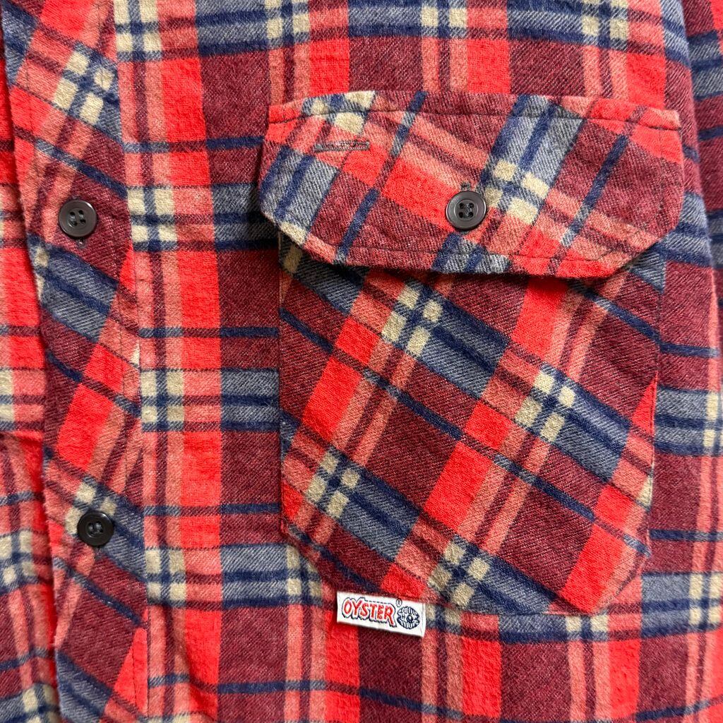 OYSTER シャツジャケット キルティング裏地 コットンシャツ チェック柄 ポケット付き 厚手長袖シャツ 朱色 赤×紺×ベージュ Lサイズ No.M092