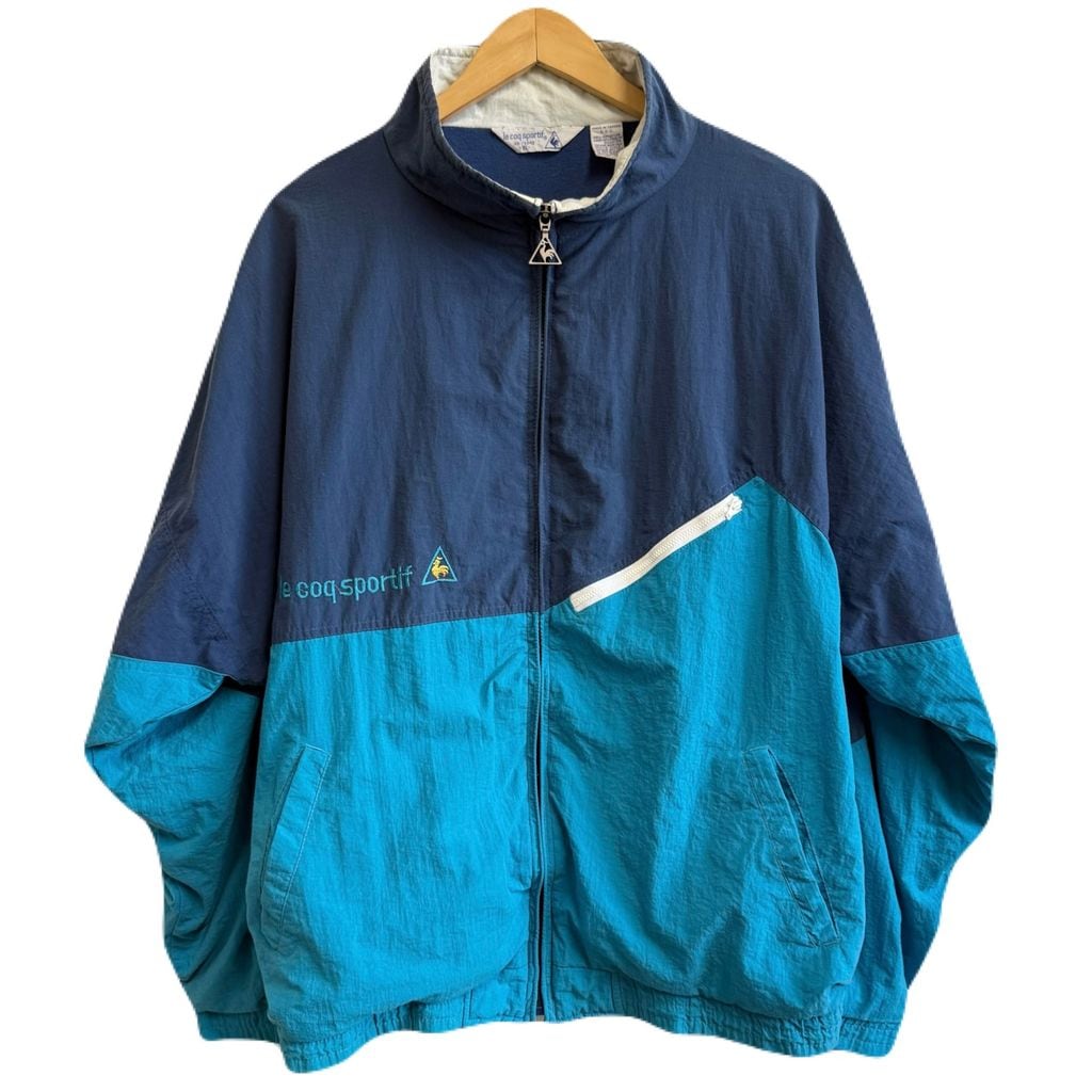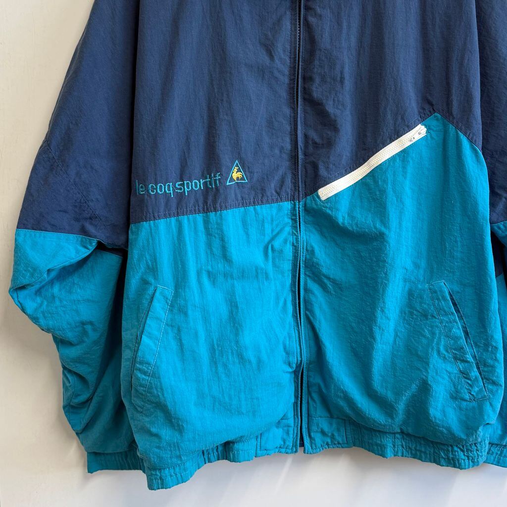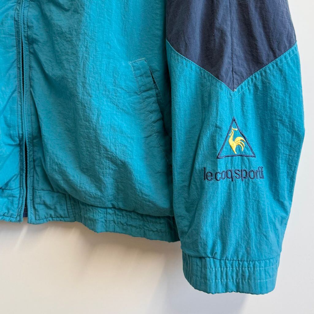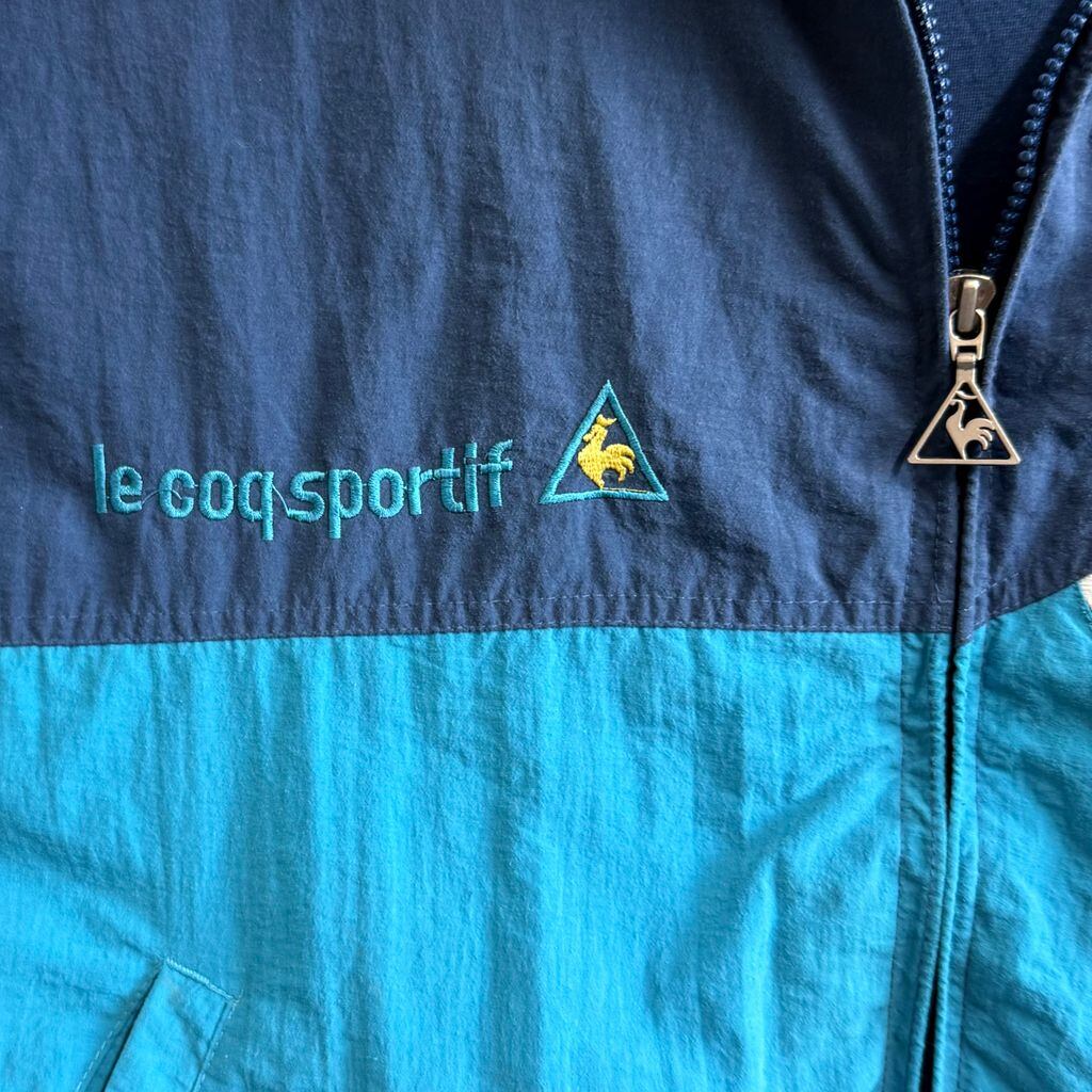 le coq sportif ルコックスポルティフ ナイロンジャケット ロゴ刺繍 フルジップ ポケット付き ネイビー×ターコイズブルー XLサイズ No.M099