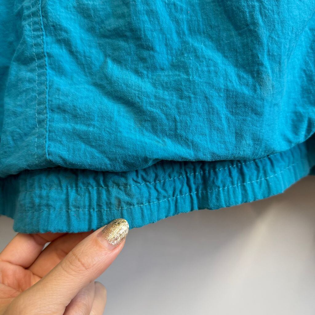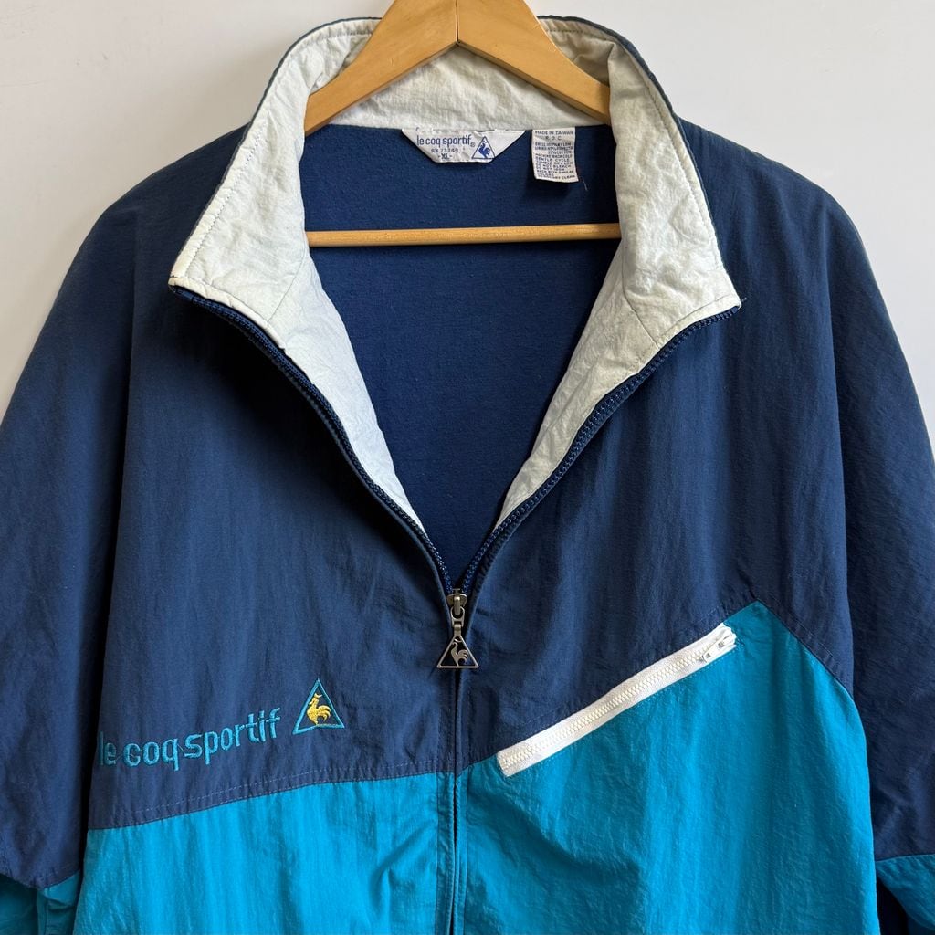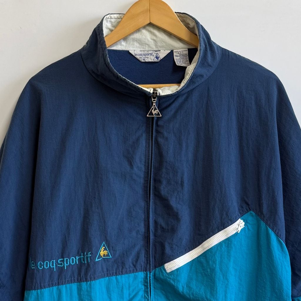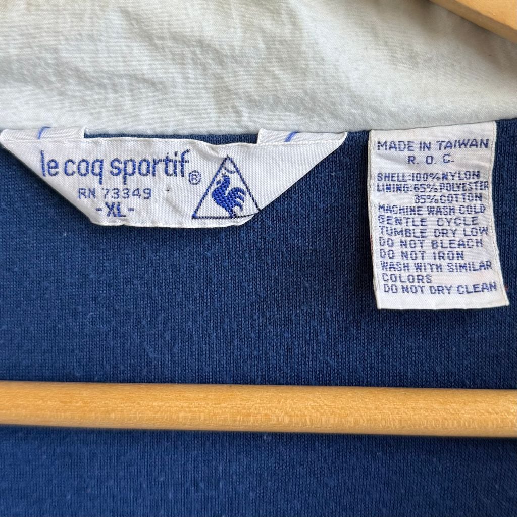 le coq sportif ルコックスポルティフ ナイロンジャケット ロゴ刺繍 フルジップ ポケット付き ネイビー×ターコイズブルー XLサイズ No.M099