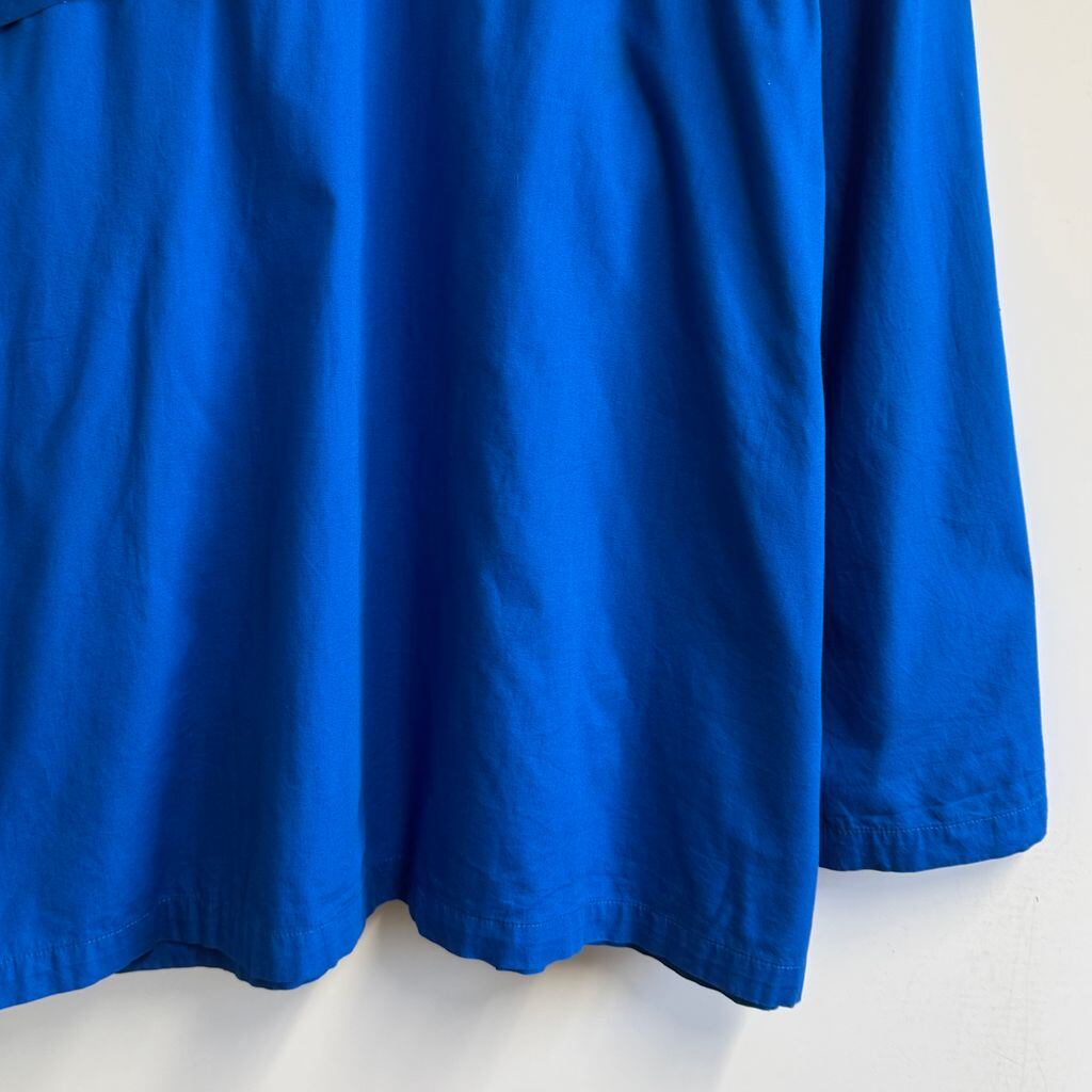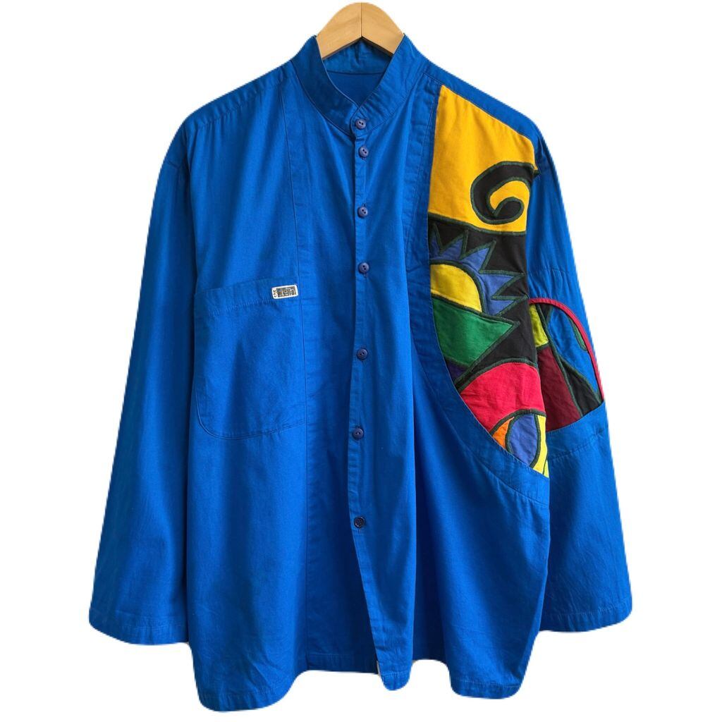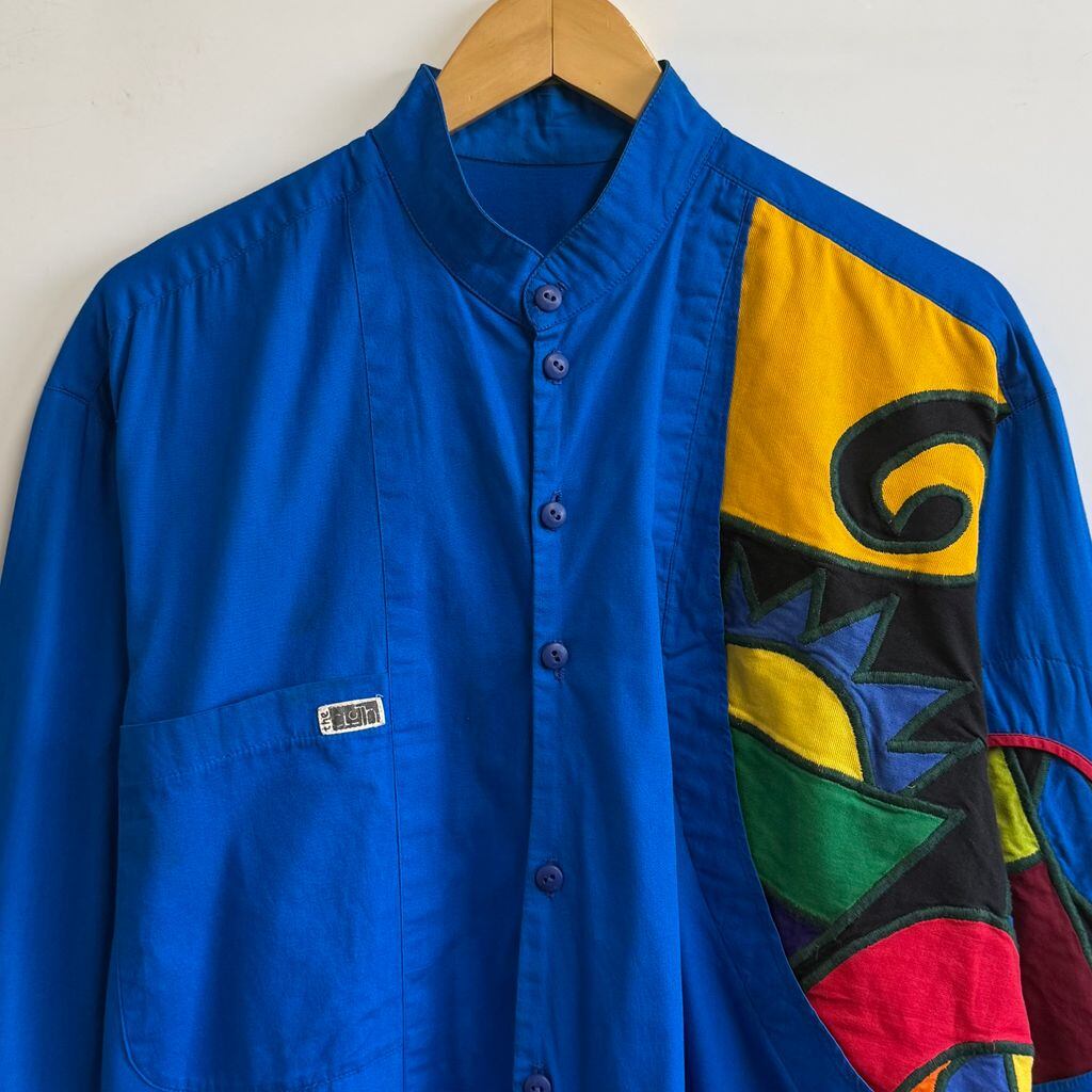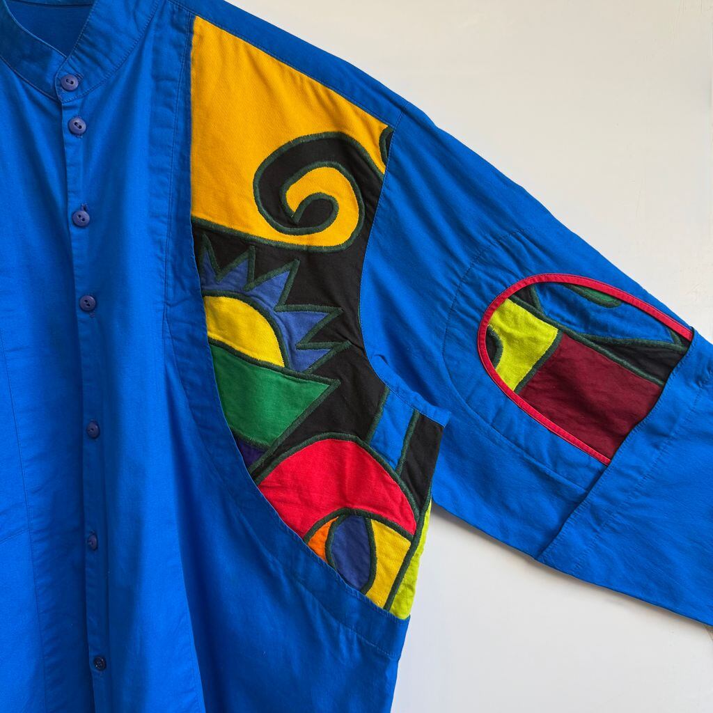 THE CLOTH バンドカラー アート 刺繍 アップリケ パッチワーク 切り替えデザイン コットンシャツ 長袖シャツ 青×多色 ONE SIZE No.M100