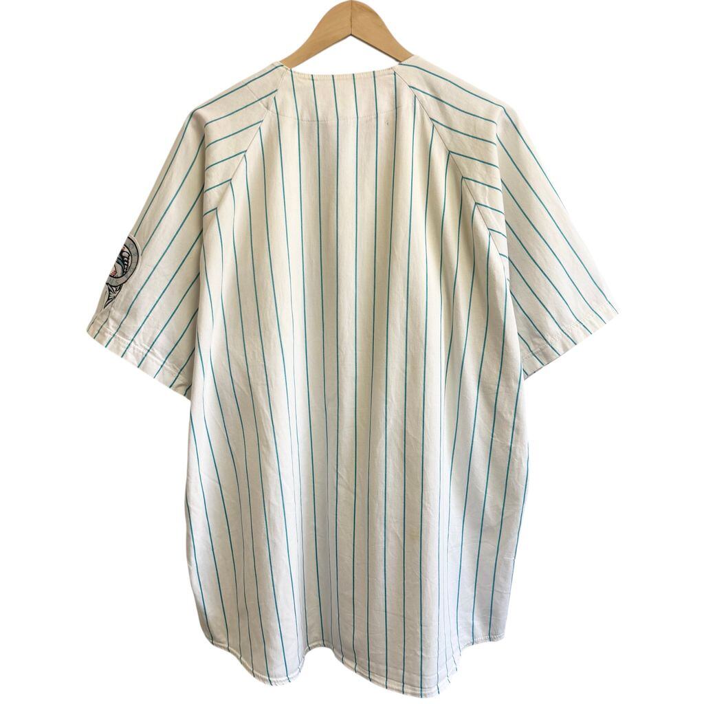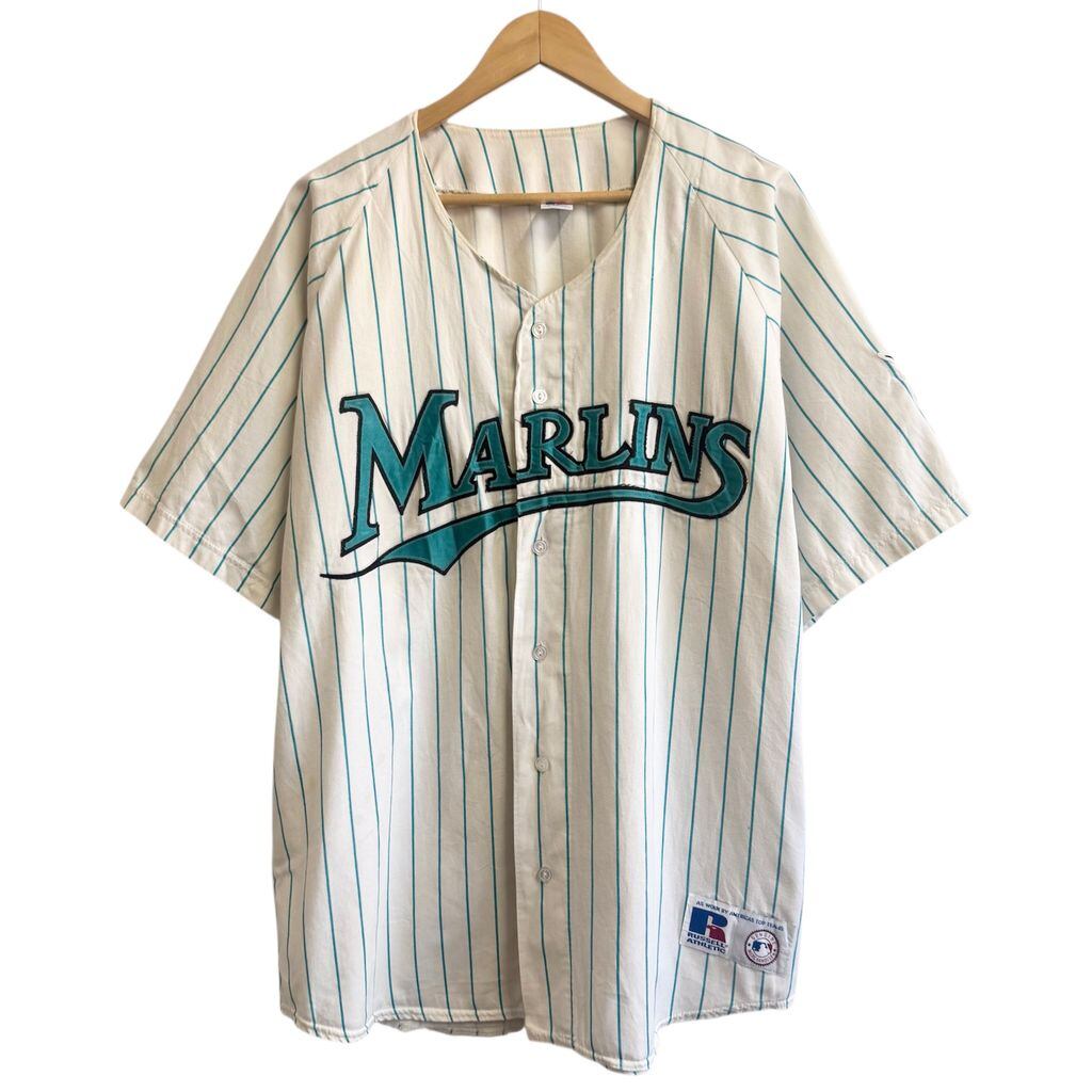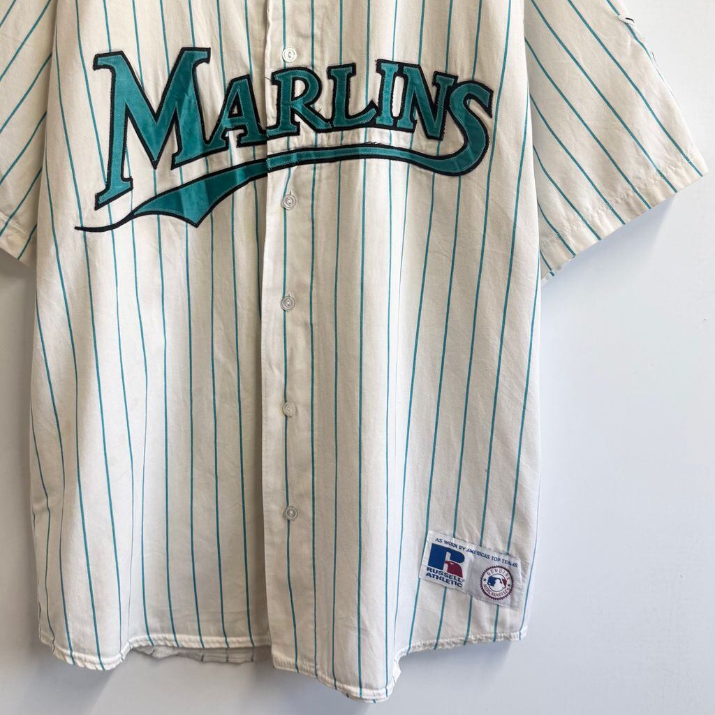 USA製 RUSSELL ATHLETIC ラッセルアスレティック FLORIDA MARLINS フロリダマリーンズ ストライプ ベースボールシャツ オフホワイト アイボリー×ターコイズブルー XXLサイズ No.M110
