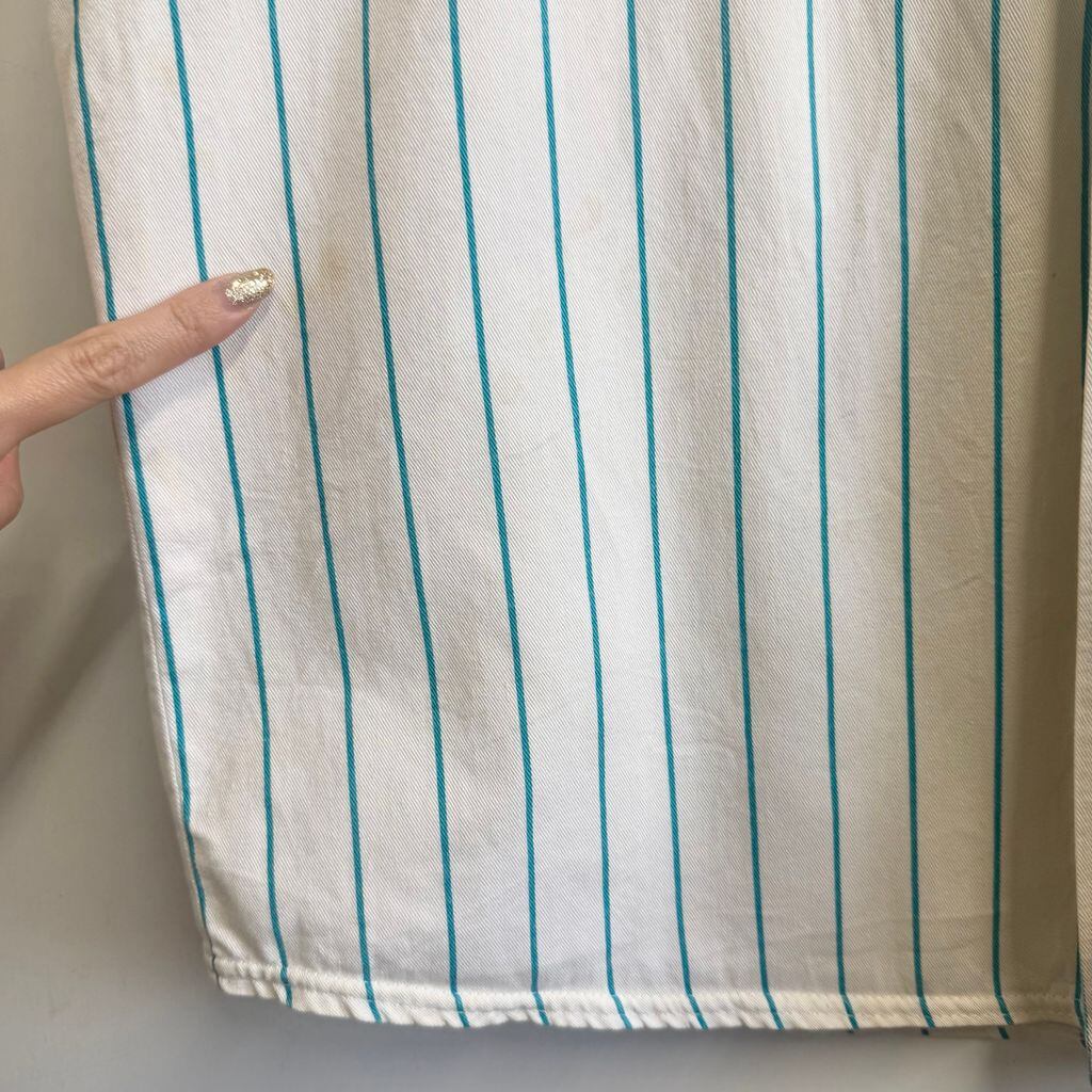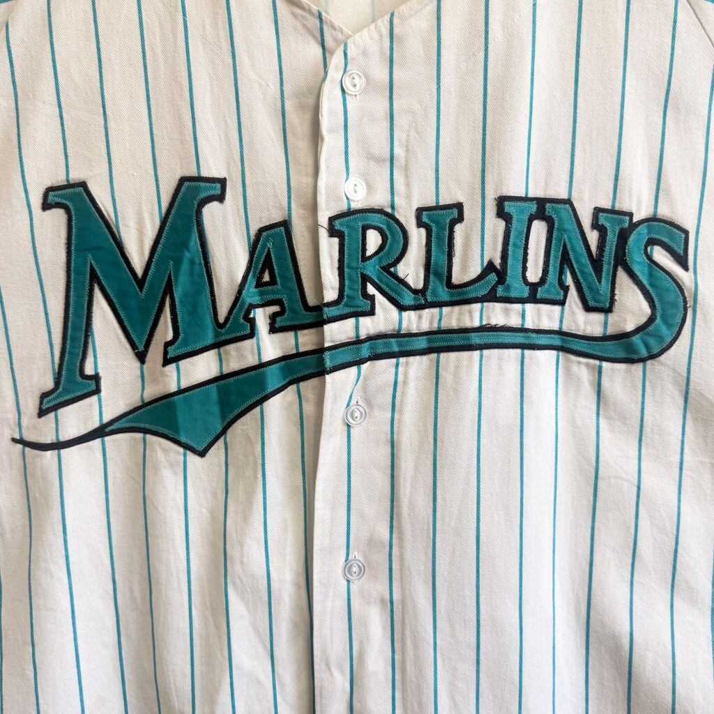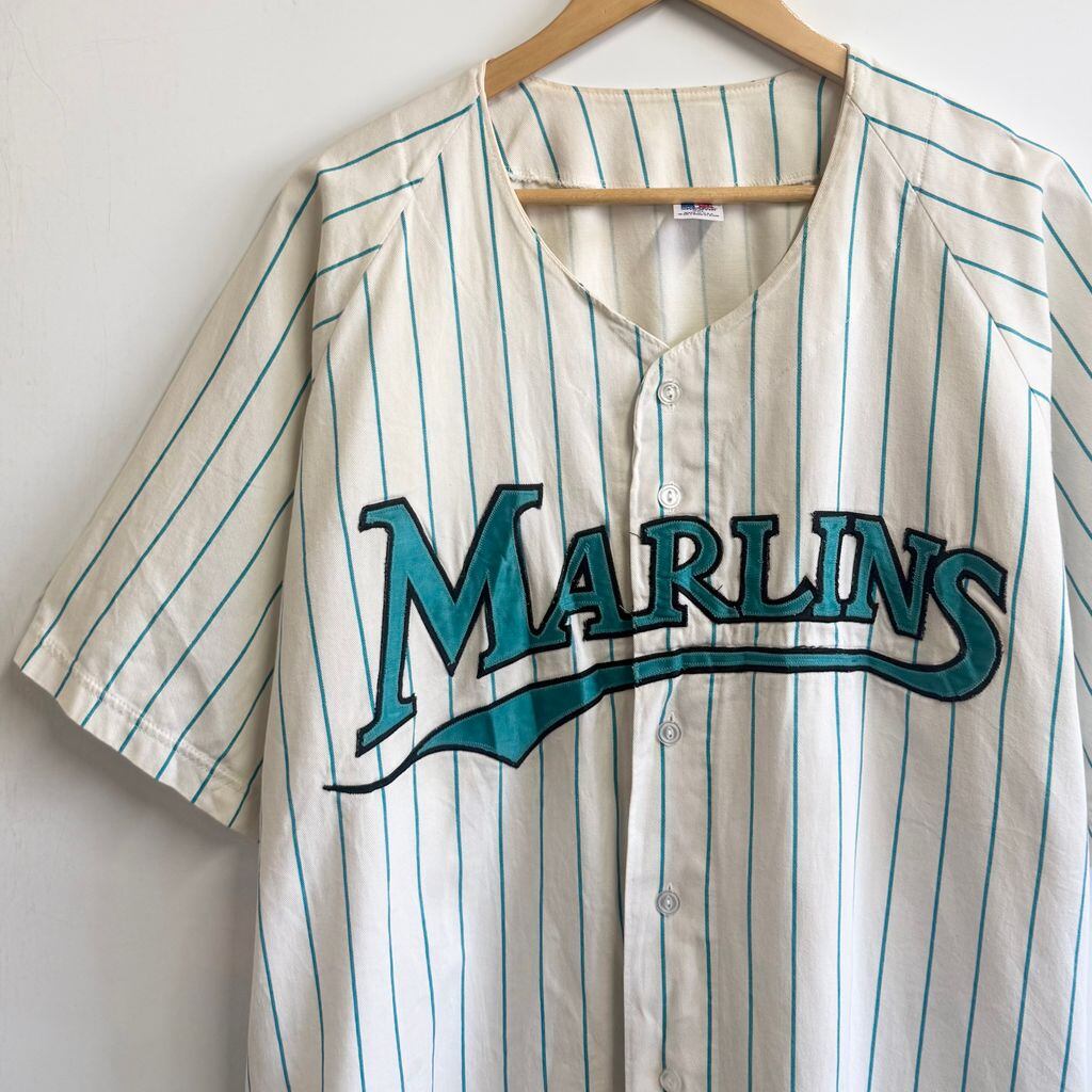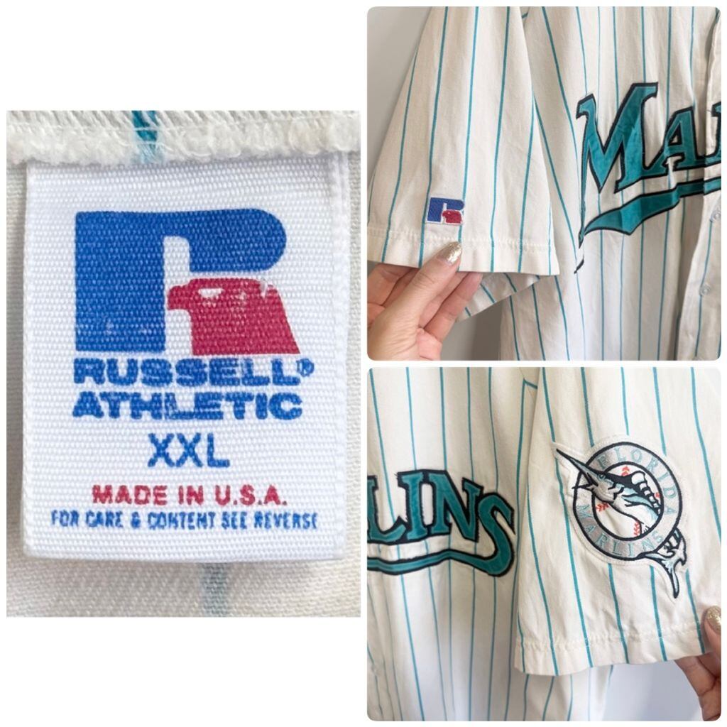 USA製 RUSSELL ATHLETIC ラッセルアスレティック FLORIDA MARLINS フロリダマリーンズ ストライプ ベースボールシャツ オフホワイト アイボリー×ターコイズブルー XXLサイズ No.M110