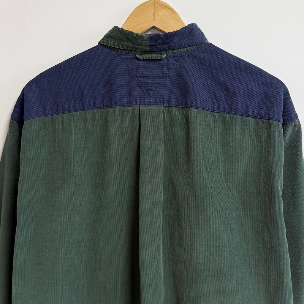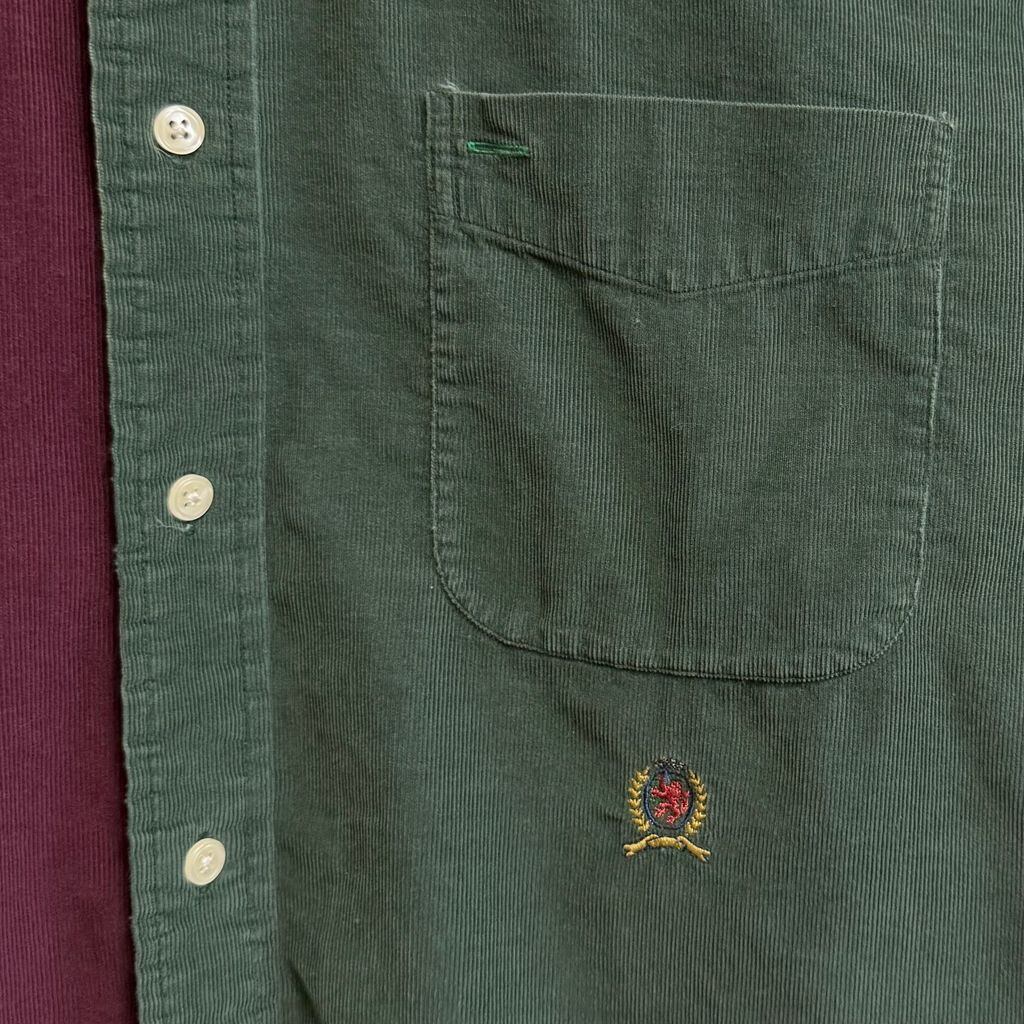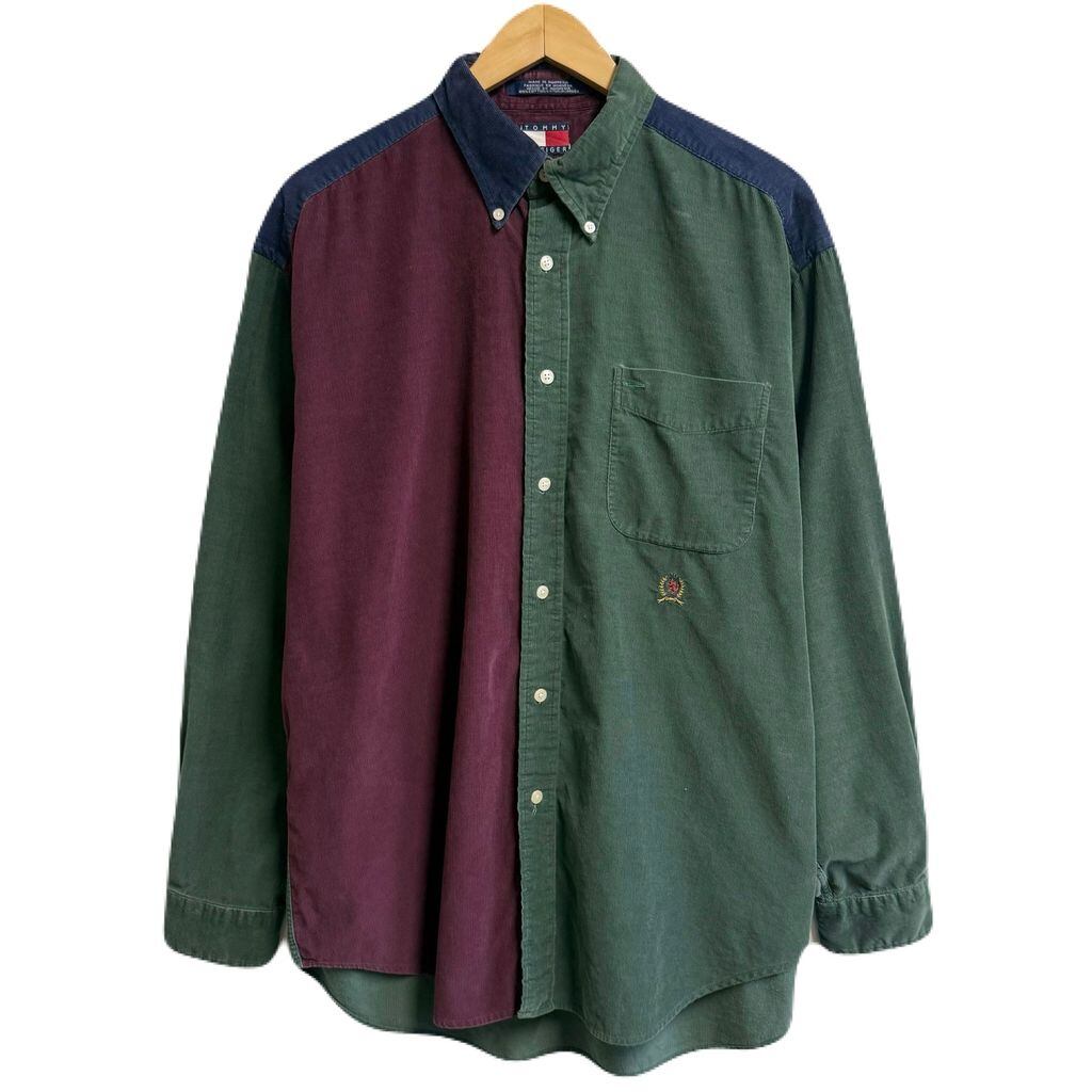 TOMMY HILFIGER トミーヒルフィガー コーデュロイシャツ ボタンダウンシャツ コットンシャツ ポケット付き 長袖シャツ ワンポイントロゴ 刺繍 マルチカラー グリーン×パープル×ネイビー Lサイズ No.M116