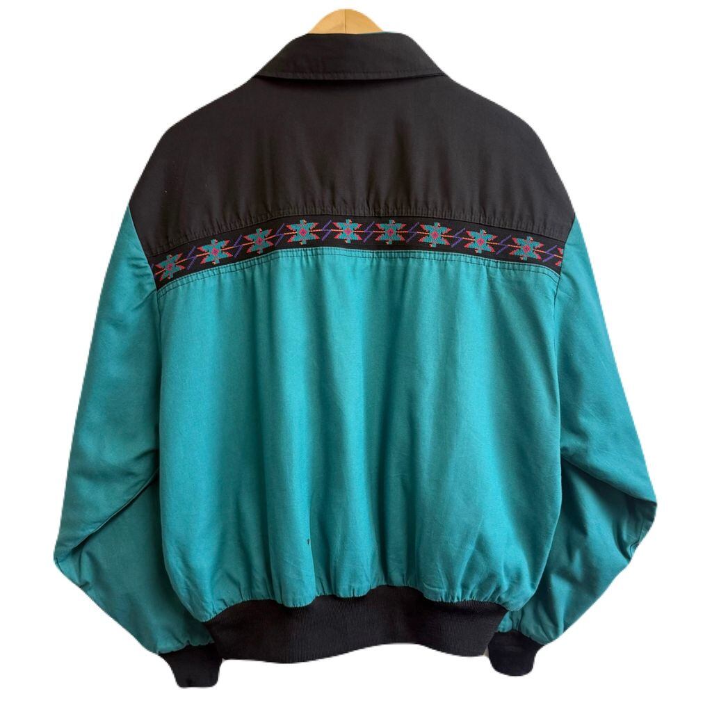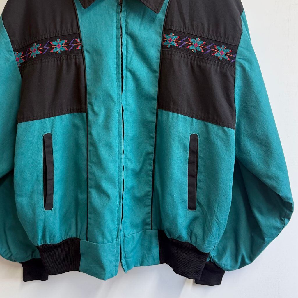 80's〜 vintage ビンテージ USA製 WESTERN FRONTIER ネイティブ柄 サンタフェジャケット ブランケット裏地 エメラルドグリーン×黒 L/Gサイズ No.M152