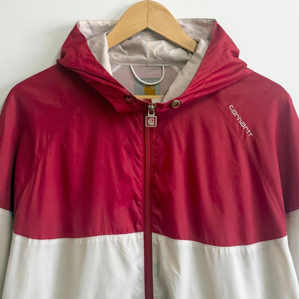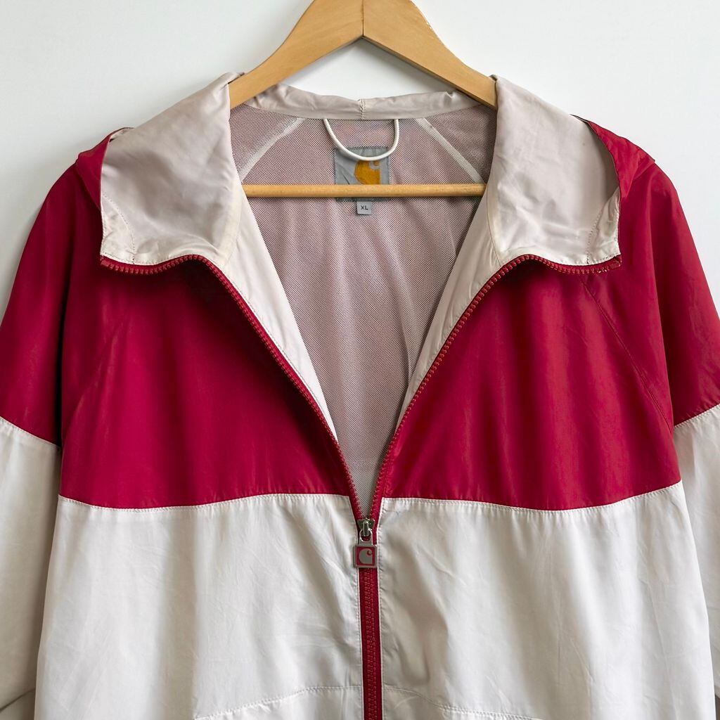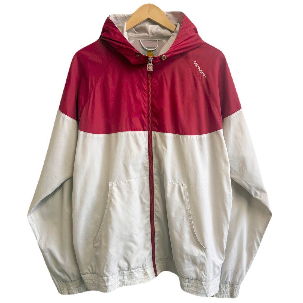 Carhartt カーハート ナイロンジャケット 裏地メッシュ ウィンドブレーカー フード付き ロゴ刺繍 バイカラー 赤×オフホワイト XLサイズ No.M154