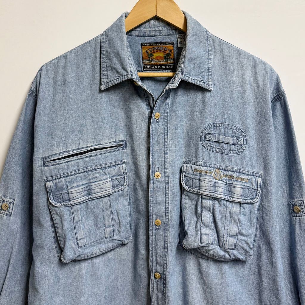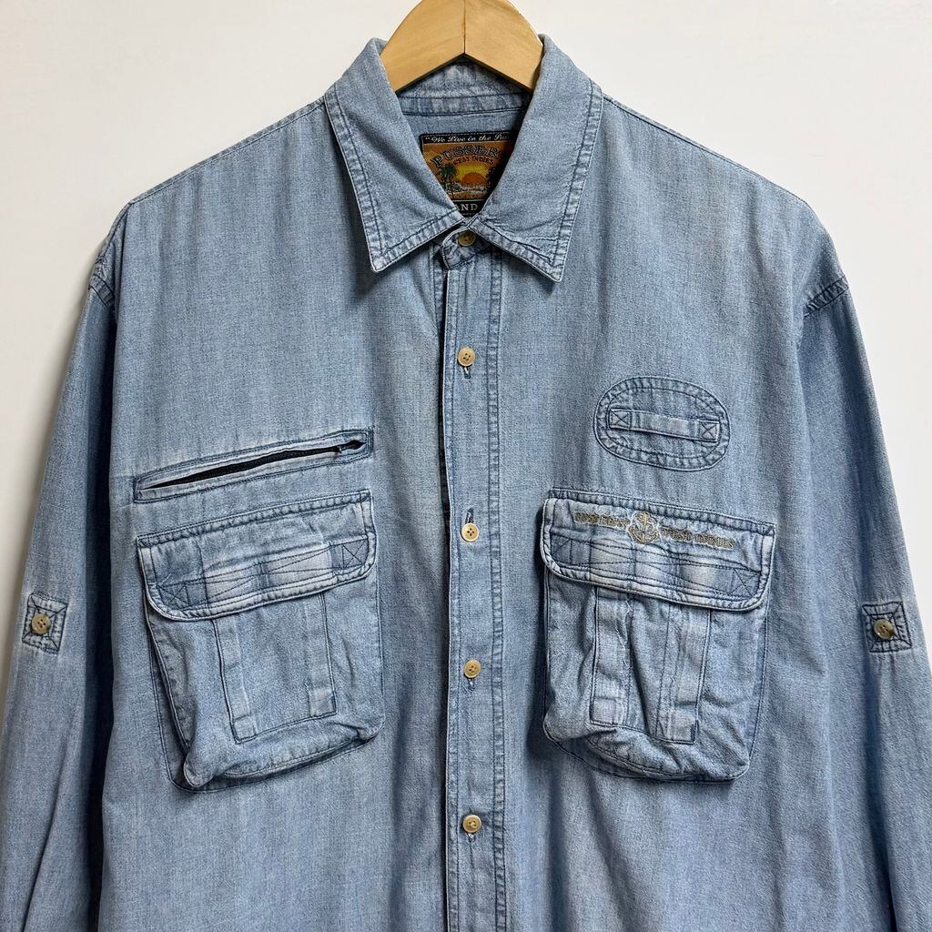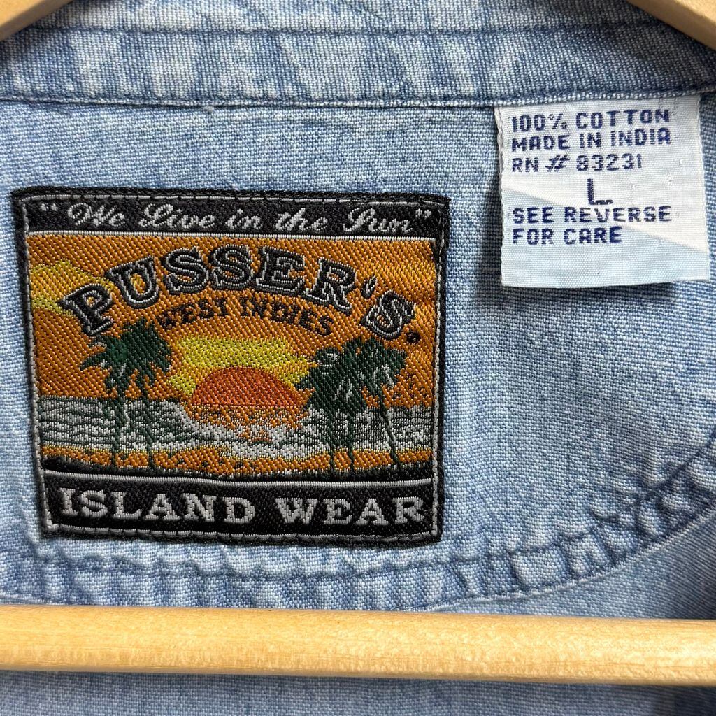 PUSSER'S WEST INDIES シャンブレーシャツ コットンシャツ ポケット付き 長袖シャツ ワンポイントロゴ 刺繍 ライトブルー 青 Lサイズ No.M165