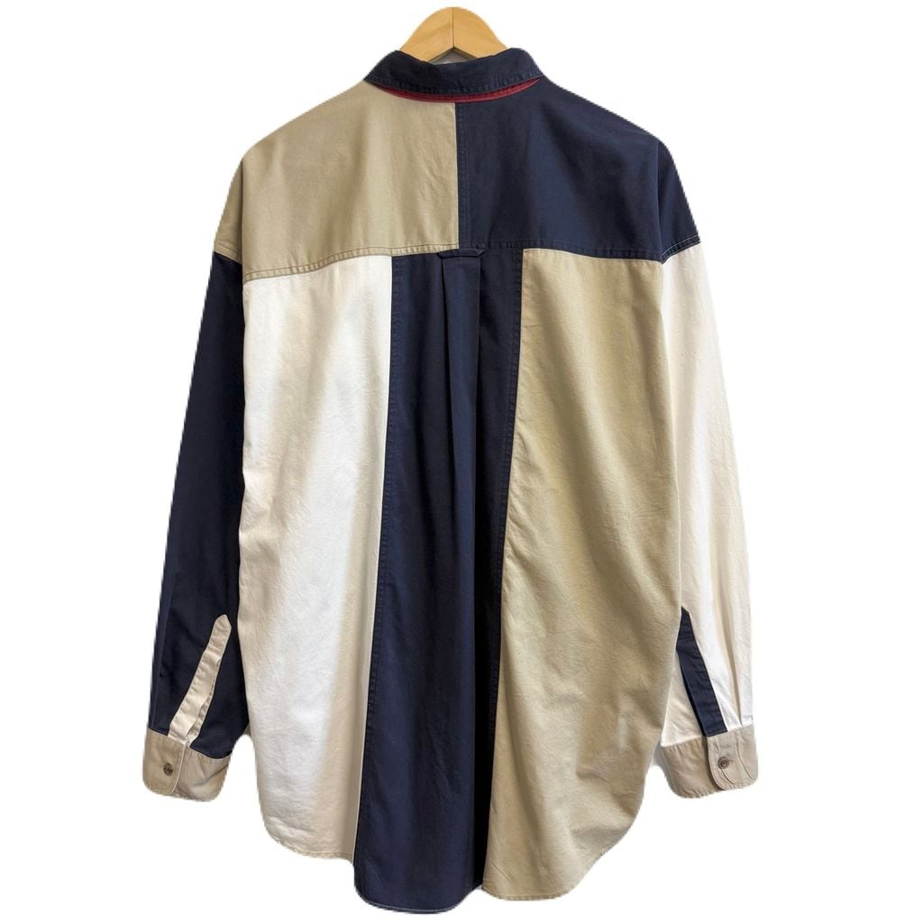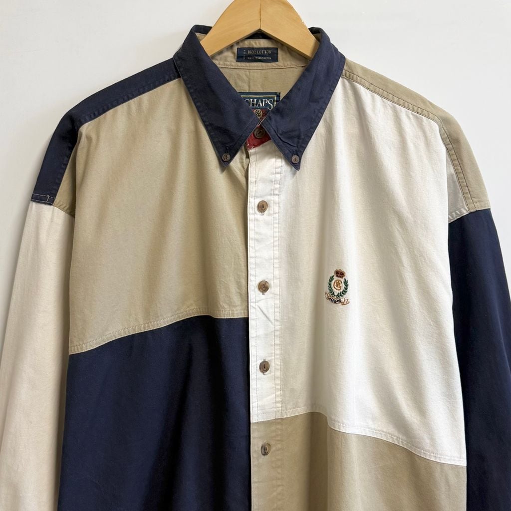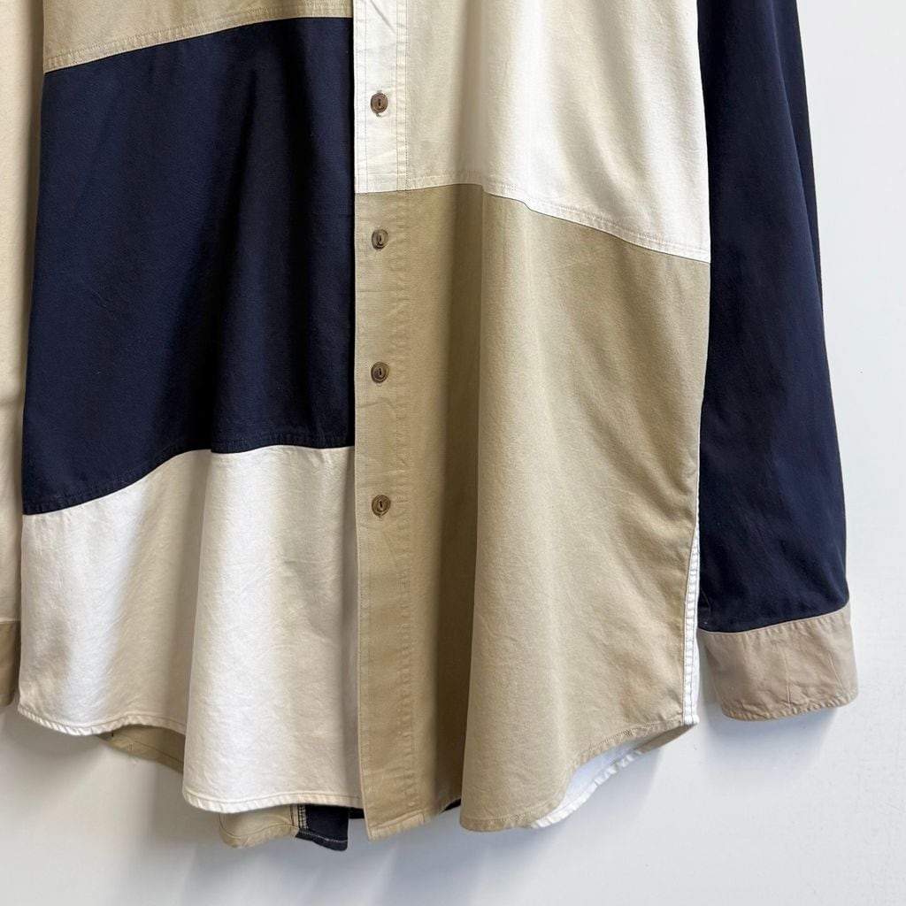 90's CHAPS チャップス RALPH LAUREN ラルフローレン ボタンダウンシャツ コットンシャツ 長袖シャツ ワンポイントロゴ 刺繍 カラーブロック マルチカラー 白×紺×ベージュ XLサイズ No.M216