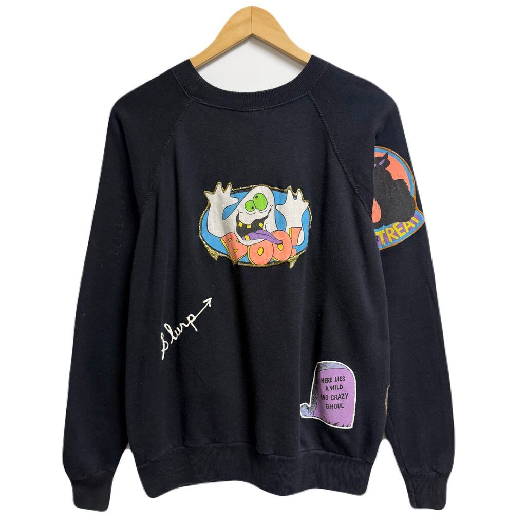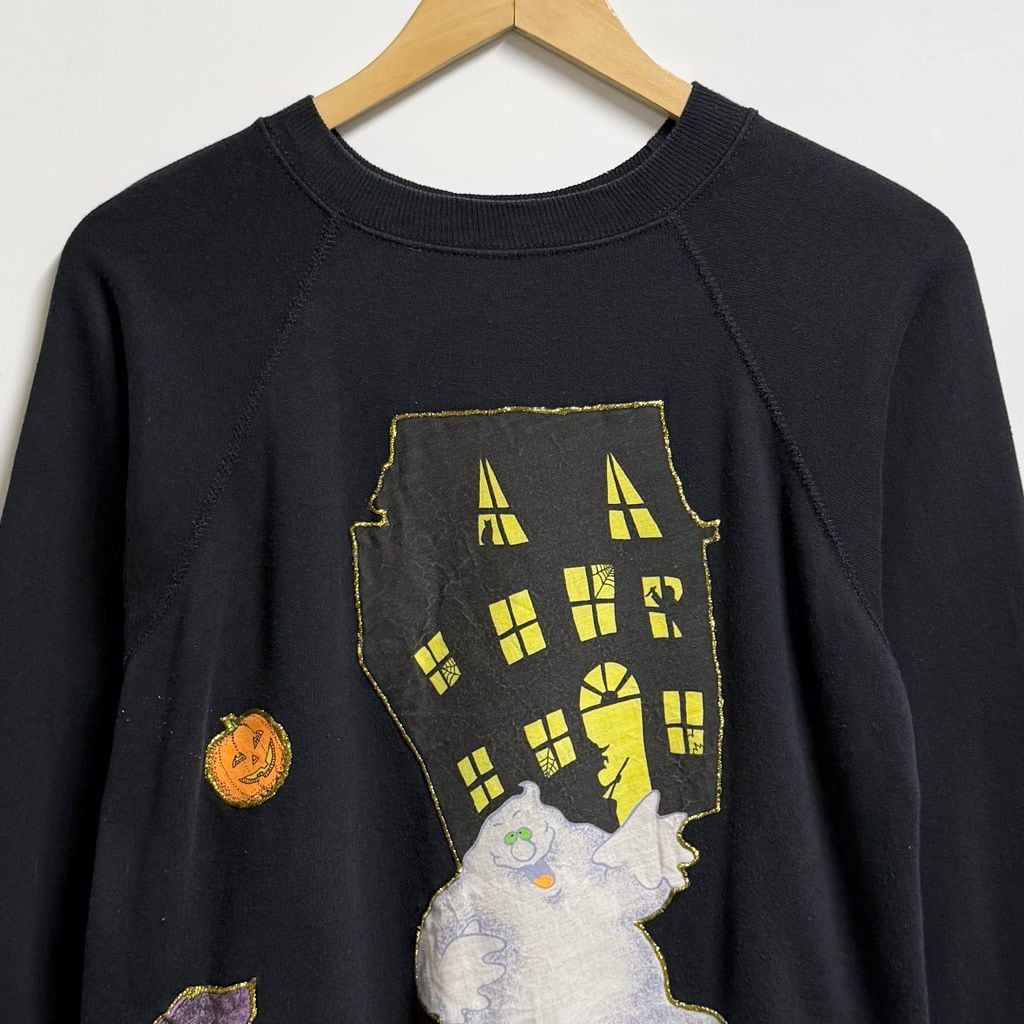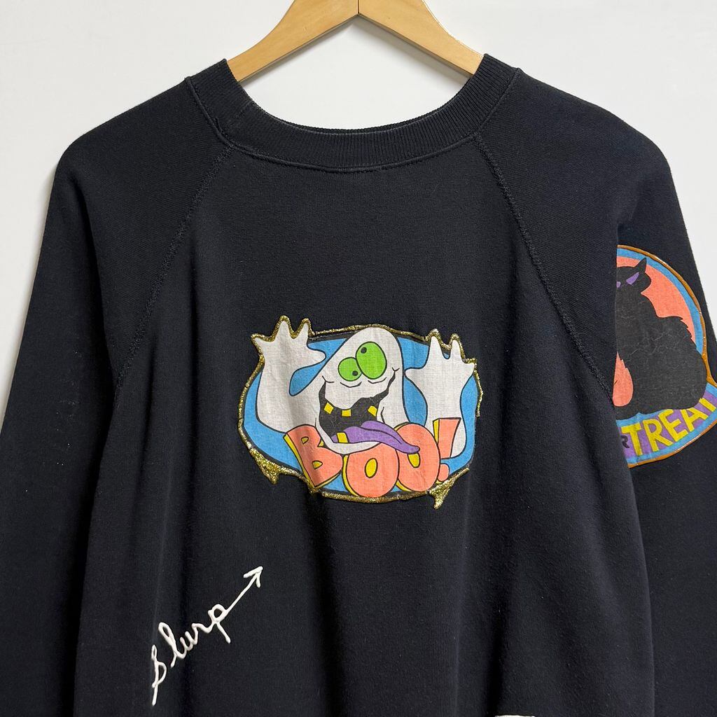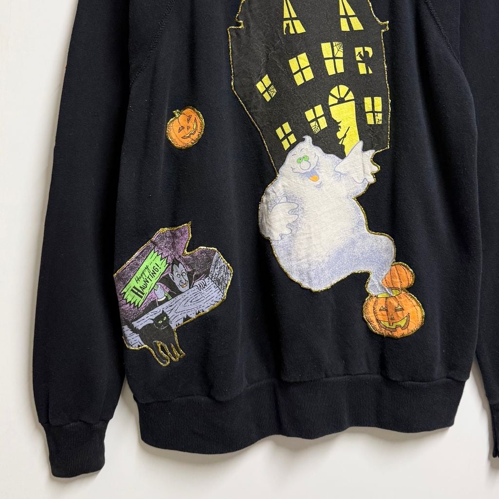 USA製 Pannill パニール by Hanes ヘインズ ハロウィン カボチャ おばけ リメイク ペイント ラメ キラキラ アップリケ ラグランスウェット トレーナー 裏起毛 黒 ブラック Lサイズ No.M267