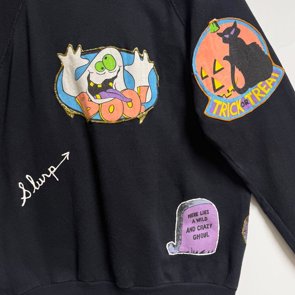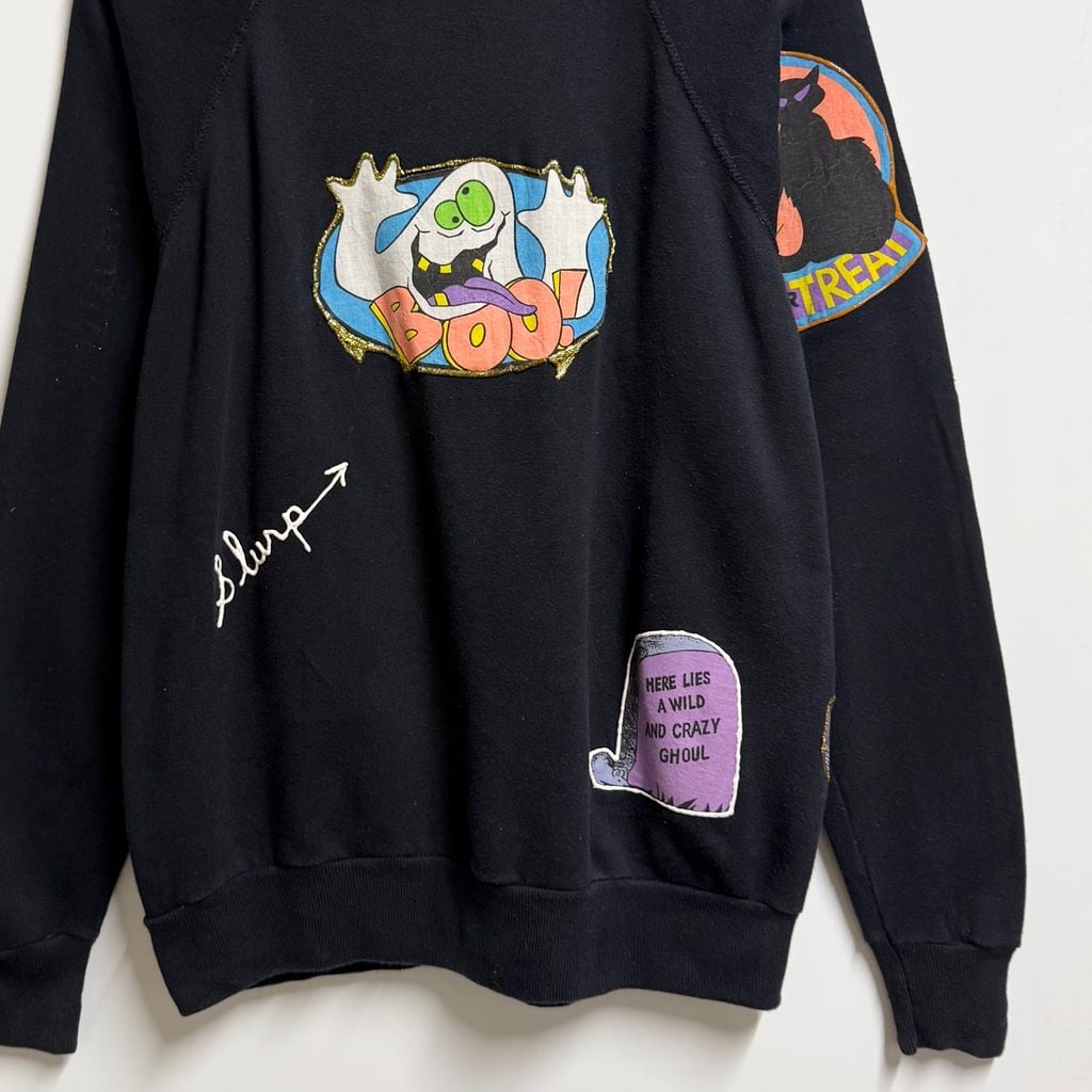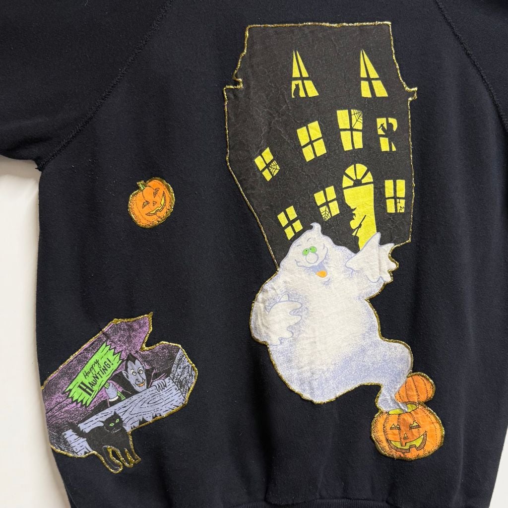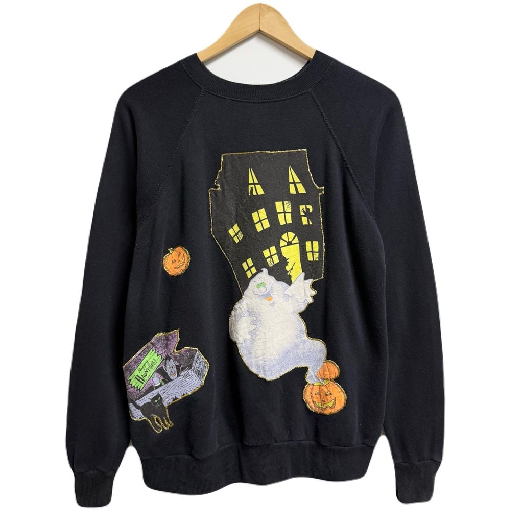 USA製 Pannill パニール by Hanes ヘインズ ハロウィン カボチャ おばけ リメイク ペイント ラメ キラキラ アップリケ ラグランスウェット トレーナー 裏起毛 黒 ブラック Lサイズ No.M267