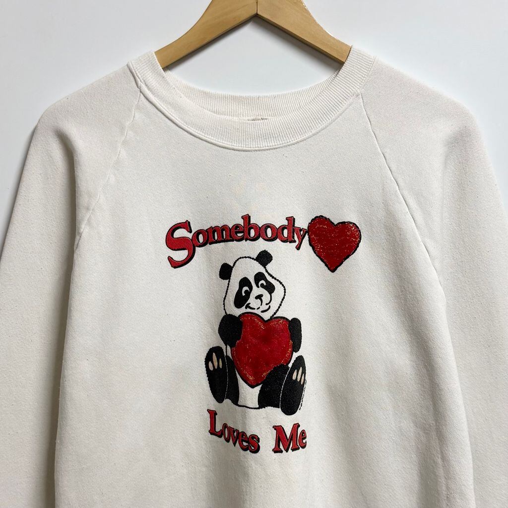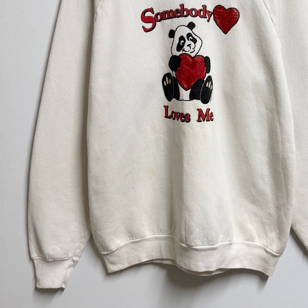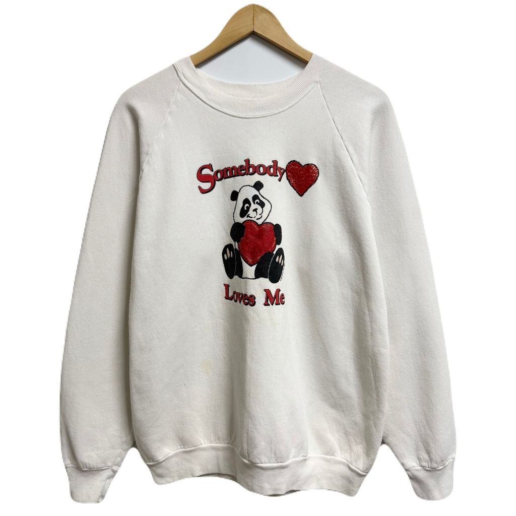 90's USA製 FRUIT OF THE LOOM フルーツオブザルーム パンダ アニマルプリント ハート ペイント キラキラ ラメ ラグランスウェット トレーナー 白 XLサイズ No.M268