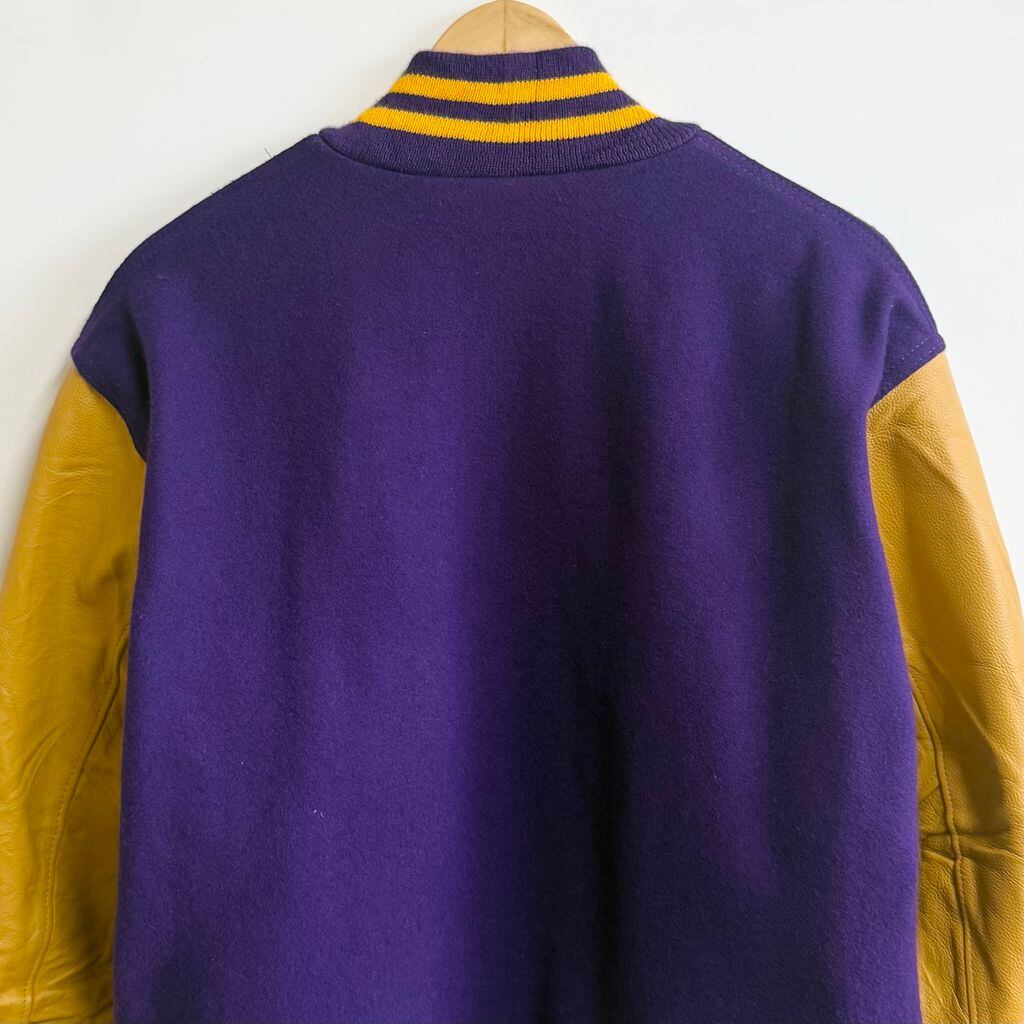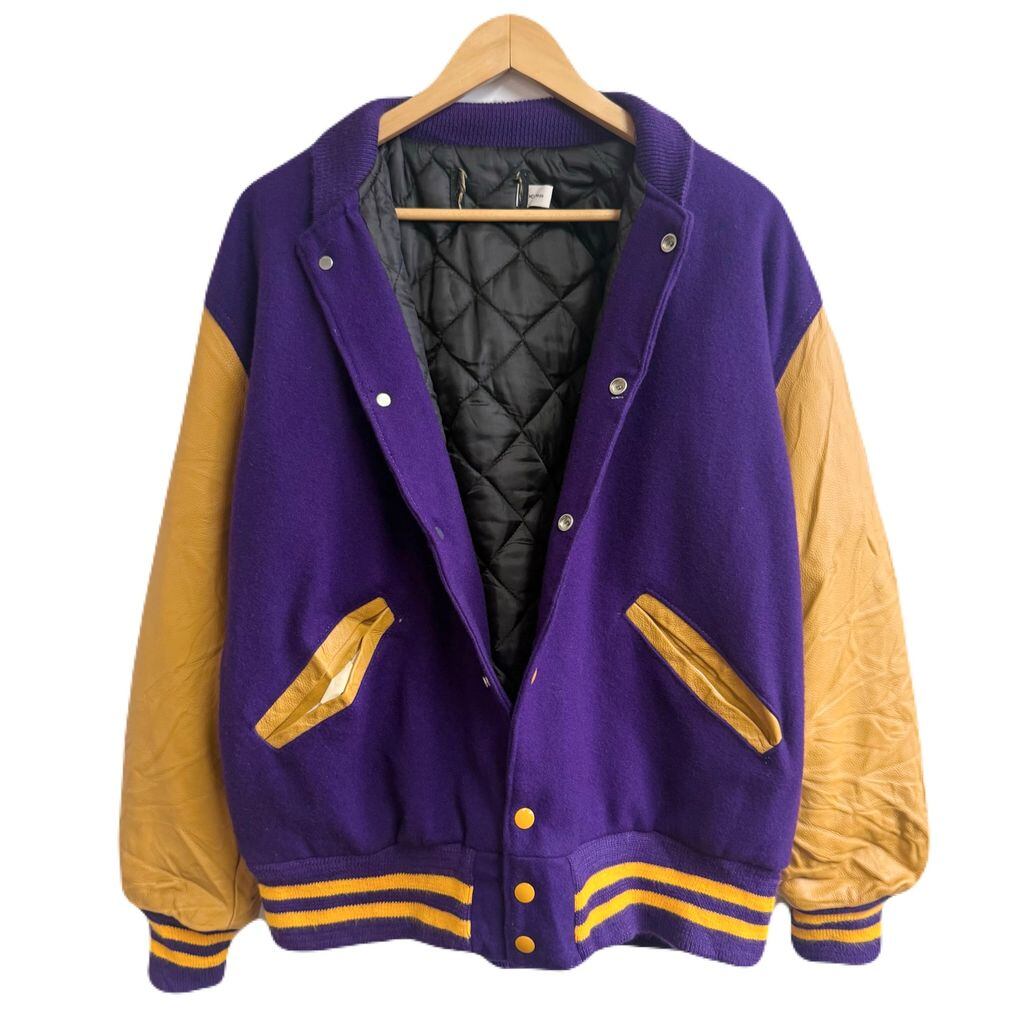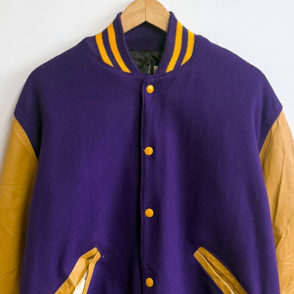 ウール×レザー風 切り替えデザイン スタジャン リブライン スナップボタン 良色 パープル×イエロー Mサイズ No.M309