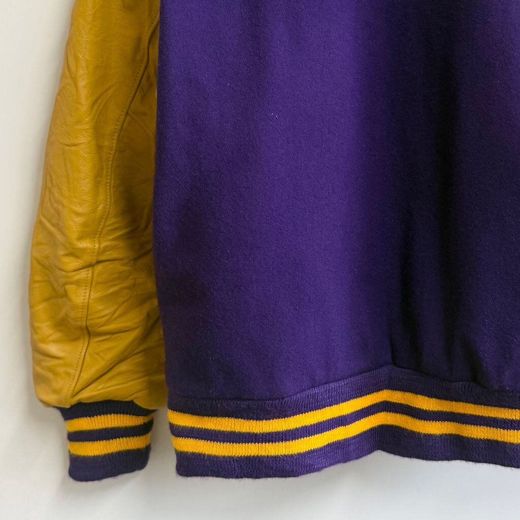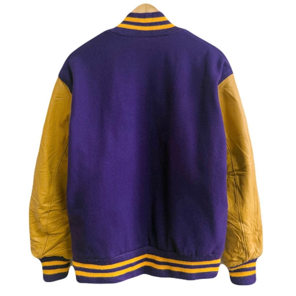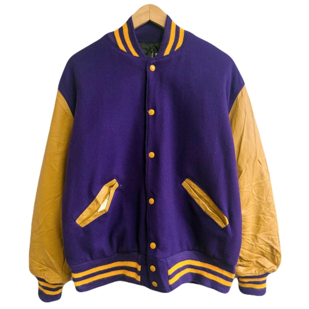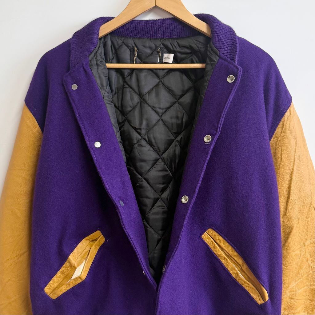 ウール×レザー風 切り替えデザイン スタジャン リブライン スナップボタン 良色 パープル×イエロー Mサイズ No.M309