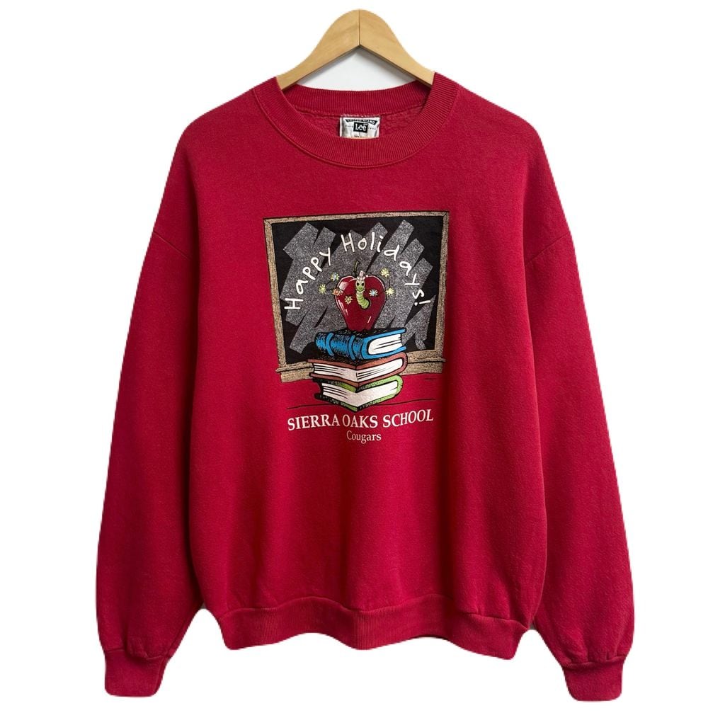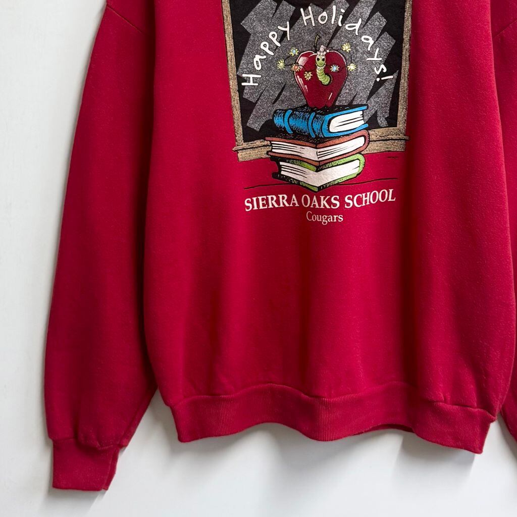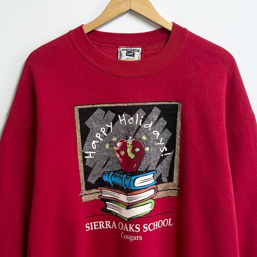 90's vintage ビンテージ USA製 Lee リー フロントプリント りんご イモムシ 本 黒板 アメカジ トレーナー スウェット 裏起毛 赤 レッド Lサイズ No.M318