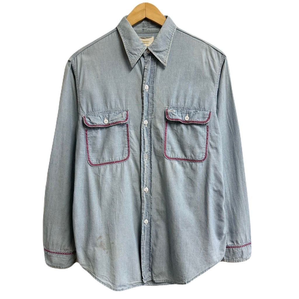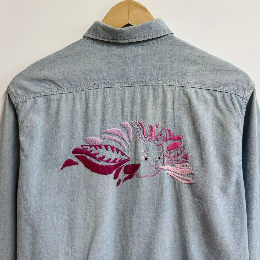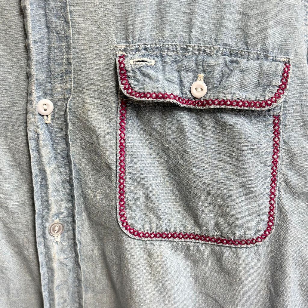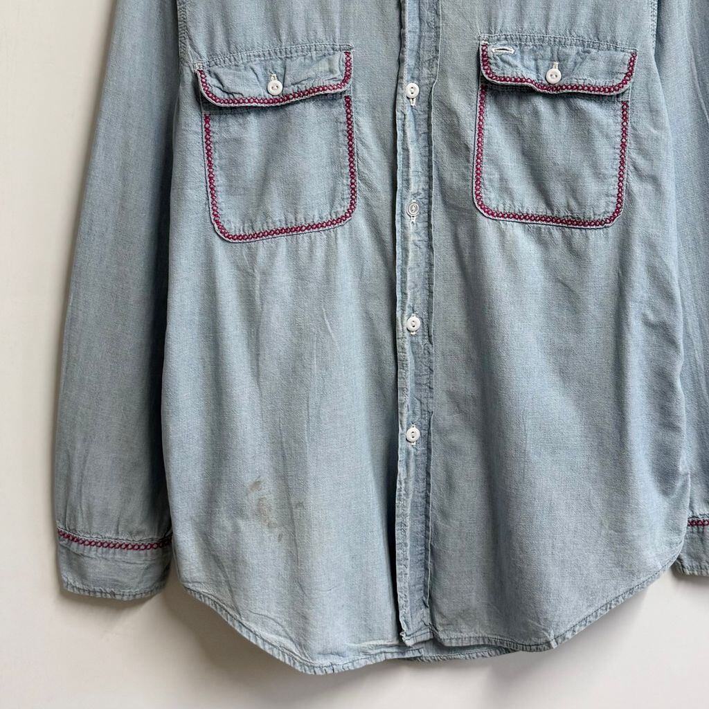 BIG MAC ビッグマック シャンブレーシャツ 花 モチーフ アート 刺繍 コットンシャツ ポケット付き 長袖シャツ ライトブルー 青 Mサイズ No.M319