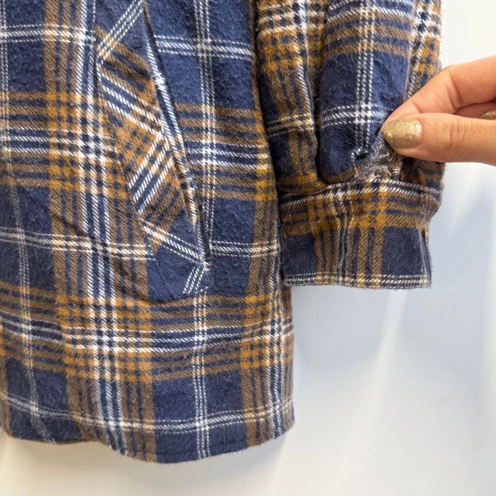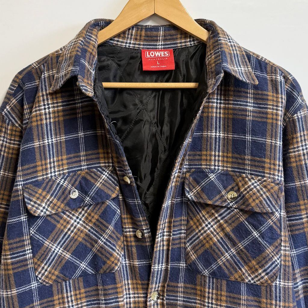 LOWES シャツジャケット キルティング裏地 コットンシャツ チェック柄 ポケット付き 厚手長袖シャツ 紺×白×茶 Lサイズ No.M347