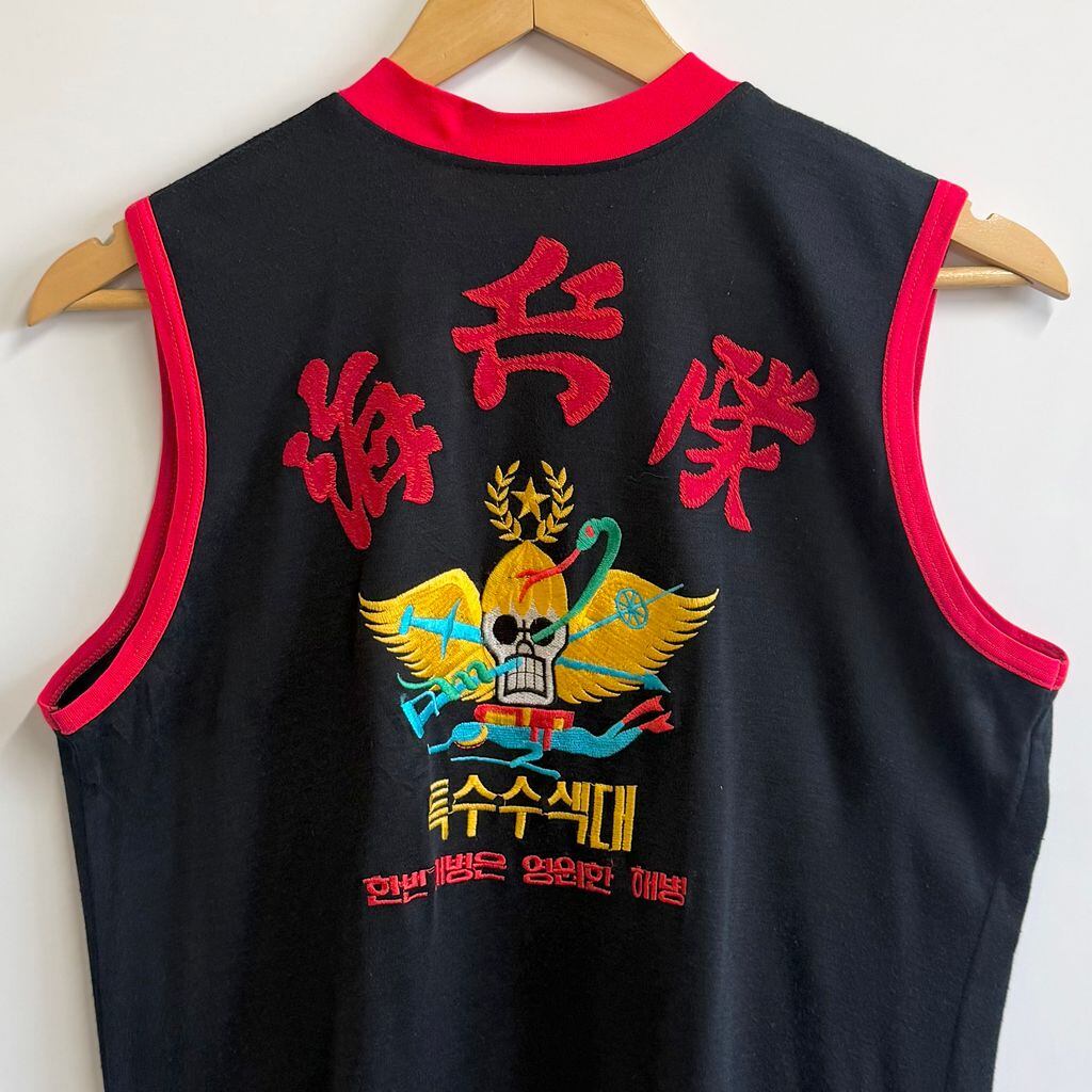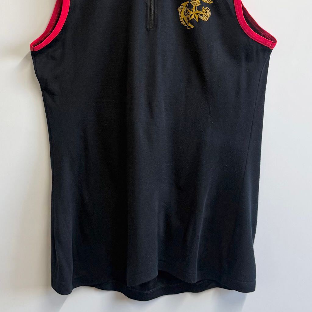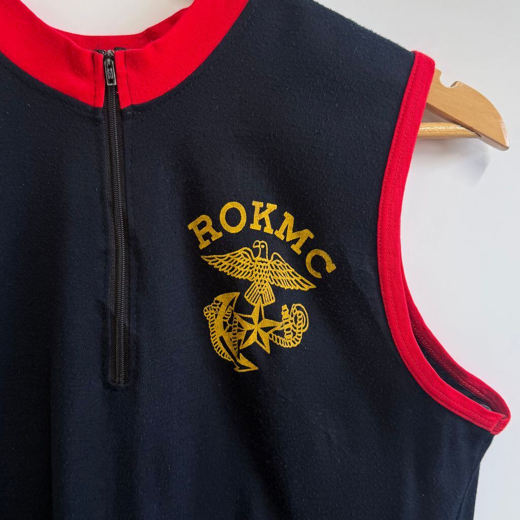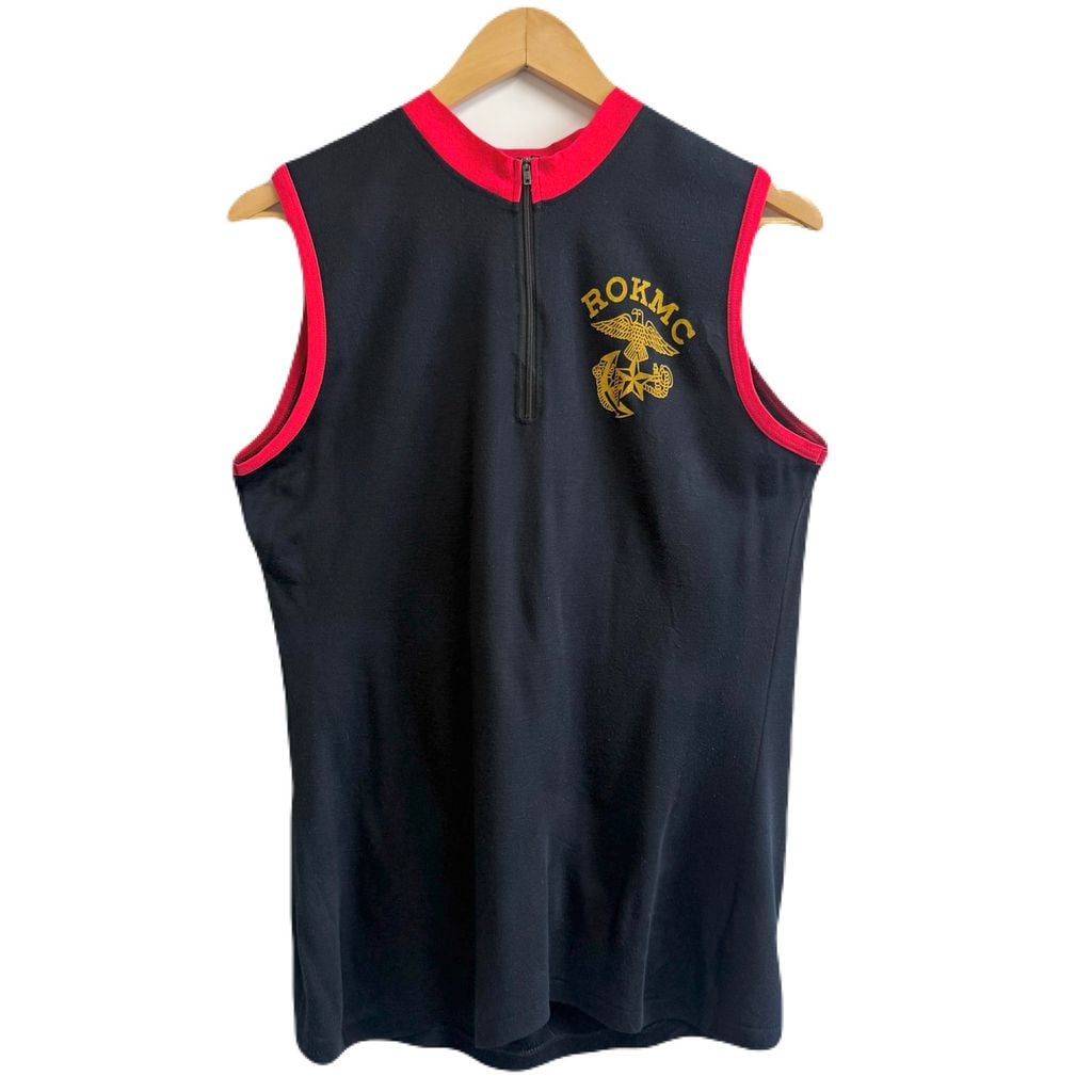 ROKMC エンブレム ミリタリー ノースリーブタンクトップ ハーフジップ スカル 翼 刺繍 紺×赤 No.M391