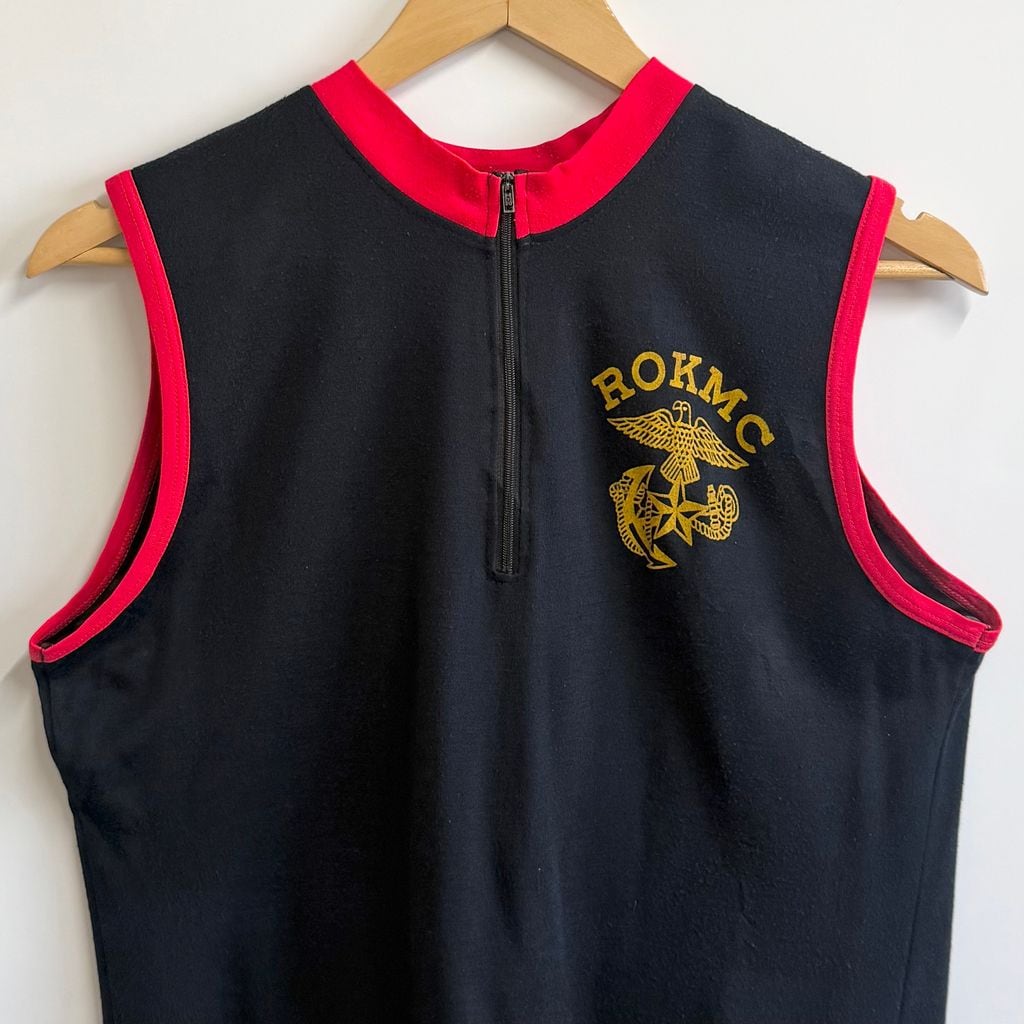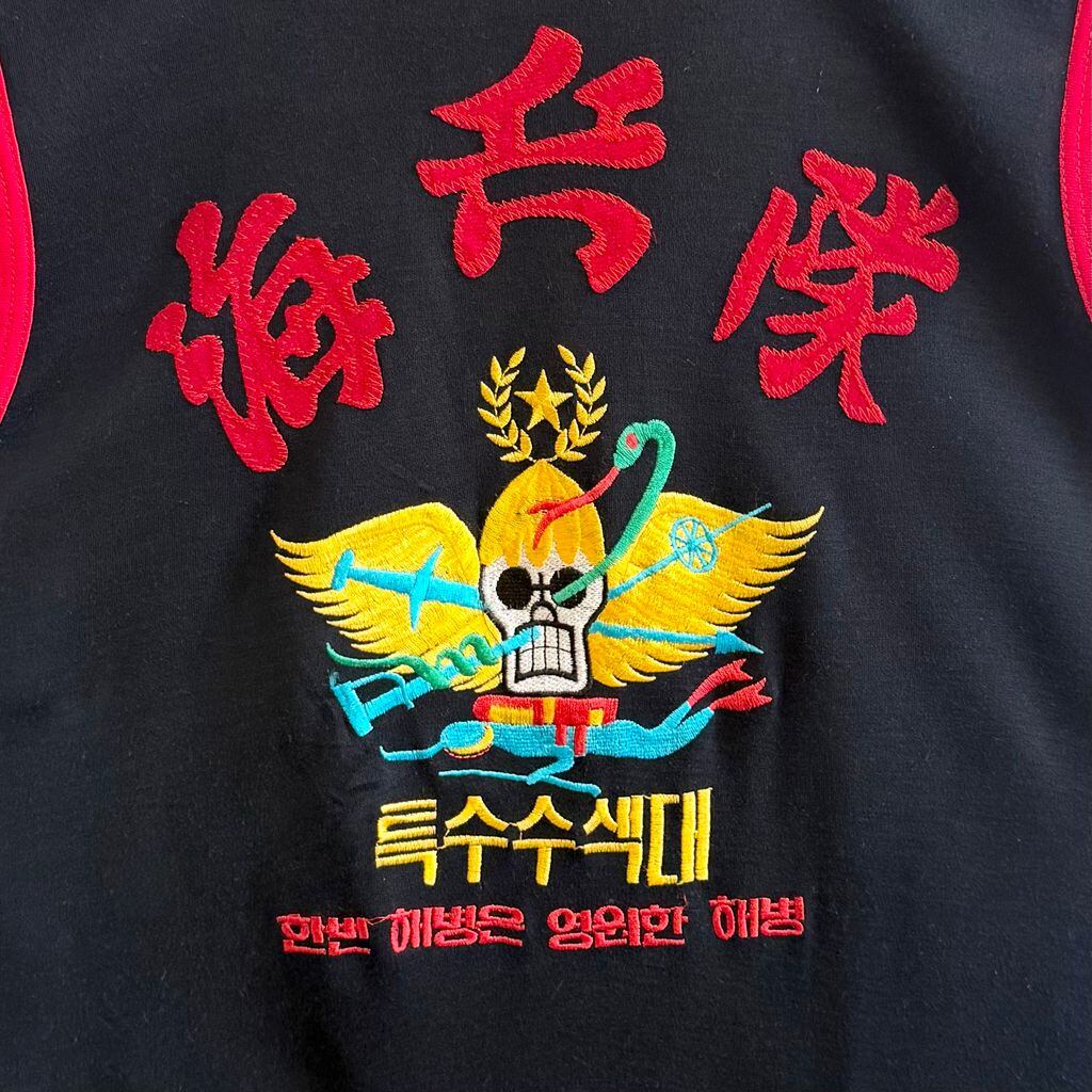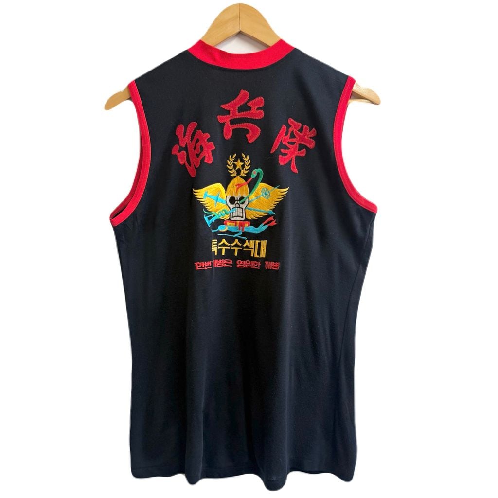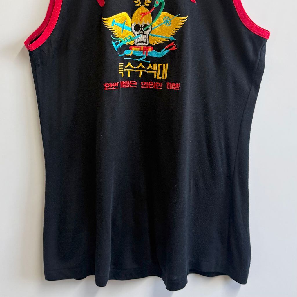 ROKMC エンブレム ミリタリー ノースリーブタンクトップ ハーフジップ スカル 翼 刺繍 紺×赤 No.M391