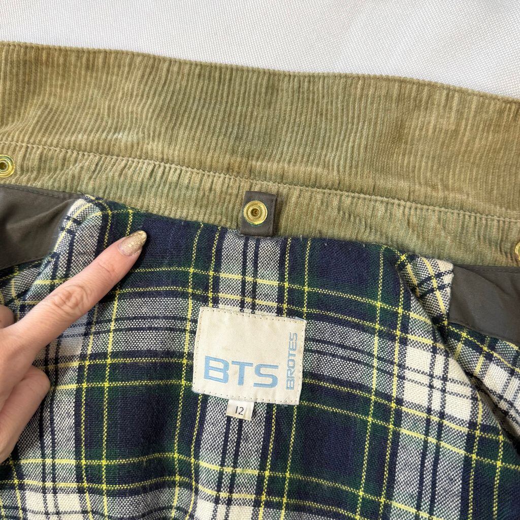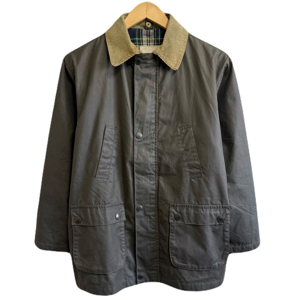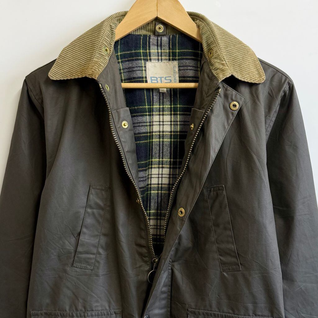 BTS オイルドジャケット 襟コーデュロイ 裏地チェック柄 スナップボタン×フルジップ ダークグリーン カーキ系 サイズ12 No.M410