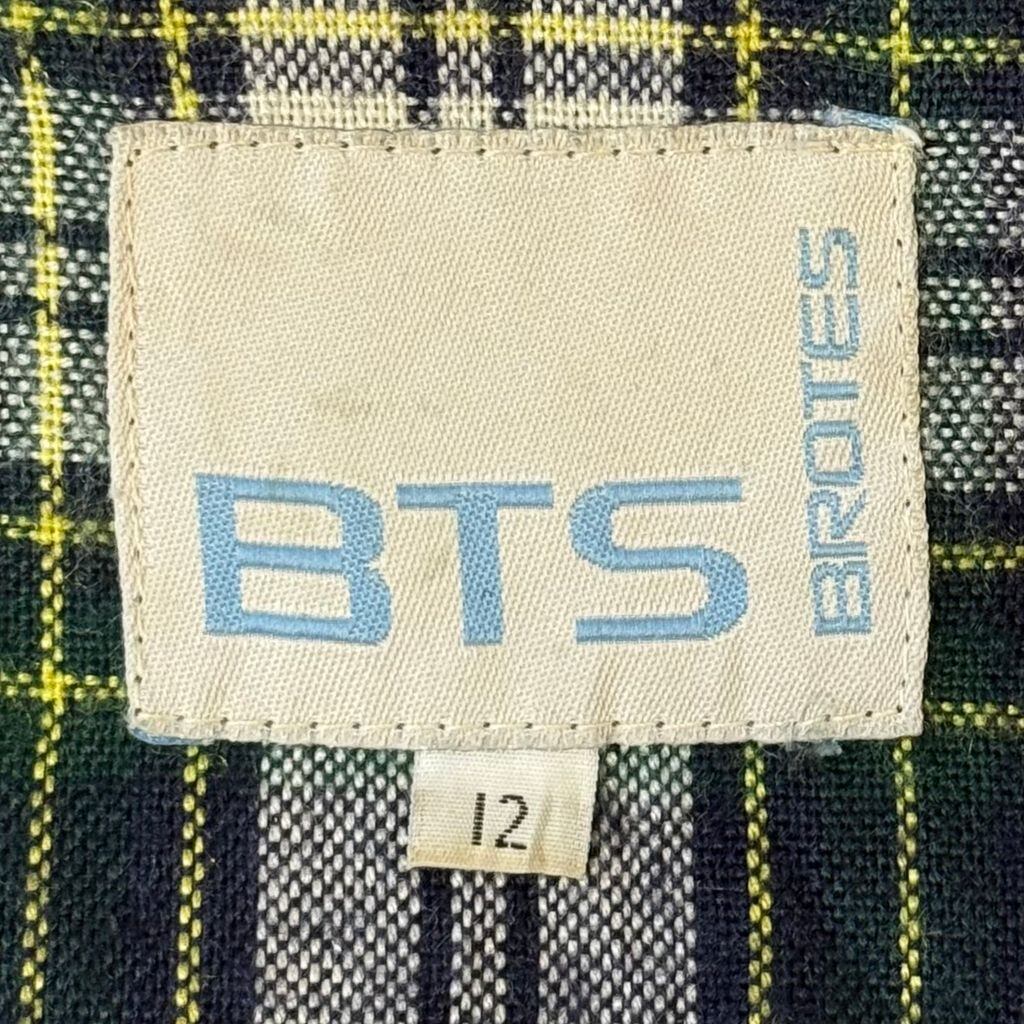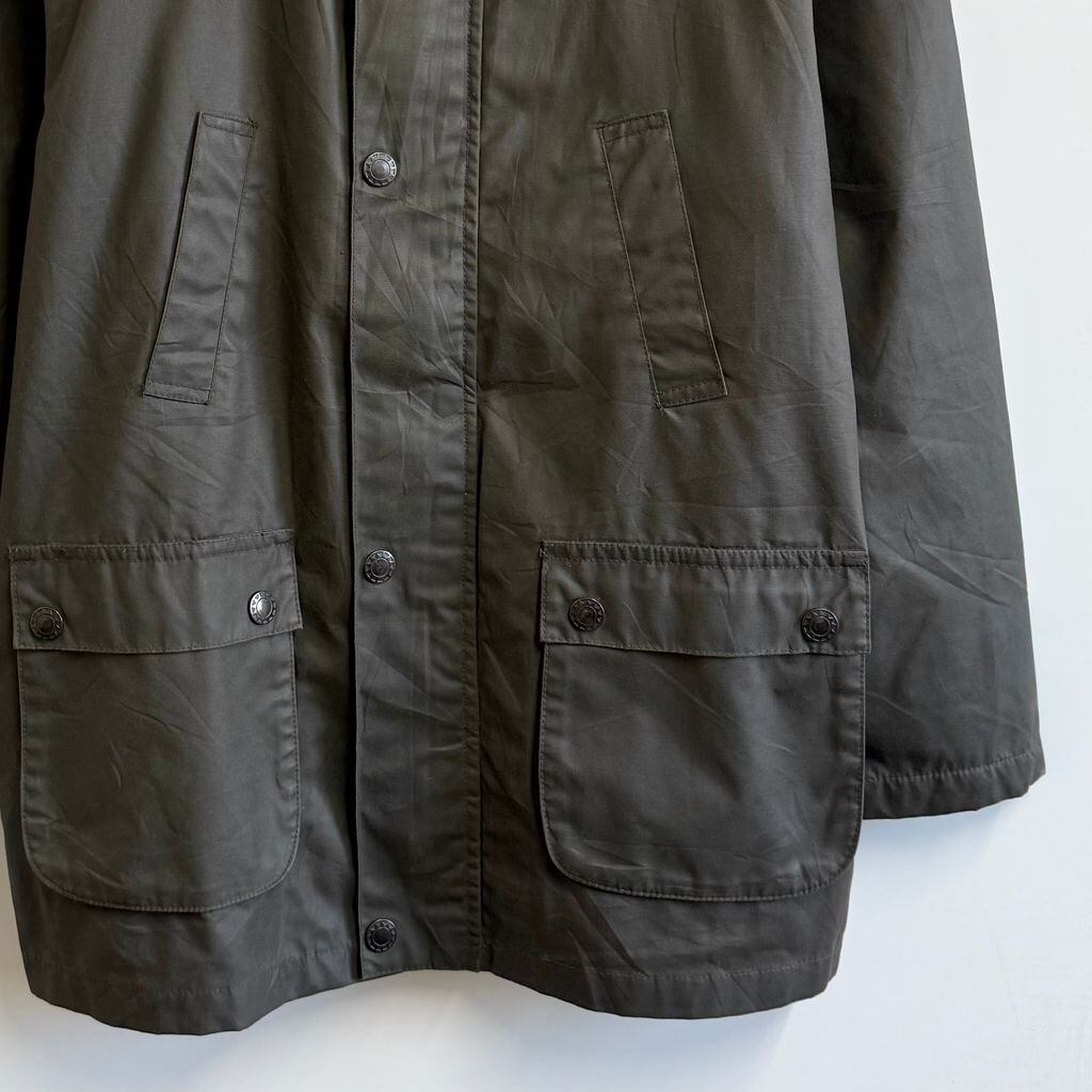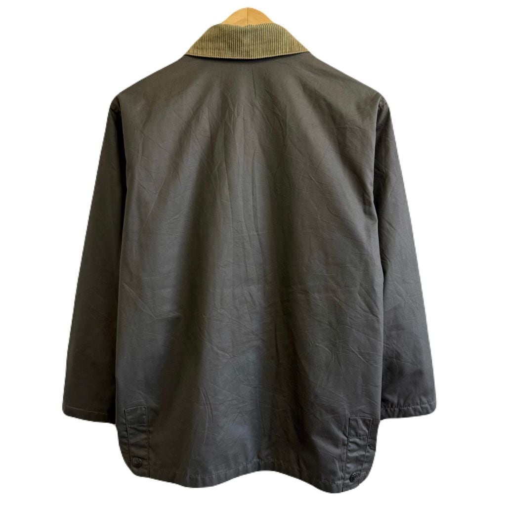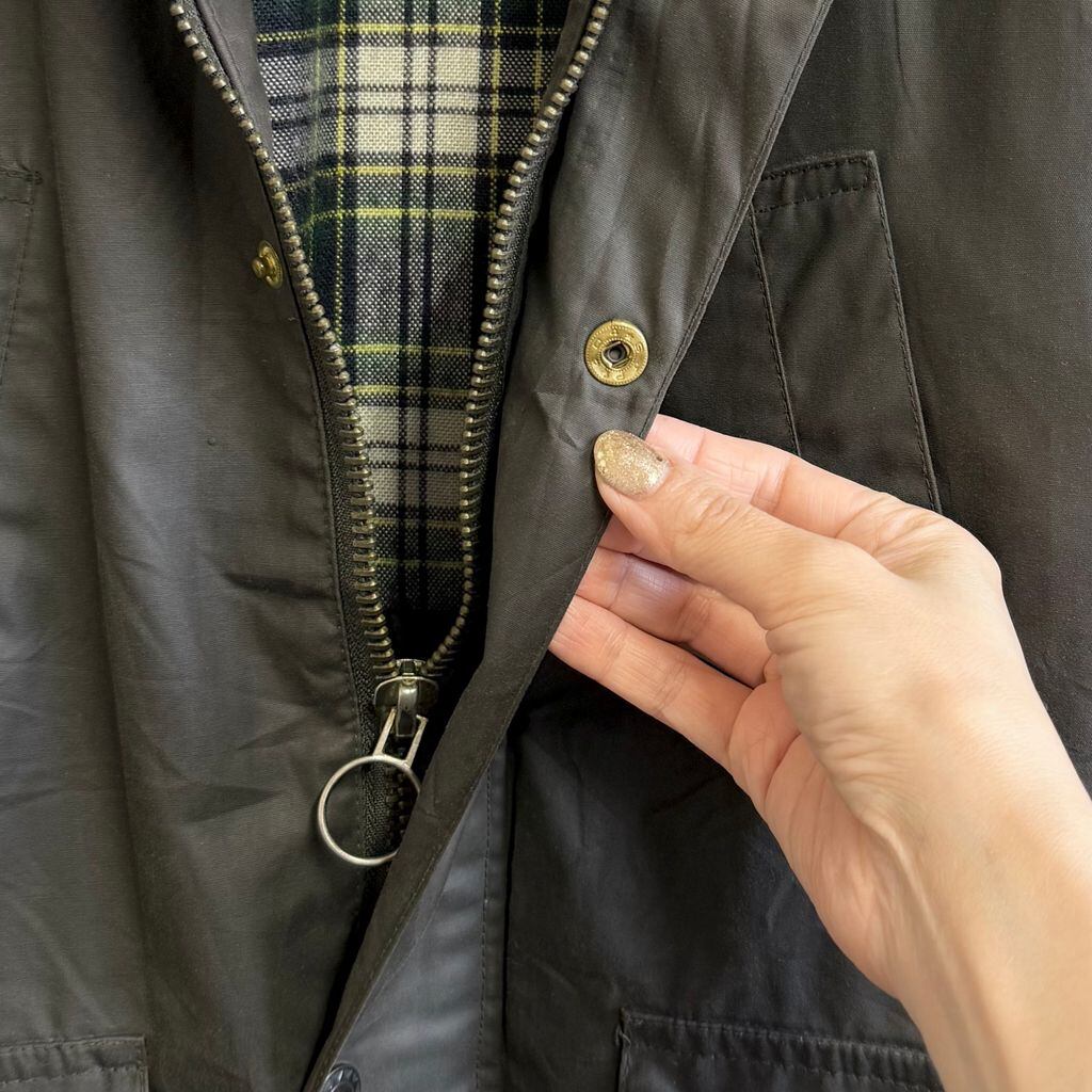 BTS オイルドジャケット 襟コーデュロイ 裏地チェック柄 スナップボタン×フルジップ ダークグリーン カーキ系 サイズ12 No.M410