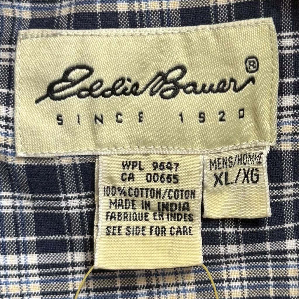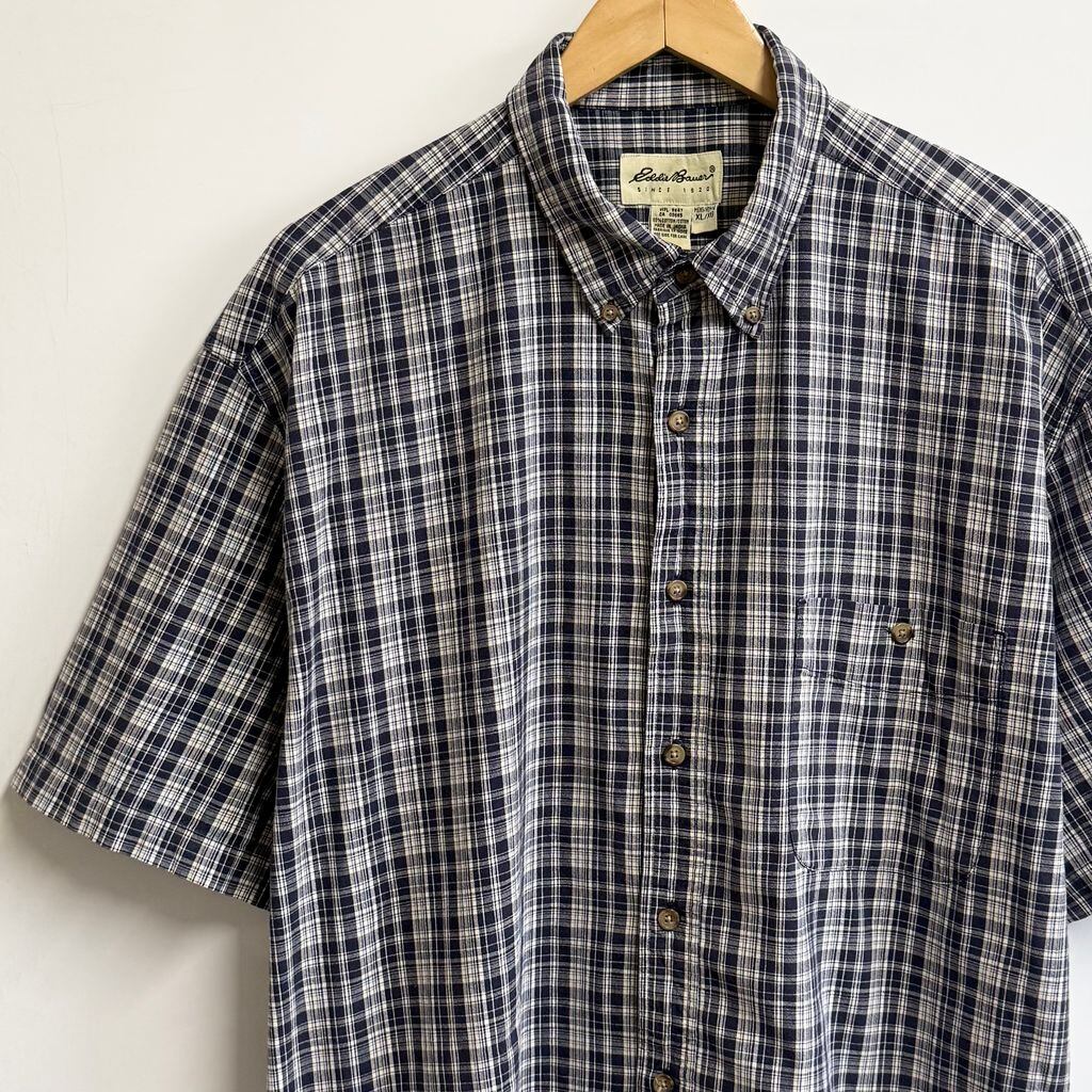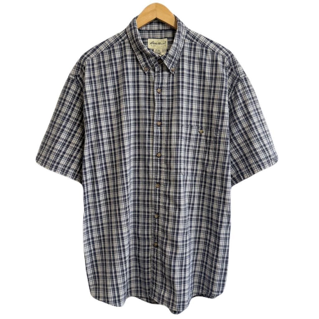 Eddie Bauer エディーバウアー ボタンダウンシャツ コットンシャツ チェック柄 ポケット付き 半袖シャツ 紺×白×多色 XLサイズ No.M453