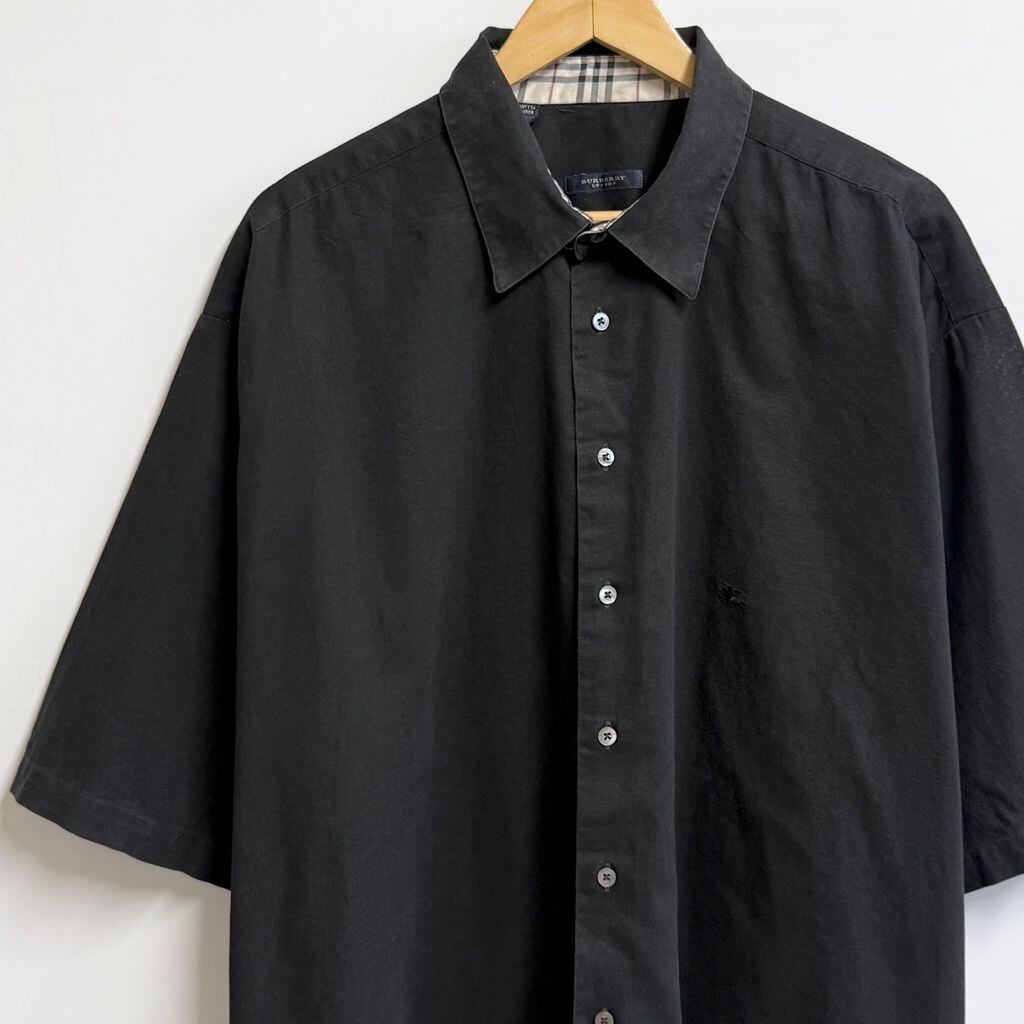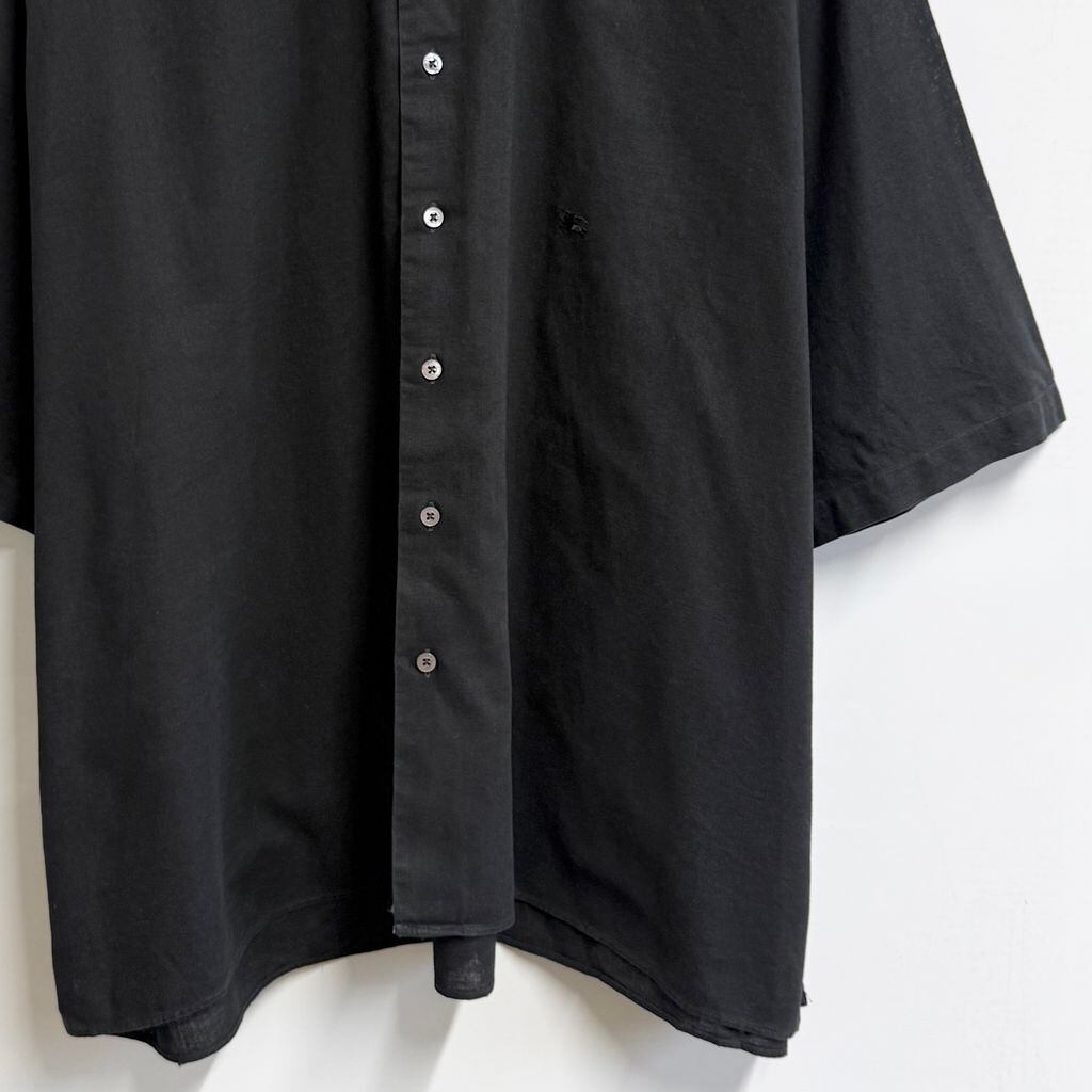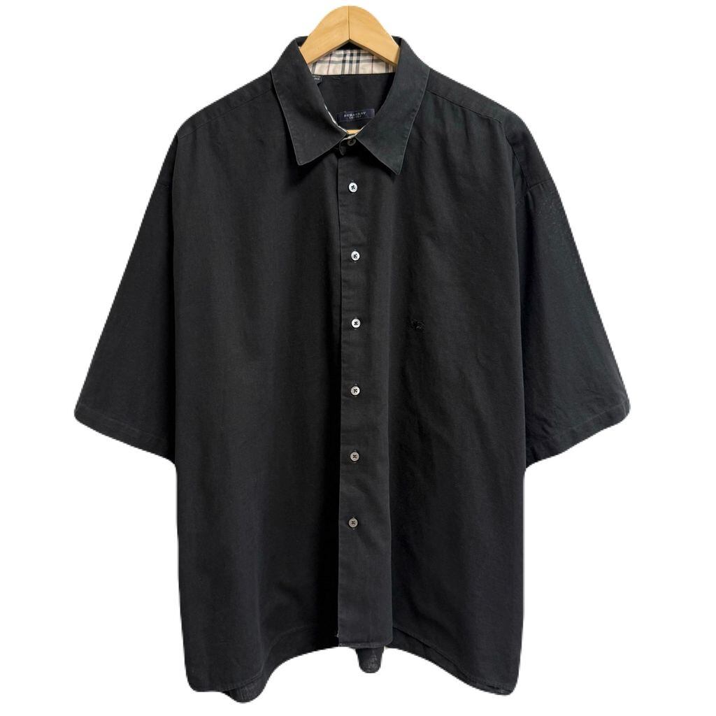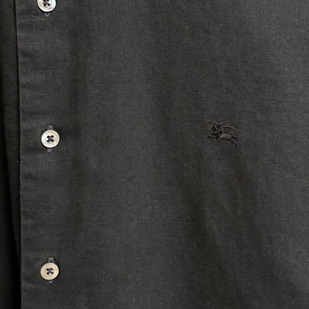 USA製 BURBERRY LONDON バーバリーロンドン コットン×リネンシャツ ワンポイントロゴ 刺繍 半袖シャツ 黒 ブラック XXLサイズ No.M456