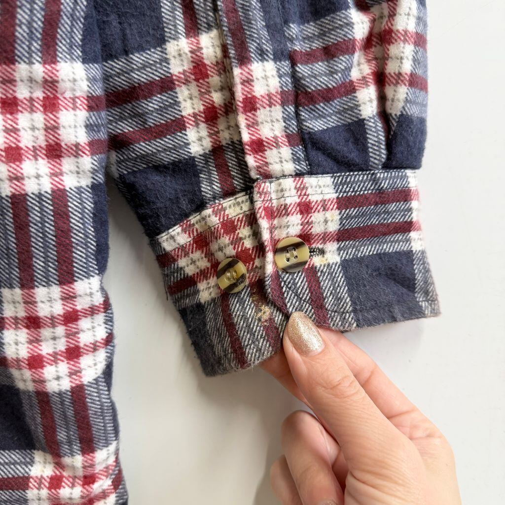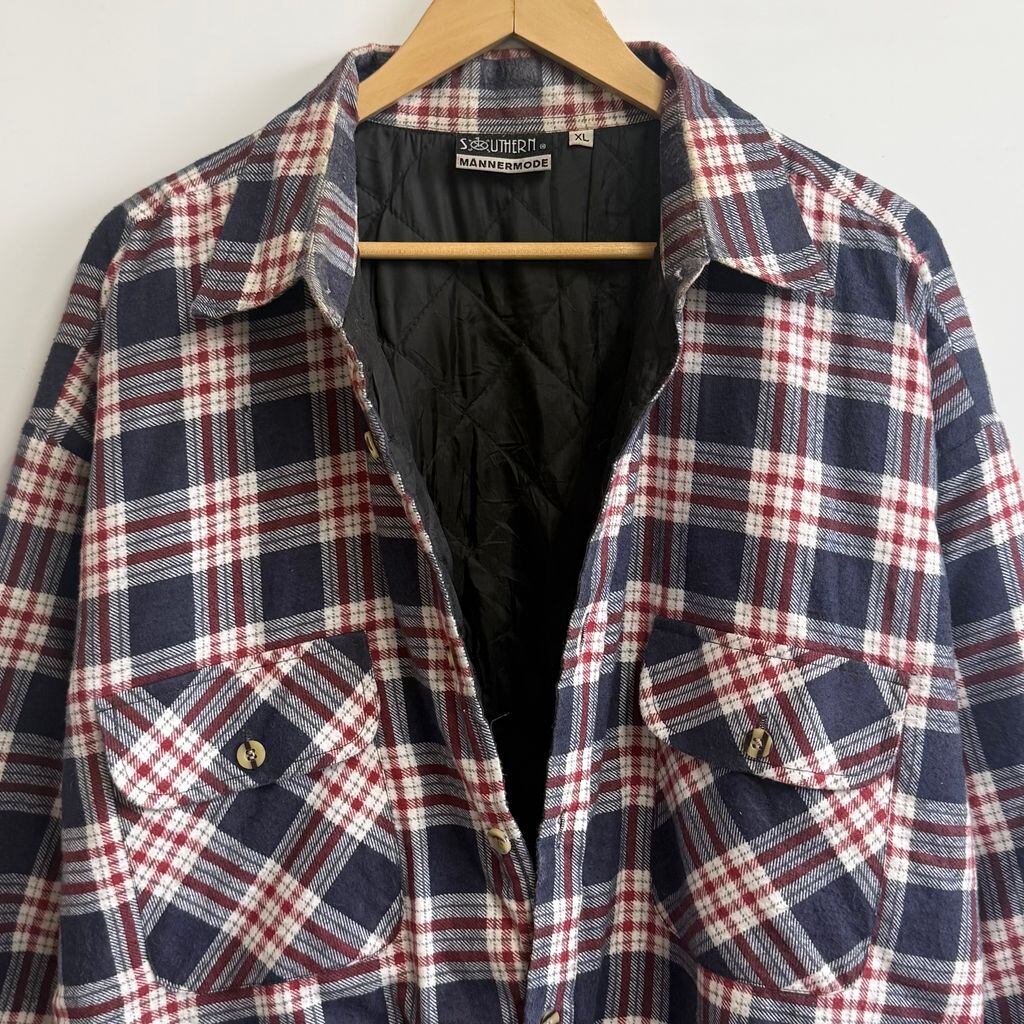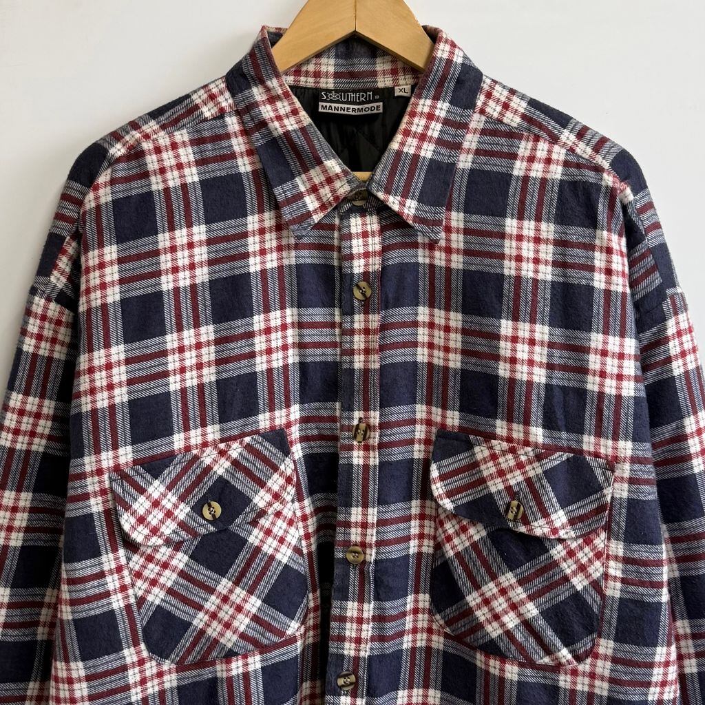 フランネルシャツジャケット キルティング裏地 コットンシャツ チェック柄 ポケット付き 厚手長袖シャツ 紺×白×多色 XLサイズ No.M525
